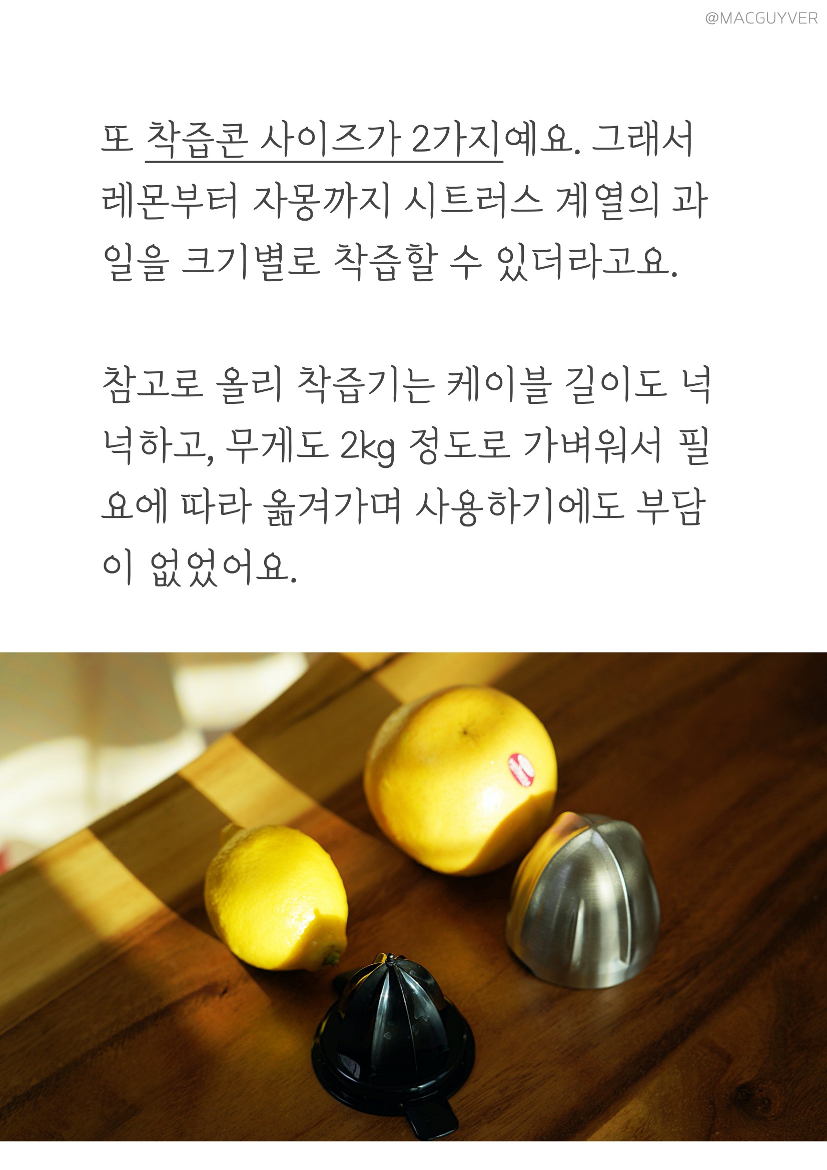 디자인을 보면 심플한데다 포인트가 되는 로고도 무난하면서 세련된 느낌인데요. 컬러감이나 분위기가 차분해서 어느 곳에 놓아도 안정적이었어요. 매트한 재질의 손잡이도 각진 곳 없이 부드럽게 마감이 되어 있으니까 그립감도 좋더라고요. 세척도 빼놓을 수 없는데요. 올리 과일착즙기는 과일이 직접 닿는 모든 부분을 분리할 수 있고, 윗부분도 가볍게 누르면 쏙 빠지니까 깨끗한 세척이 가능했습니다. 이렇게 분리가 가능하니까 기계 본체는 과즙에 물들거나 오염되지 않고 항상 새것처럼 유지할 있더라고요. 또 착즙콘 사이즈가 2가지예요. 그래서 레몬부터 자몽까지 시트러스 계열의 과일을 크기별로 착즙할 수 있더라고요. 참고로 올리 착즙기는 케이블 길이도 넉넉하고, 무게도 2kg 정도로 가벼워서 필요에 따라 옮겨가며 사용하기에도 부담이 없었어요.