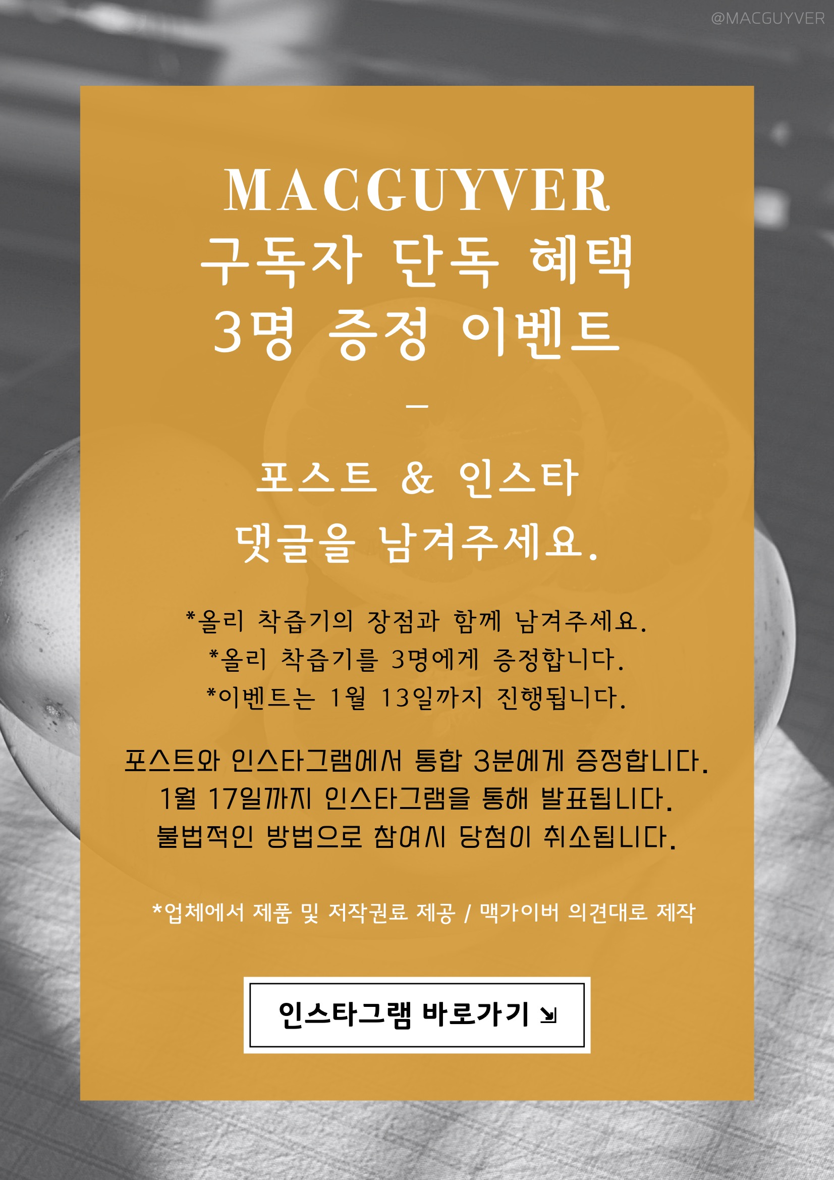요즘은 사시사철 레몬이나 오렌지, 자몽 같은 과일을 구입할 수 있어서 올리 스테인리스 착즙기도 언제나 사용이 가능하겠더라고요. 사계절 언제든 과일을 음료로 만들어주는 올리 과일착즙기도 유용한 제품이 될 것 같은데요. 영양소 파괴를 최소화하는 저속 착즙 방식이니까 맛도 좋고 영양도 챙길 수 있는 좋은 아이템이 아닐까 합니다. 3분에게 올리 착즙기를 증정해드리는 댓글 이벤트를 통해 이 제품을 직접 사용해 보실 수 있습니다. 맥가이버 인스타그램과 네이버 포스트에 이 쥬서기 제품의 장점과 함께 댓글을 남겨주세요. 이 제품에 대한 보다 상세한 스펙과 정보는 아래 배너를 통해 보실 수 있습니다.