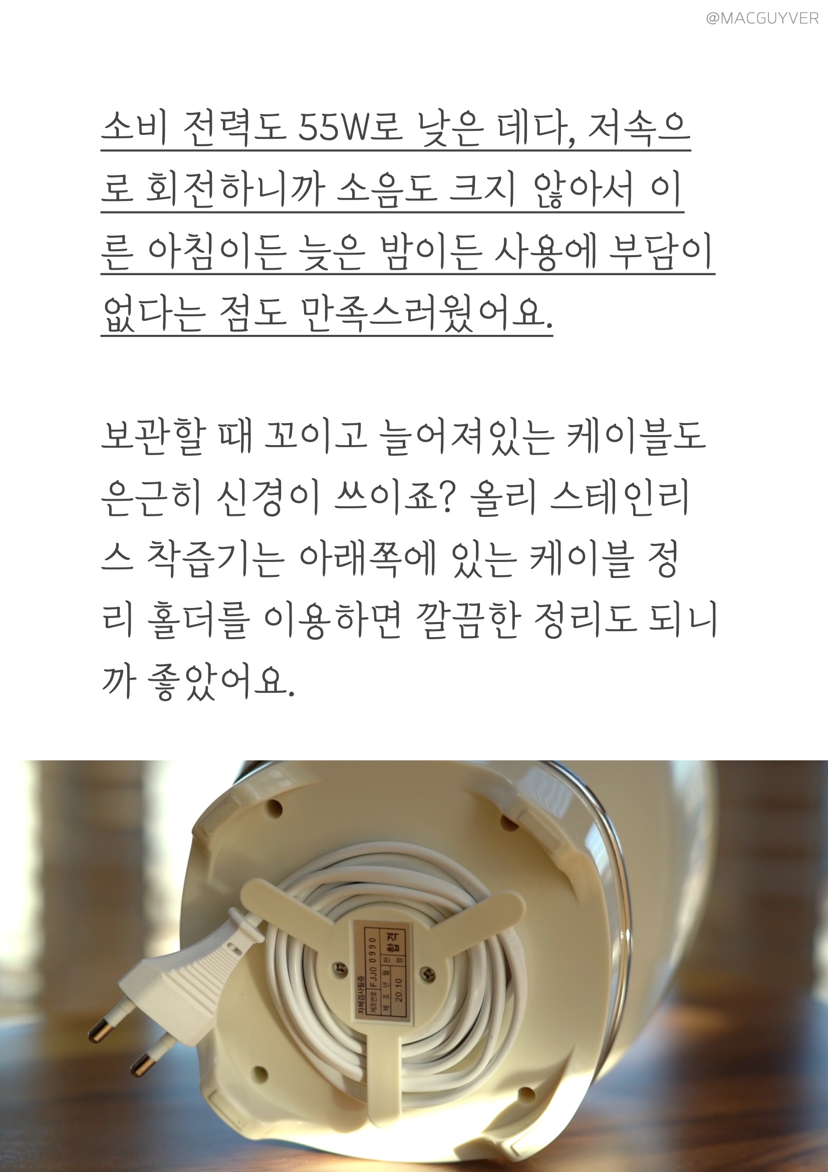이제 마무리를 해볼까요? 이런 주방 제품들의 사용 빈도가 점점 줄어드는 데는 복잡한 세척방법도 한 가지 이유가 된다는 거 사용하신 분들은 아마 공감하실 거예요. 올리 스테인리스 착즙기는 분리하고 조립하는 과정에 힘이 들어가지 않고, 또 사각지대 없이 구조가 심플하다 보니까 쥬서기 세척도 쉽고 건조도 빠르더라고요. 참고로, 이름에서처럼 착즙콘을 비롯해 과일이 닿는 부분에 스테인리스를 사용해서 더 안심이 되기도 했는데요. 쥬서기 소비 전력도 55W로 낮은 데다, 저속으로 회전하니까 소음도 크지 않아서 이른 아침이든 늦은 밤이든 사용에 부담이 없다는 점도 만족스러웠어요. 과일 원액기를 보관할 때 꼬이고 늘어져있는 케이블도 은근히 신경이 쓰이죠? 올리 스테인리스 착즙기는 아래쪽에 있는 케이블 정리 홀더를 이용하면 깔끔한 정리도 되니까 좋았어요.