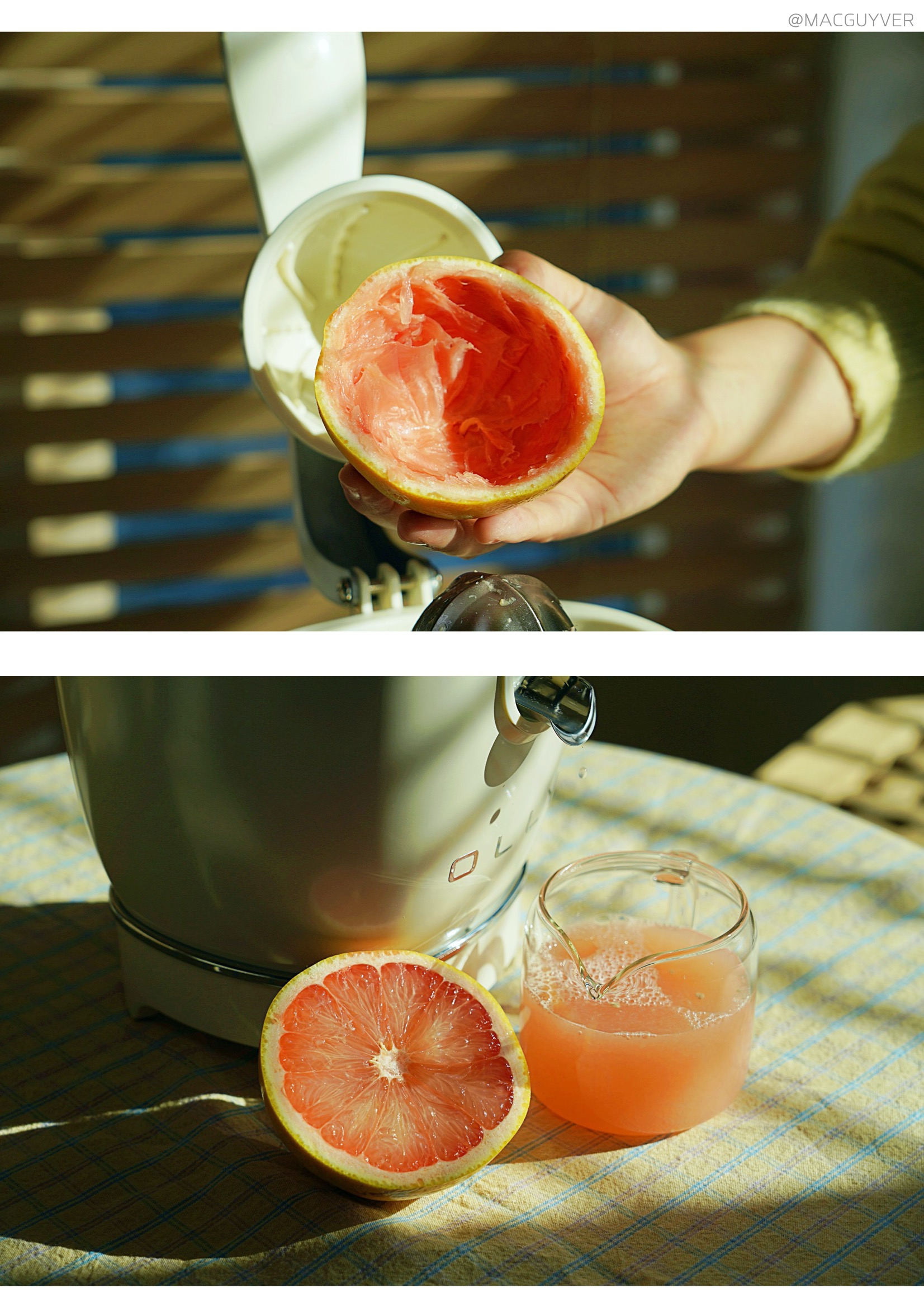 올리 스테인리스 착즙기로 레몬, 라임, 귤, 오렌지, 자몽 같은 과일을 착즙해봤어요. 일반적인 요리 재료로도 많이 쓰이는 레몬은 레몬착즙기를 이용해 샐러드드레싱부터 레몬에이드, 레몬 소주 같은 음료로도 즐길 수 있어서 가장 활용도가 높았던 것 같아요. 올리 과일착즙기로 착즙한 레몬즙을 얼려두면 탄산수를 부어서 언제든 레몬에이드를 마실 수 있고, 설탕이나 꿀과 섞어 레몬청으로 만들어두면 따뜻한 음료로도 즐길 수 있어요. 원액기로 오렌지 주스나 자몽 에이드도 신선한 과즙을 바로 마실 수 있다는 게 가장 큰 장점이었던 것 같아요. 덕분에 음료를 사서 먹기보다 직접 만들어 먹는 습관도 생겼는데요. 아마 과정이 번거로웠다면 착즙기 사용 빈도가 점점 줄었겠지만, 껍질을 벗기거나 손질하지 않아도 2등분만 하면 바로 착즙이 되니까 확실히 편하더라고요.
