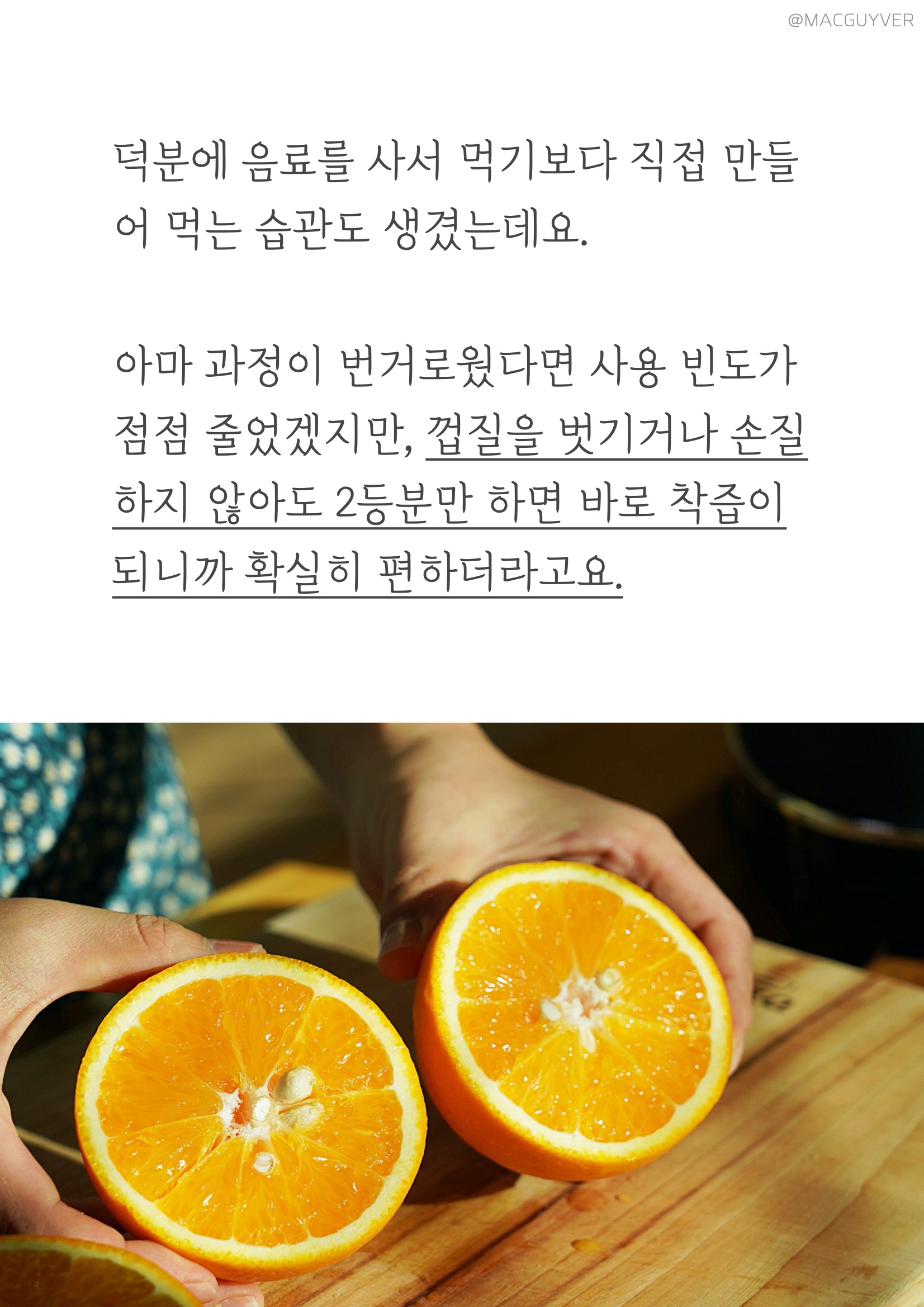 오늘은 바쁜 아침에 과일을 가볍게 잘라서 바로 착즙할 수 있고, 세척도 간편한 올리 스테인리스 착즙기를 소개해 드릴게요. 특히 건강과 식품, ABC쥬스같은 건강음료에 대한 관심이 많은 요즘, 이 제품도 유용한 아이템이 될 것 같은데요. 3분에게 올리 착즙기를 증정해드리는 이벤트도 함께 진행되니까 네이버 포스트와 맥가이버 인스타그램을 통해 참여하실 수 있습니다.