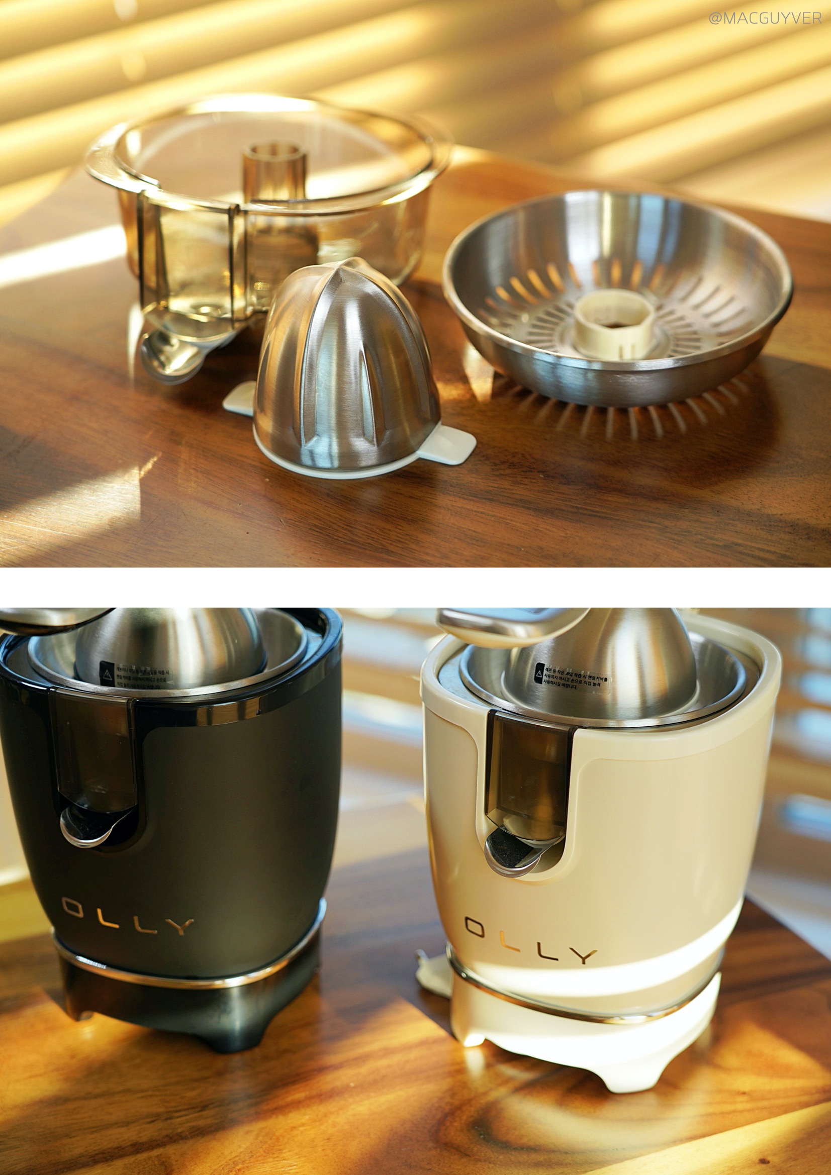디자인을 보면 심플한데다 포인트가 되는 로고도 무난하면서 세련된 느낌인데요. 컬러감이나 분위기가 차분해서 어느 곳에 놓아도 안정적이었어요. 매트한 재질의 손잡이도 각진 곳 없이 부드럽게 마감이 되어 있으니까 그립감도 좋더라고요. 세척도 빼놓을 수 없는데요. 올리 과일착즙기는 과일이 직접 닿는 모든 부분을 분리할 수 있고, 윗부분도 가볍게 누르면 쏙 빠지니까 깨끗한 세척이 가능했습니다. 이렇게 분리가 가능하니까 기계 본체는 과즙에 물들거나 오염되지 않고 항상 새것처럼 유지할 있더라고요. 또 착즙콘 사이즈가 2가지예요. 그래서 레몬부터 자몽까지 시트러스 계열의 과일을 크기별로 착즙할 수 있더라고요. 참고로 올리 착즙기는 케이블 길이도 넉넉하고, 무게도 2kg 정도로 가벼워서 필요에 따라 옮겨가며 사용하기에도 부담이 없었어요.