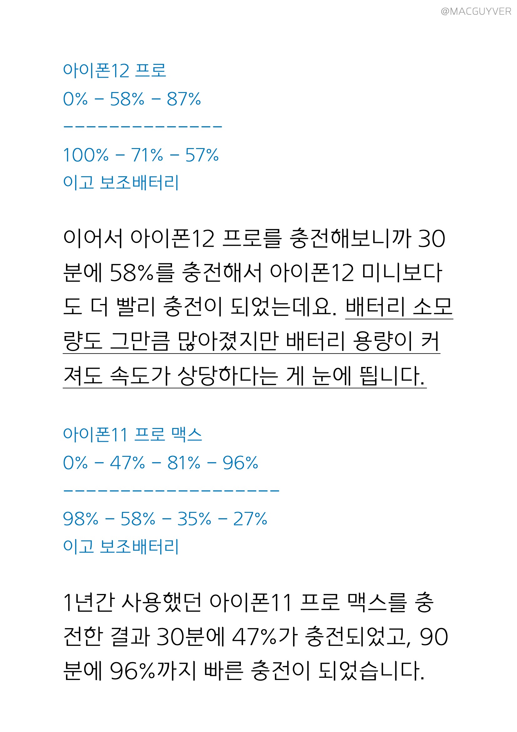 고속충전보조배터리 아이폰12 프로 맥스 : 7% - 24% A - 아이폰12 프로 맥스 : 0% - 16% 이고 보조배터리 : 57% - 36% 아이폰11 프로 맥스 : 0% - 19% - 35% - 51% - 72% C - 갤노트10+ : 0% - 34% - 65% - 95% - 100% 이고 보조배터리 : 100% - 68% - 37% - 4% - 1% 다음으로, 아이폰12 프로 맥스 2대를 자체 라이트닝과 A타입 케이블로 연결해보니까 이 정도 속도를 보여줬는데요. 갤노트와 함께 연결해서 충전해보니까 C타입에 충전 속도를 몰아주면서 갤노트가 빠르게 완충되었고, 아이폰11 프로 맥스는 72%까지 충전이 되었습니다. 아이폰12 프로 맥스 : 0% - 17% - 32% - 47% - 61% 무선 - 아이폰12 프로 : 0% - 16% - 33% - 50% - 65% 이고 보조배터리 : 100% - 83% - 66% - 47% - 29% 이어서 자체 PD 라이트닝 케이블과 무선 충전으로 아이폰을 충전해봤습니다. 2대 이상 충전할 때는 PD 충전의 속도가 줄어들어서 무선과 비슷한 속도를 보여주더라고요. 심지어 무선이 조금 더 빠른 것 같기도 하지만, 아이폰12 프로와 맥스의 배터리 용량 차이 때문이 아닐까 합니다.