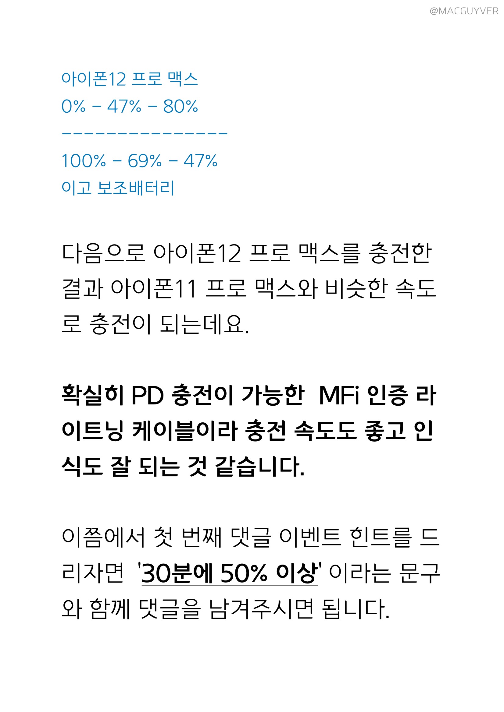 고속충전보조배터리 아이폰12 미니 : 0% - 27% A 아이폰12 미니 : 0% - 22% 자체 충전 : 30% - 29% 다음으로 조금 독특한 테스트를 해봤습니다. 보조배터리를 충전하면서 다른 기기를 충전해 줄 수 있는지 연결해봤는데요. 3대 이상부터는 2대까지만 인식해서 2대를 연결해보니까 보조배터리는 오히려 1%가 줄었지만 아이폰은 제법 빠르게 충전을 해주더라고요. 그러니까, 연결된 기기를 우선으로 충전해 주는 제법 합리적인 구조로 설계가 된 것 같습니다. 애플 충전기 0% - 24% - 46% - 69% - 85% 0% - 27% - 52% - 76% - 99% 마지막으로, PD 충전을 통해 자체 충전을 해봤는데요. 보조배터리만 연결해서 충전한 결과 충전기에 따라 편차가 있지만 대략 2시간에서 2시간 30분 정도에 완충이 되었습니다. 조금만 더 빨랐으면 싶기도 했지만 나름 퍼포먼스는 괜찮게 나오더라고요. 전체 정리를 해보자면, 자체 충전은 기대했던 것처럼 엄청 빠르지도 또 엄청 느리지도 않아요. 싱글은 아이폰이 체감상 더 빠른 편이고, 무선 충전도 최대 퍼포먼스가 나옵니다. A타입도 나름 속도가 괜찮은 데다 어떤 방식의 듀얼이든 쿼드 충전이든 맥시멈 22.5W 출력을 고르게 나눠서 충전을 잘 해주는 보조배터리라고 평가가 가능할 것 같습니다. 마지막 힌트는 ‘최대 22.5W 충전’ 함께 댓글을 남겨주시면 됩니다.