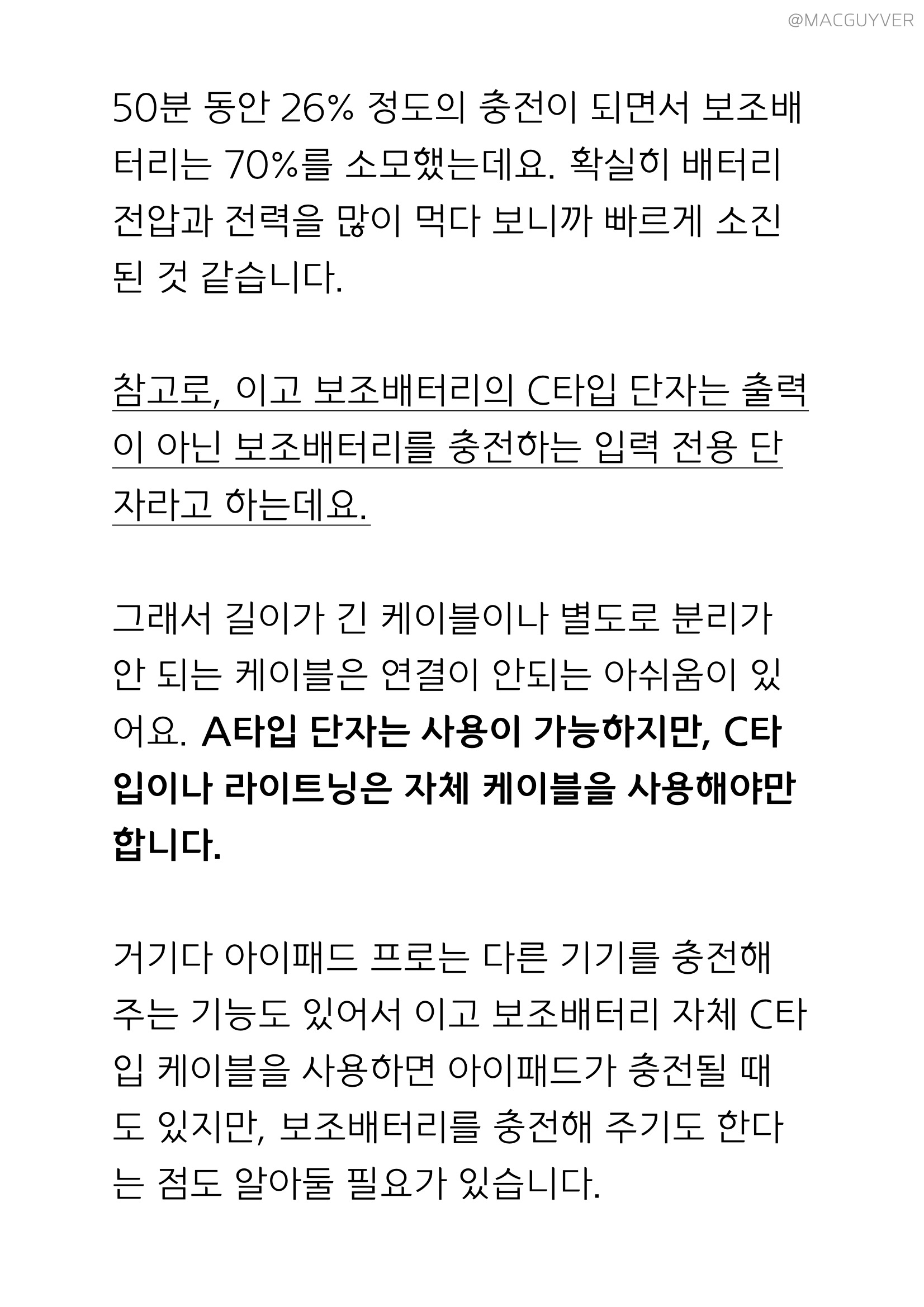 아이폰 보조배터리 이고 아이패드 프로 12.9 4세대 5% - 19% - 31% ------------ 70% - 38 - 0% 이고 보조배터리 이어서 이고 얼라이딜리버리 보조배터리 자체 C타입 케이블로 연결해서 동일하게 80% 화면 밝기로 문서, PDF 작업을 해보니까 다행히 충전이 되더라고요. 50분 동안 26% 정도의 충전이 되면서 보조배터리는 70%를 소모했는데요. 확실히 배터리 전압과 전력을 많이 먹다 보니까 빠르게 소진된 것 같습니다. 참고로, 애플 충전기 이고 보조배터리의 C타입 단자는 출력이 아닌 보조배터리를 충전하는 입력 전용 단자라고 하는데요. 그래서 길이가 긴 케이블이나 별도로 분리가 안 되는 케이블은 연결이 안되는 아쉬움이 있어요. A타입 단자는 사용이 가능하지만, C타입이나 라이트닝은 자체 케이블을 사용해야만 합니다. 거기다 아이패드 프로는 다른 기기를 충전해 주는 기능도 있어서 이고 보조배터리 자체 C타입 케이블을 사용하면 아이패드가 충전될 때도 있지만, 보조배터리를 충전해 주기도 한다는 점도 알아둘 필요가 있습니다.