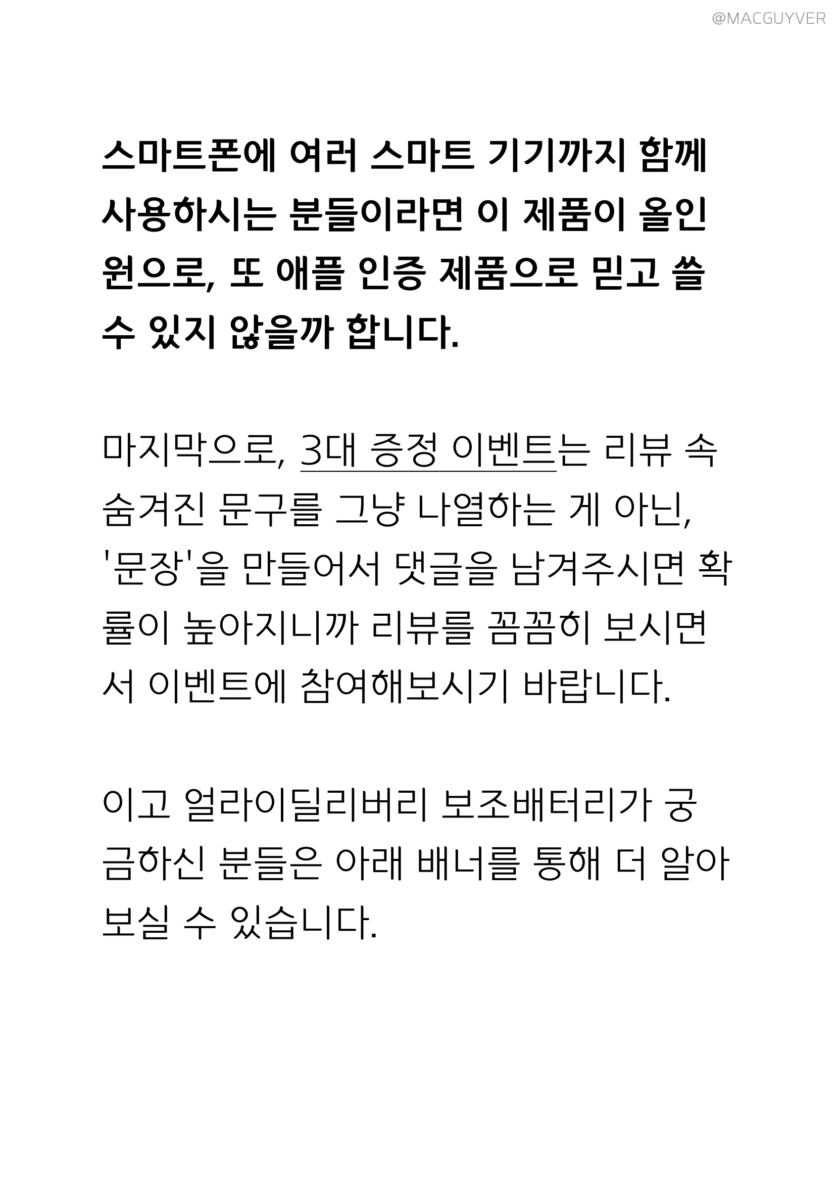 일체형 케이블 디자인에 애플 MFi 인증까지 받은 애플제품의 보조배터리, 싱글부터 듀얼, 트리플, 쿼드 4대 동시 충전까지 가능한 보조배터리를 사용해봤습니다. 무선 보조배터리추천 이고 얼라이 딜리버리 보조배터리는 과연 어떤 제품인지 궁금하셨던 분들이라면 이번 무선 보조 배터리추천 리뷰에 집중해 주세요. 또한 3분에게 증정해드리는 이벤트가 포스트 및 인스타, 유튜브에서 동시에 진행되기 때문에 이벤트 참여도 가능합니다.