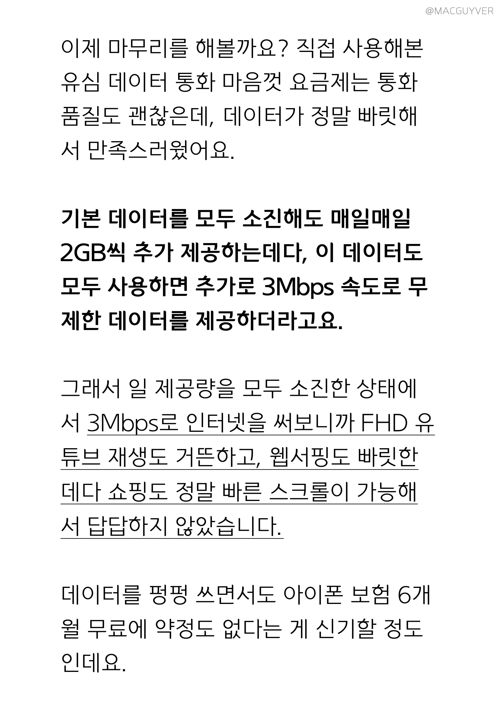 알뜰폰 추천 이제 마무리를 해볼까요? 직접 사용해본 유심 데이터 통화 마음껏 요금제는 통화 품질도 괜찮은데, 데이터가 정말 빠릿해서 만족스러웠어요. 알뜰폰 기본 데이터를 모두 소진해도 매일매일 2GB씩 추가 제공하는데다, 이 데이터도 모두 사용하면 추가로 3Mbps 속도로 무제한 데이터를 제공하더라고요. 그래서 일 제공량을 모두 소진한 상태에서 3Mbps로 인터넷을 써보니까 FHD 유튜브 재생도 거뜬하고, 웹서핑도 빠릿한데다 쇼핑도 정말 빠른 스크롤이 가능해서 답답하지 않았습니다. 유플러스 알뜰모바일 데이터를 펑펑 쓰면서도 아이폰 보험 6개월 무료에 약정도 없다는 게 신기할 정도인데요. 이제는 많은 분들께서 알뜰폰 서비스도 통신 3사의 통신망을 그대로 사용해서 품질이 똑같다는 것도 많이들 아실 것 같아요. 아이폰 알뜰폰, 그래서 자급제와 알뜰폰이 꿀조합이라는 것도 공식처럼 불리고 있는데요. 실제로도 아이폰12 시리즈의 사전예약에서 자급제 모델은 1분 정도 만에 완판될 정도라서 인기가 엄청나기도 했습니다. 무엇보다 유플러스 알뜰모바일은 다양한 구매 혜택까지 받을 수 있으니까, 약정이나 위약금 고민 없이 맘 편한 아이폰 라이프를 원하는 분들이라면 유플러스 알뜰모바일을 알아보시는 것도 좋을 것 같습니다. 앞서 소개 드린 댓글 알뜰폰 요금제 이벤트는 포스트와 영상 속에 숨겨진 문구로 '문장'을 만들어서 댓글을 남겨주시면 당첨 확률이 높아지니까 꼭 문장으로 여러분만의 이야기를 남겨주세요. 그리고 이벤트에 참여하실 때 이메일 주소도 꼭 남겨주시기 바랍니다. 오늘 소개해드린 유플러스 알뜰모바일이 궁금하신 분들은 아래 배너를 통해 더 알아보실 수 있습니다.