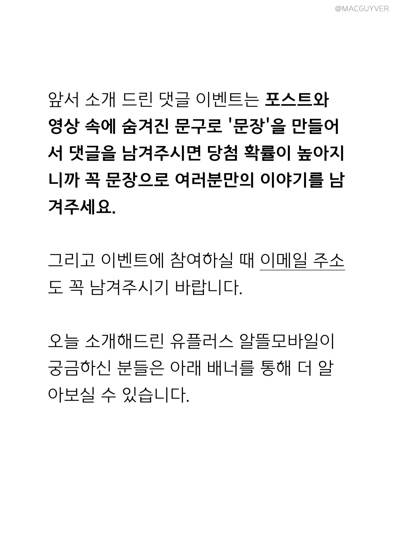 역대급 알뜰폰 서비스와 역대급 이벤트 소식을 함께 가져왔습니다. 아이폰12 미니를 비롯해 아이폰12 시리즈를 구입하신 분들이나, 아이폰을 사용중인 모든 분들에게 유용한 소식인데요. 에어팟 프로를 3분에게 증정해드리는 유플러스 알뜰모바일 이벤트가 진행되기 때문에 유플러스 알뜰모바일의 지원으로 제작된 이번 포스트 댓글 이벤트에 참여해보세요. 우선, 아이폰12를 구입하신 분들은 오랜만에 앱스토어에서 앱도 다운받고, 유튜브로 영상도 마음껏 시청하고, 또 게임도 좀 즐겨보실 것 같아요. 그런데 여기에 에어팟 프로를 더하고, 괜찮은 알뜰폰 서비스를 더하면 더욱 만족스러운 아이폰 라이프를 경험할 수 있는데요. 품질은 똑같지만 최대 반값으로 쓸 수 있어서 자급제와 알뜰폰의 조합이 최고라는 평가가 많기 때문입니다. 그래서 유플러스 알뜰모바일에서 아낌없는 지원을 해주셔서 알뜰한 아이폰 사용 꿀팁과 함께 에어팟 프로 3대 증정 이벤트를 함께 진행해볼 예정입니다. 당첨 확률을 높이는 방법은 간단한데요. 힌트가 숨겨진 포스트를 유심히 살펴보시면서 힌트와 함께 댓글을 남겨주시면 됩니다.
