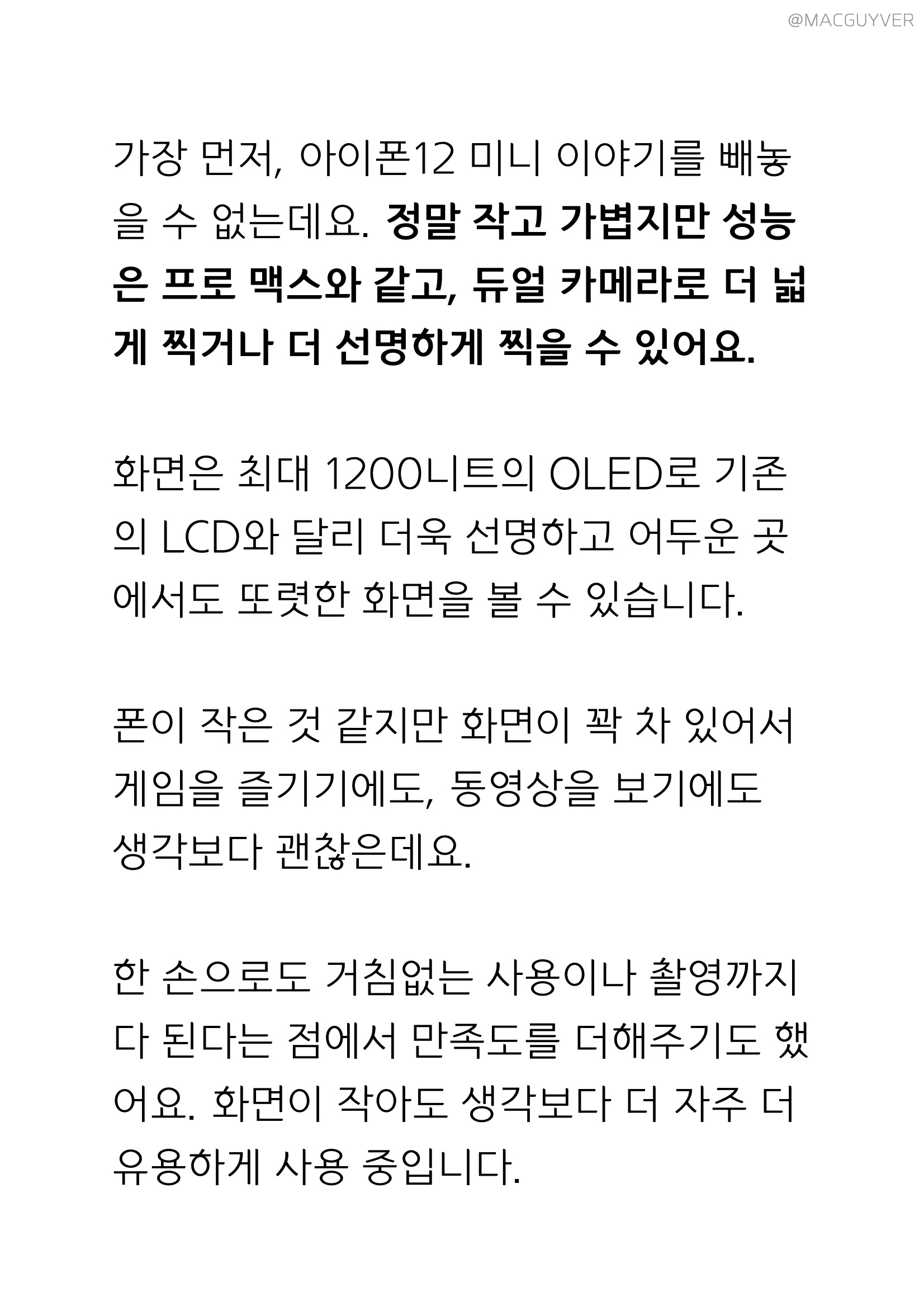 알뜰폰 추천 가장 먼저, 아이폰12 미니 이야기를 빼놓을 수 없는데요. 정말 작고 가볍지만 성능은 프로 맥스와 같고, 듀얼 카메라로 더 넓게 찍거나 더 선명하게 찍을 수 있어요. 화면은 최대 1200니트의 OLED로 기존의 LCD와 달리 더욱 선명하고 어두운 곳에서도 또렷한 화면을 볼 수 있습니다. 폰이 작은 것 같지만 화면이 꽉 차 있어서 게임을 즐기기에도, 동영상을 보기에도 생각보다 괜찮은데요. 한 손으로도 거침없는 사용이나 촬영까지 다 된다는 점에서 만족도를 더해주기도 했어요. 화면이 작아도 생각보다 더 자주 더 유용하게 사용 중입니다.