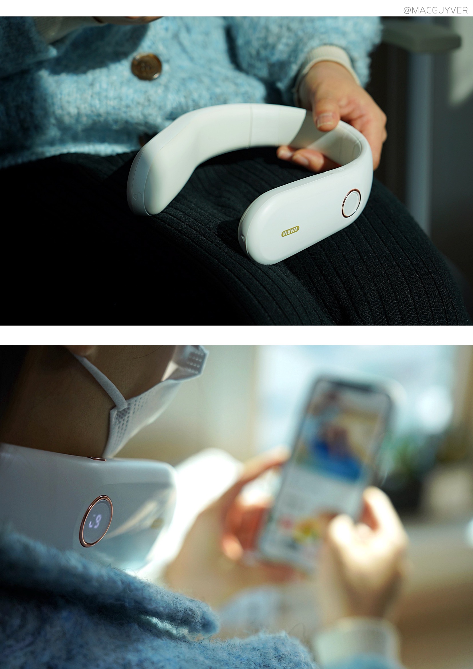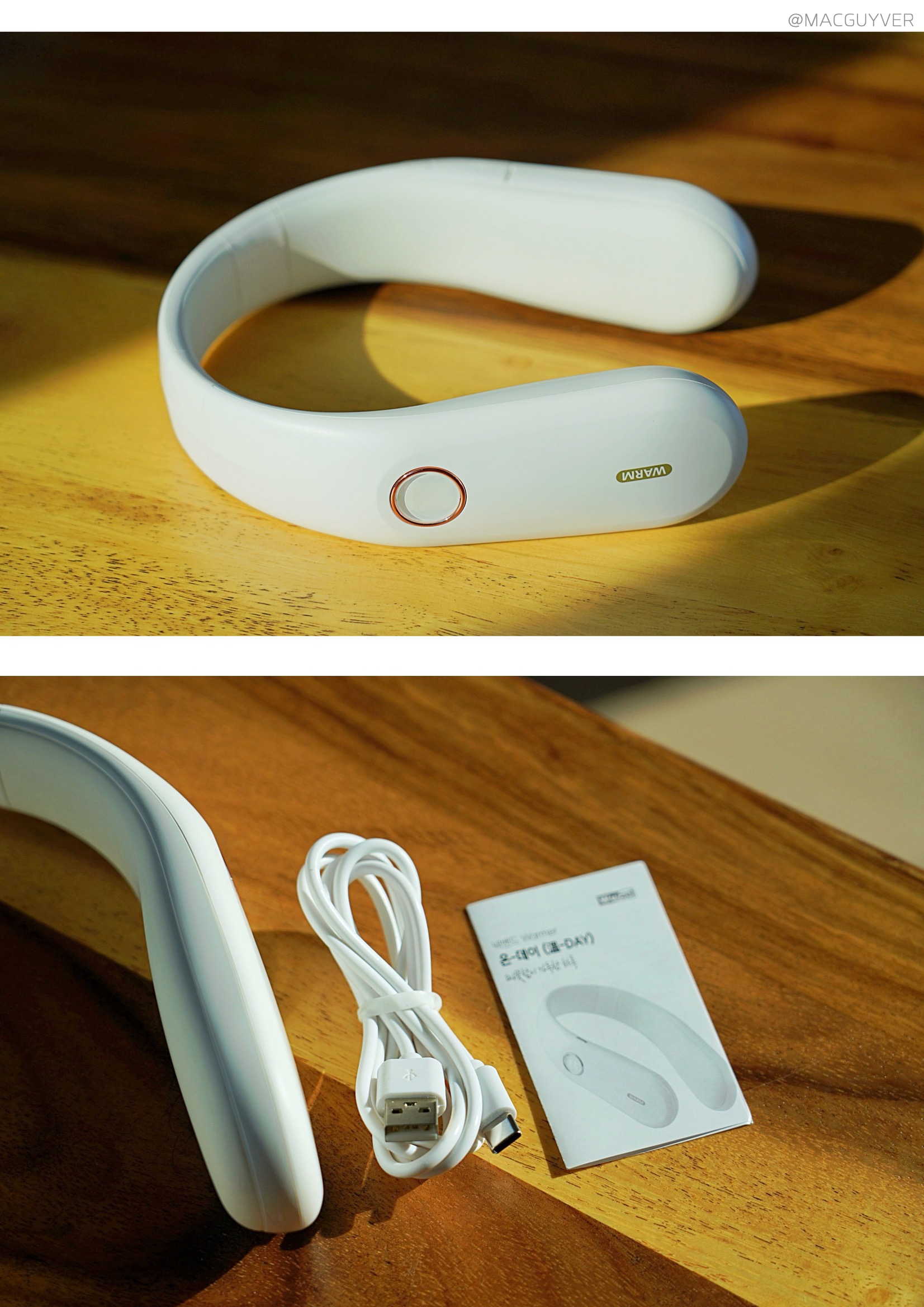 보통 목도리나 넥워머라고 하면 도톰한 니트 같은 재질을 떠올리실 것 같은데요. 온데이 넥워머는 기기의 내장된 배터리로 열을 발생시키는 원리라 U자형의 슬림한 디자인인 목난로예요. 처음엔 넥밴드 워머가 좀 어색하게 느껴지기도 했는데 슬림한 헤드폰을 목에 걸고 있는 느낌이 나더라고요. 그래서 생각보다 목을 움직이거나 숙이는 건 불편하지 않았는데요. 물론 넥워머가 없는 것처럼 옆이나 뒤로 젖히는 것은 힘들 것 같기는 합니다. 이 겨울용품은 남녀노소 누구나 착용하기에도 무난하고, 기기 자체가 화이트톤에 군더더기 없이 심플한 느낌이라 어떤 옷을 입어도 잘 어우러지는 느낌이었어요.