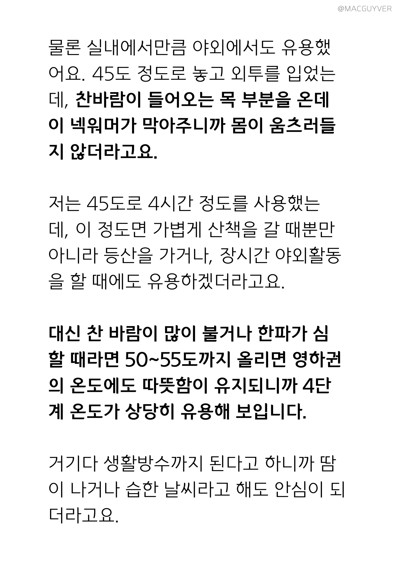 물론 실내에서만큼 야외에서도 유용했어요. 45도 정도로 놓고 외투를 입었는데, 찬바람이 들어오는 목 부분을 온데이 넥워머가 막아주니까 몸이 움츠러들지 않더라고요. 저는 목도리없이 온데이 넥워머를 45도로 4시간 정도를 사용했는데, 이 정도면 가볍게 산책을 갈 때뿐만 아니라 등산을 가거나, 장시간 야외활동을 할 때에도 유용하겠더라고요. 대신 찬 바람이 많이 불거나 한파가 심할 때라면 온데이 방한용품의 온도를 50~55도까지 올리면 영하권의 온도에도 따뜻함이 유지되니까 4단계 온도가 상당히 유용해 보입니다. 거기다 생활방수까지 된다고 하니까 땀이 나거나 습한 날씨라고 해도 안심이 되더라고요. 한 가지 아쉬운 점이라면 실내의 아주 조용한 환경에서는 미세한 고주파 음이 느껴지는데요. 물론 항상 들리는 것도 아니고 야외에서는 주변 소음에 묻히기는 하지만, 주로 실내에서 사용하려는 분들이라면 이 점을 참고하시면 좋을 것 같아요.