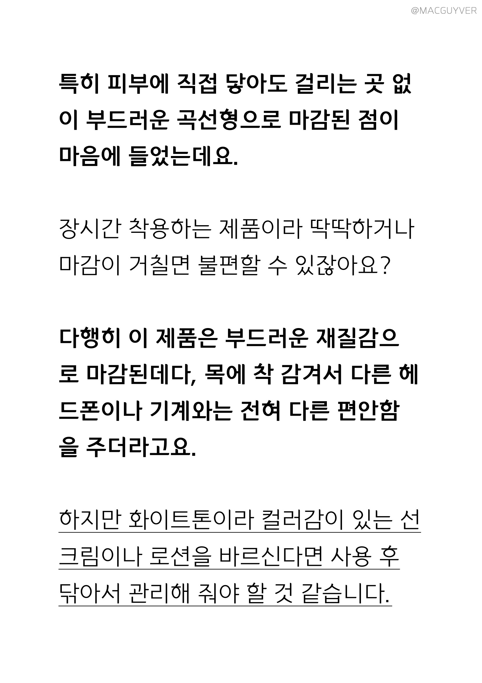 특히 피부에 직접 닿아도 걸리는 곳 없이 부드러운 곡선형으로 마감된 점이 마음에 들었는데요. 장시간 착용하는 제품이라 딱딱하거나 거친 마감이 있으면 불편할 수 있잖아요? 다행히 온데이 넥워머는 부드러운 재질감으로 마감된데다, 목에 착 감겨서 다른 헤드폰이나 기계와는 전혀 다른 편안함을 주더라고요. 하지만 넥워머가 화이트톤이라 컬러감이 있는 선크림이나 로션을 바르신다면 사용 후 닦아서 관리해 줄 필요가 있을 것 같습니다.