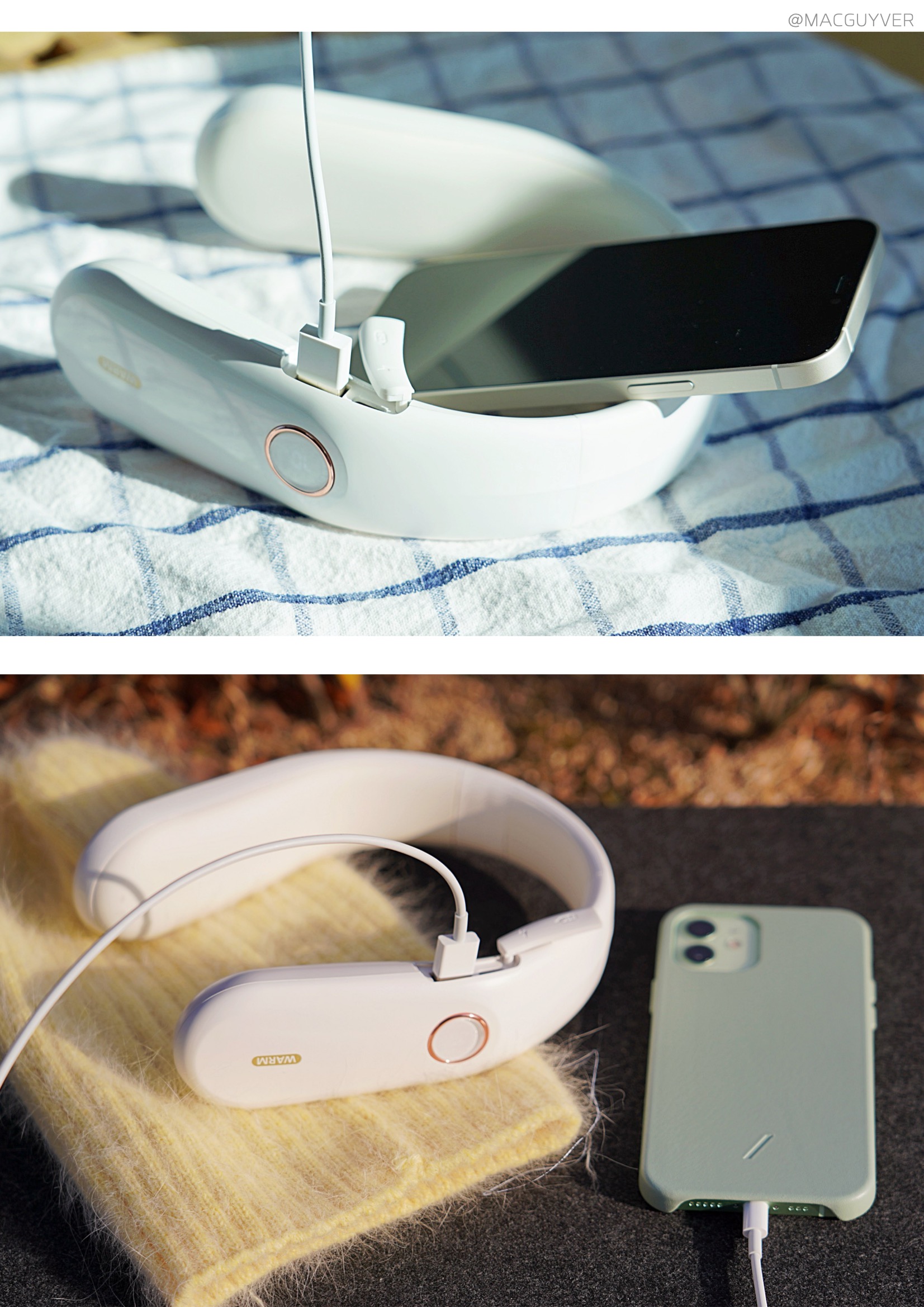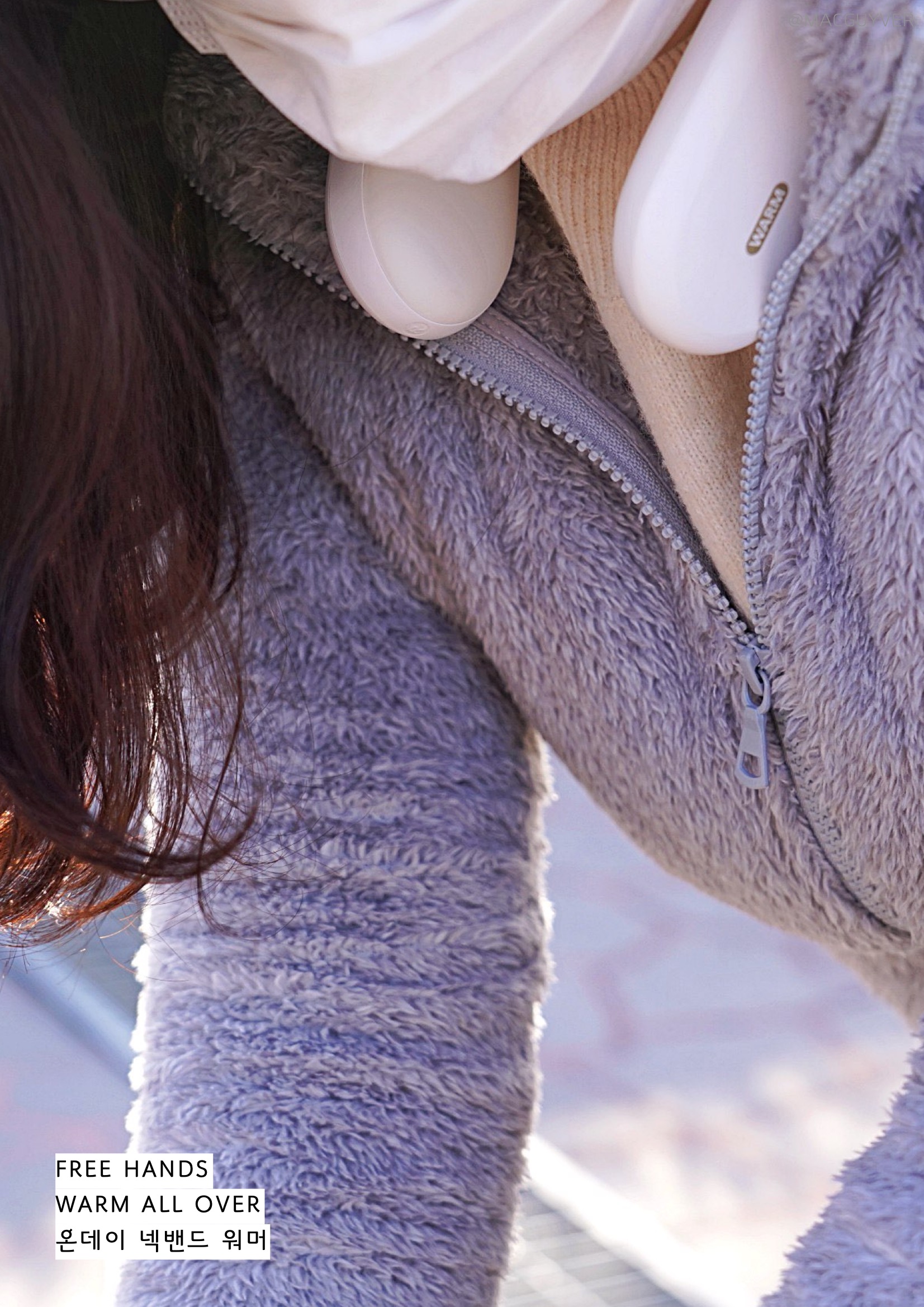 보통 목도리나 넥워머라고 하면 도톰한 니트 같은 재질을 떠올리실 것 같은데요. 온데이 넥워머는 기기의 내장된 배터리로 열을 발생시키는 원리라 U자형의 슬림한 디자인인 목난로예요. 처음엔 넥밴드 워머가 좀 어색하게 느껴지기도 했는데 슬림한 헤드폰을 목에 걸고 있는 느낌이 나더라고요. 그래서 생각보다 목을 움직이거나 숙이는 건 불편하지 않았는데요. 물론 넥워머가 없는 것처럼 옆이나 뒤로 젖히는 것은 힘들 것 같기는 합니다. 이 겨울용품은 남녀노소 누구나 착용하기에도 무난하고, 기기 자체가 화이트톤에 군더더기 없이 심플한 느낌이라 어떤 옷을 입어도 잘 어우러지는 느낌이었어요.