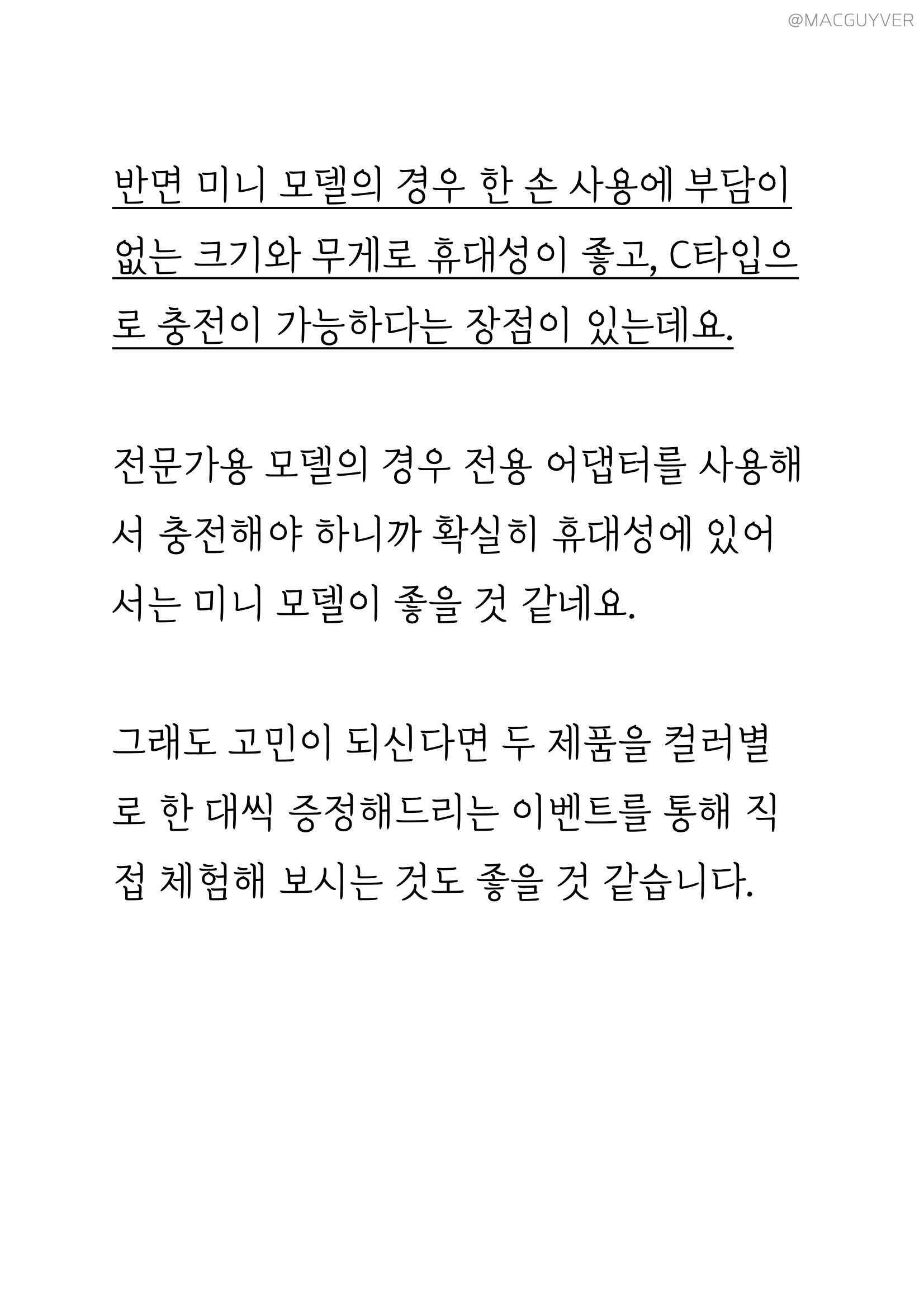 #전문가용&휴대용 안마기 미니 어떤 모델이 더 잘 맞을지 고민이 되실 분들을 위해 간단한 정리를 해드리자면 두 제품 모두 러버코팅으로 부드럽게 마감해서 그립감이 좋고, 고효율의 BLDC 모터를 장착했다는 공통점이 있어요. 하지만 셀라랩 전문가용 마사지건은 더 오래가는 배터리와 세분화된 모드가 있고, 장시간 한 손 사용은 힘들지만 그만큼 깊이 있는 마사지 효과를 느낄 수 있다는 장점이 있어요. 또 하단에 별도의 메인 전원 버튼이 있어서 실수로 버튼이 눌려져도 켜질 염려가 없다는 장점도 있습니다. 반면 셀라랩 미니 마사지건의 경우 한 손 사용에 부담이 없는 크기와 무게로 휴대성이 좋고, C타입으로 충전이 가능하다는 장점이 있는데요. 셀라랩 전문가용 마사지건의 경우 전용 어댑터를 사용해서 충전해야 하니까 확실히 휴대성에 있어서는 미니 모델이 휴대용 마사지기로 좋을 것 같네요. 그래도 고민이 되신다면 두 제품을 컬러별로 한 대씩 증정해드리는 이벤트를 통해 직접 체험해 보시는 것도 좋을 것 같습니다.