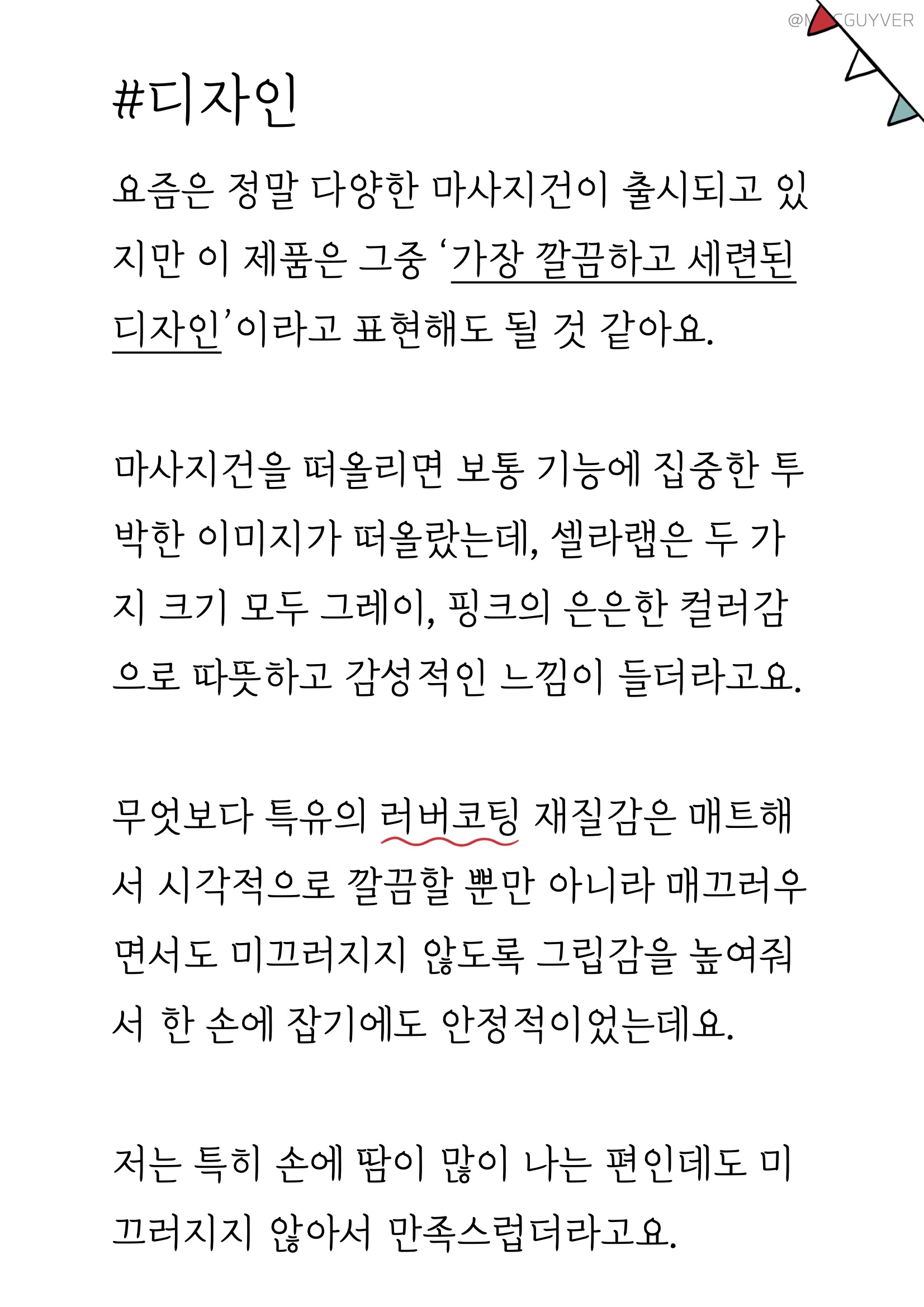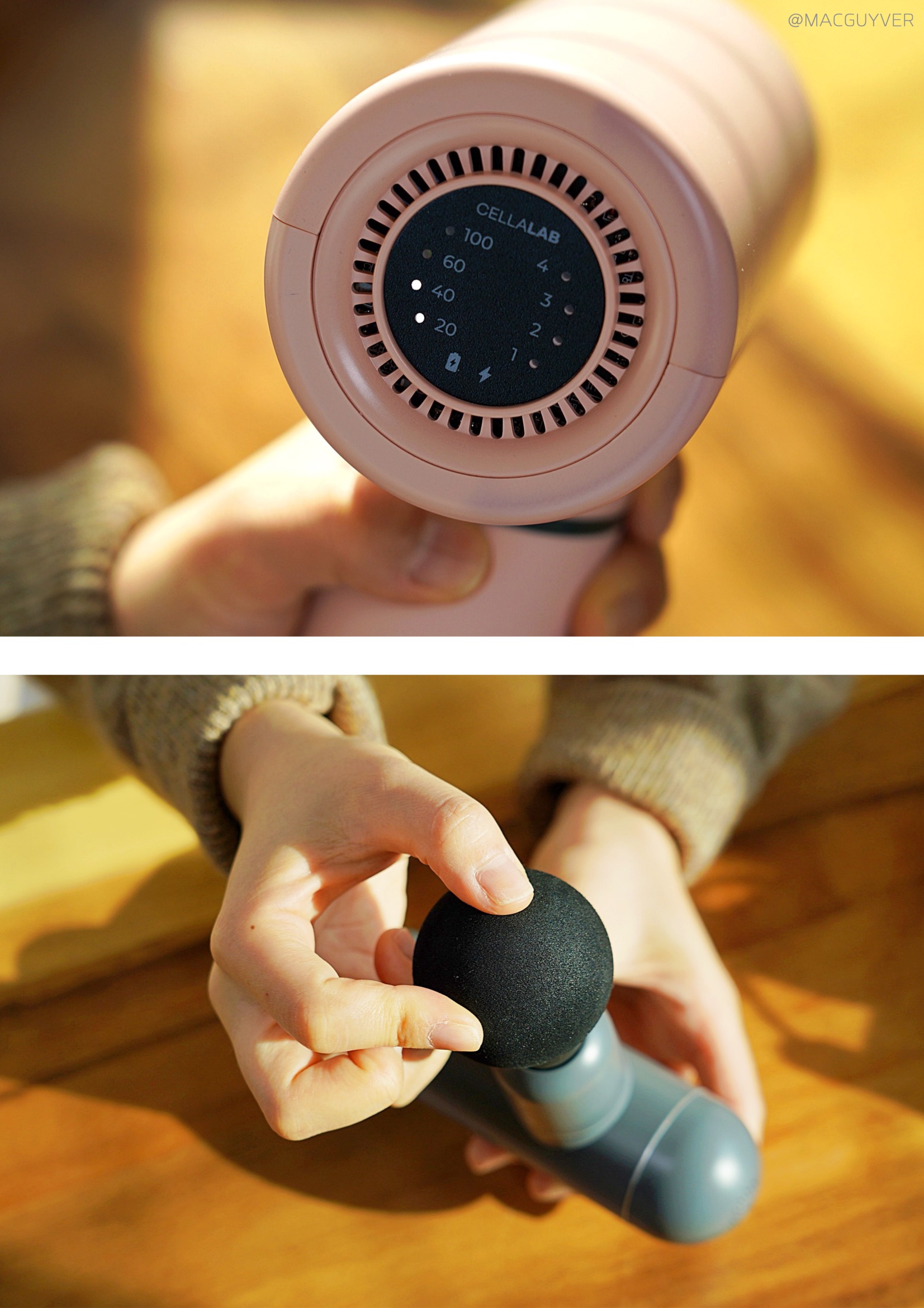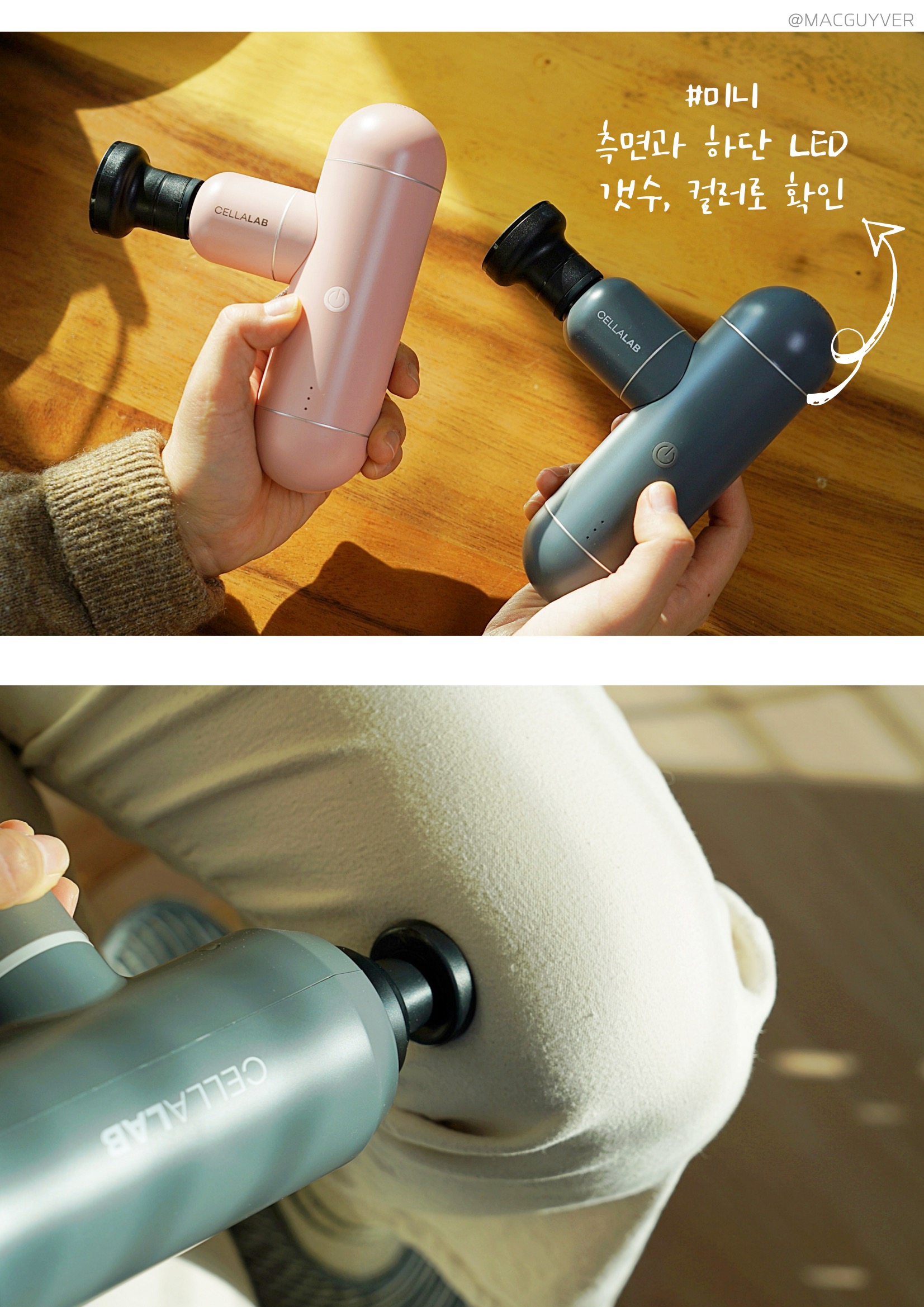 #마사지건 추천 디자인 요즘은 정말 다양한 마사지건이 출시되고 있지만 이 제품은 그중 ‘가장 깔끔하고 세련된 디자인’이라고 표현해도 될 것 같아요. 마사지건을 떠올리면 보통 기능에 집중한 투박한 이미지가 떠올랐는데, 셀라랩은 두 가지 크기 모두 그레이, 핑크의 은은한 컬러감으로 따뜻하고 감성적인 느낌이 들더라고요. 무엇보다 특유의 러버코팅 재질감은 매트해서 시각적으로 깔끔할 뿐만 아니라 매끄러우면서도 미끄러지지 않도록 그립감을 높여줘서 한 손에 잡기에도 안정적이었는데요. 저는 특히 손에 땀이 많이 나는 편인데도 미끄러지지 않아서 만족스럽더라고요. 또 어느 곳 하나 걸리는 곳 없이 부드럽게 마감되었다는 점에서도 이 제품의 완성도를 확인할 수 있었는데요. 하지만 특유의 재질감 때문에 먼지가 잘 묻는다는 점은 참고하시면 좋을 것 같아요. 그레이 컬러는 먼지가 눈에 좀 띄는 편이고, 핑크 컬러는 볼펜 자국 같은 얼룩에는 취약해 보이더라고요.
