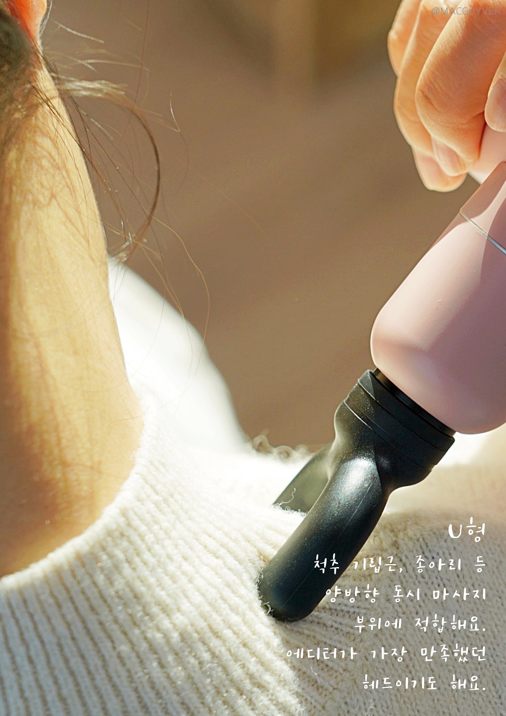 마사지건 추천: 두 제품 모두 라운드볼 형, 플랫형, 스파이럴형, U형의 네 가지 헤드를 제공해서 신체 부위에 맞게 사용할 수 있고, 전용 파우치를 증정하니까 파손이나 흠집의 우려 없이 깔끔하게 보관이 가능하고 휴대용 안마기로 이동하며 사용도 가능해요. 라운드볼형: 어깨, 팔 같이 넓은 부위나 둥근 스펀지형이라 충격에 약한 부위를 부드럽게 마사지할 수 있어요. 플랫형: 등, 허벅지 등 넓고 높은 강도가 필요한 부위에 적합해요. 스파이럴형: 손, 발바닥 및 좁은 부위를 집중적으로 케어해줘요. U형: 척추 기립근, 종아리 등 양방향 동시 마사지 부위에 적합해요. 에디터가 가장 만족했던 헤드이기도 해요. 그리고 전문가용은 LED 화면으로 배터리 상태와 세기를 한눈에 알 수 있어요. 또 미니 마사지건은 측면의 LED 갯수와 하단의 컬러로 세기와 배터리 상태를 알 수 있습니다.