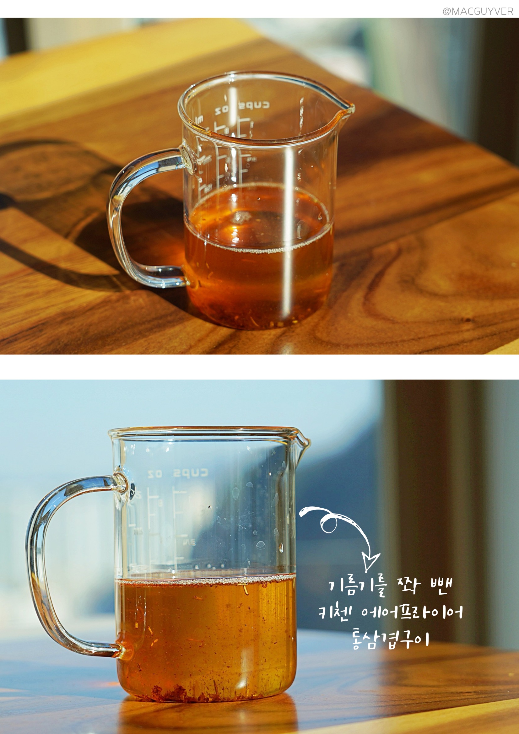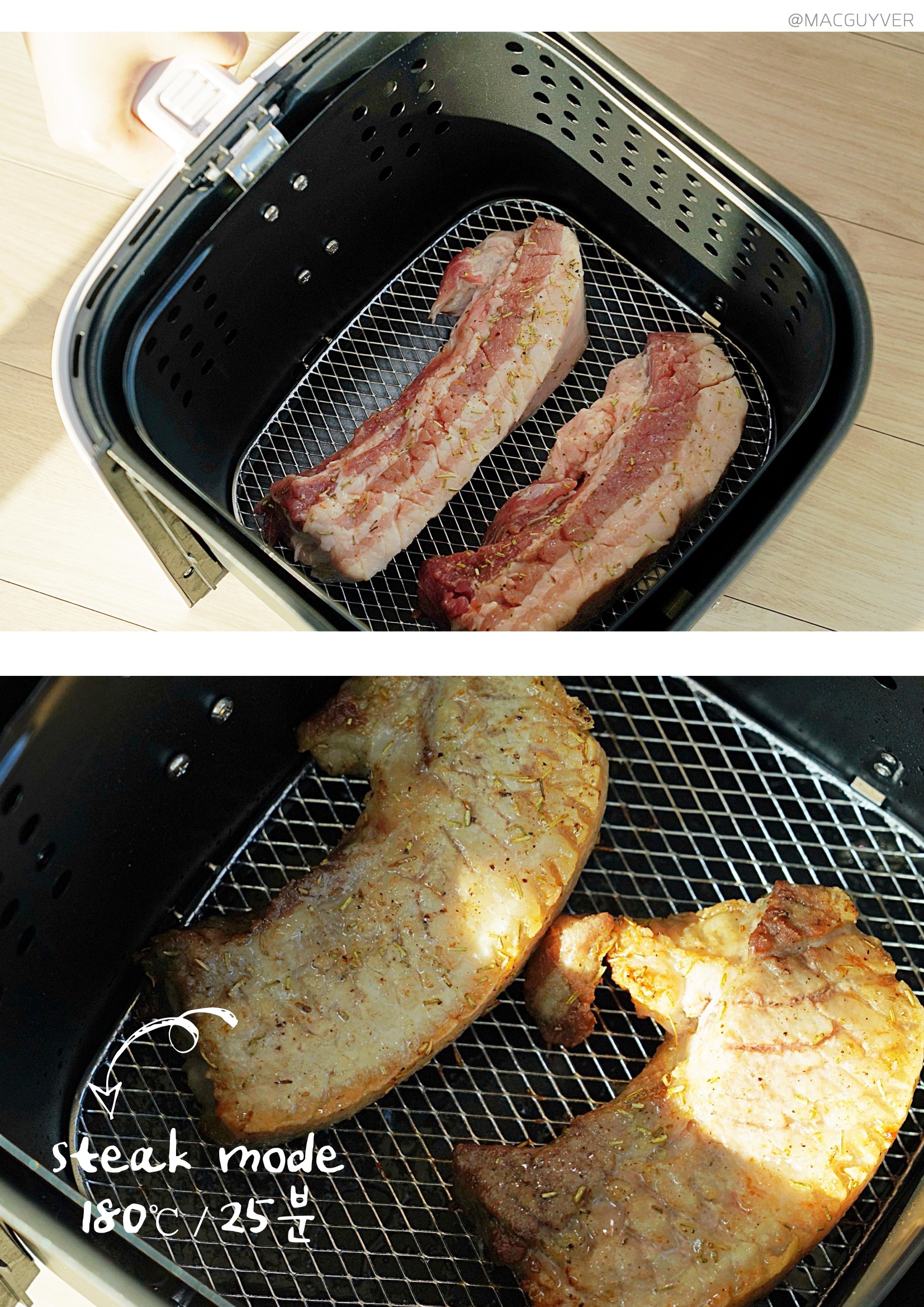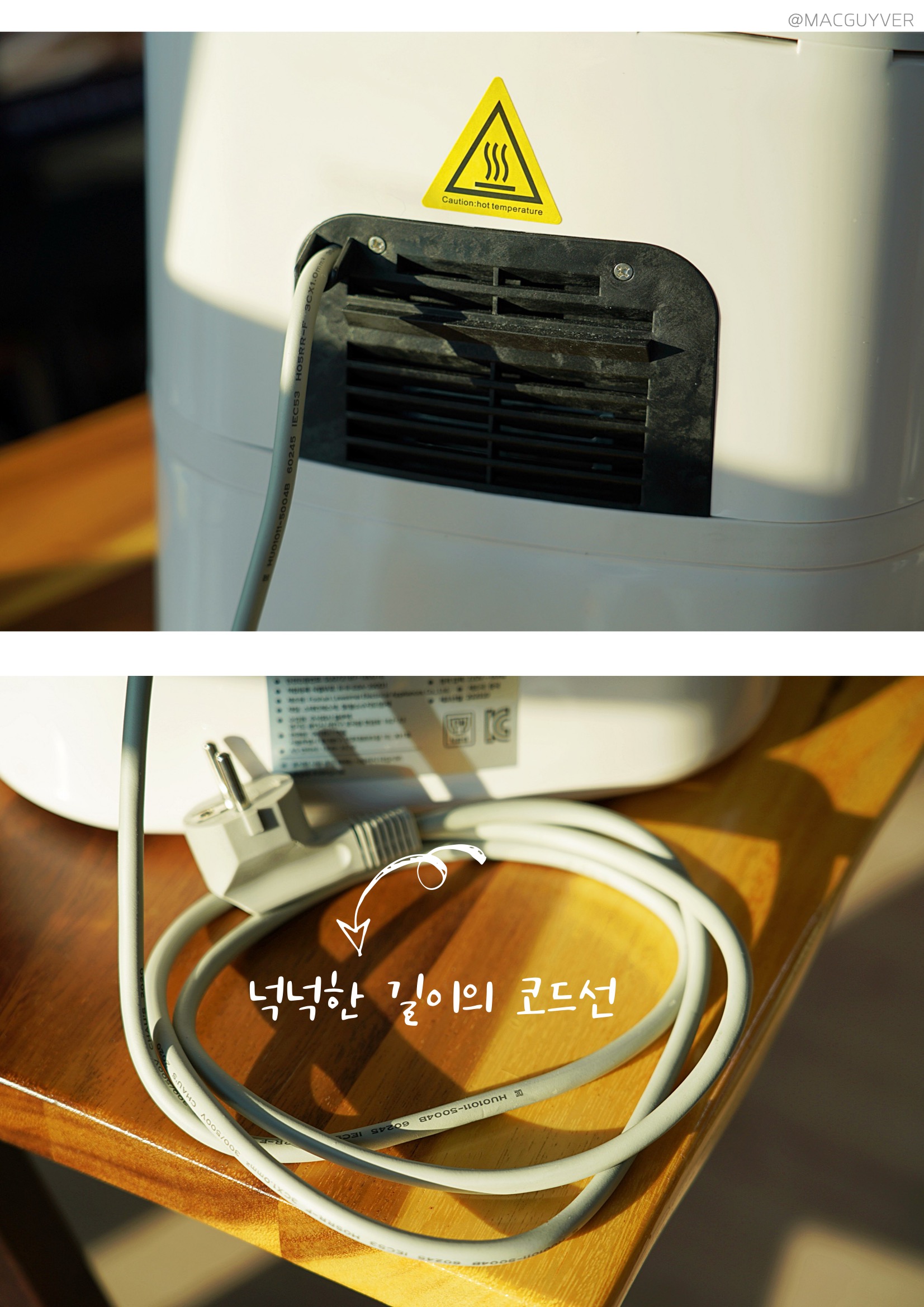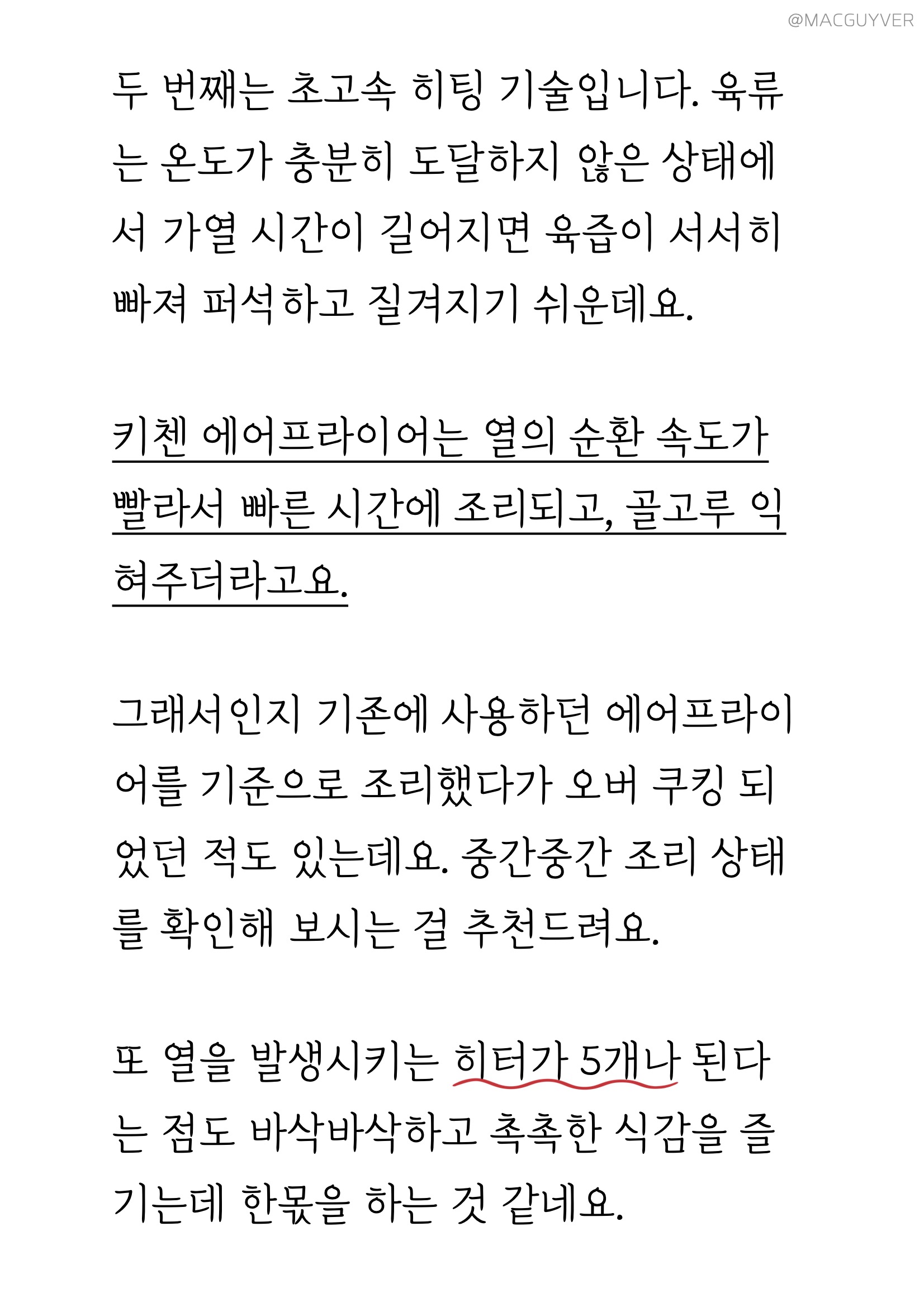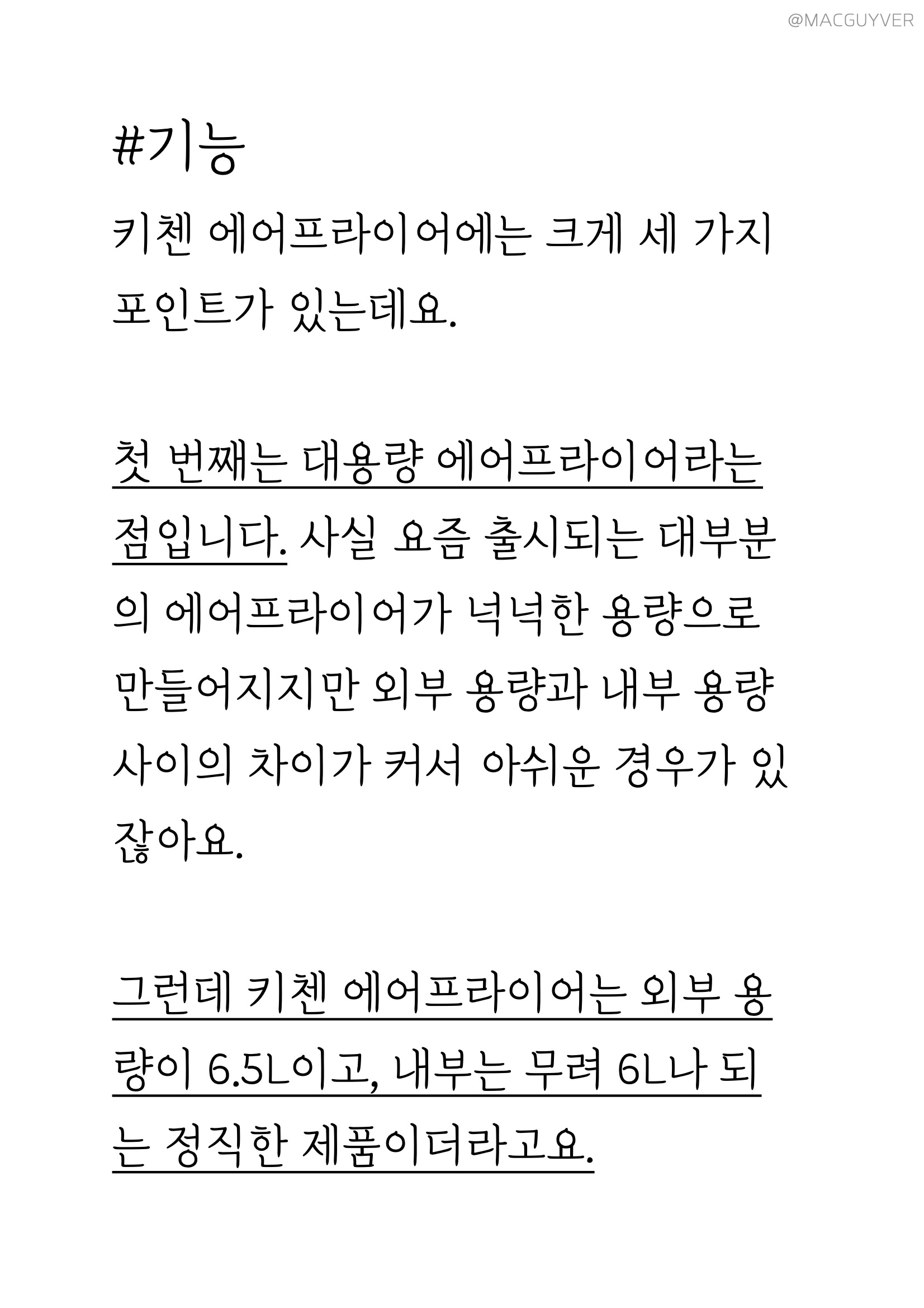 #에어프라이기추천 기능 키첸 에어프라이에는 크게 세 가지 포인트가 있는데요. 첫 번째는 대용량 에어프라이어라는 점입니다. 사실 요즘 출시되는 대부분의 에어프라이어가 대용량에어프라이어, 넉넉한 용량으로 만들어지지만 외부 용량과 내부 용량에 차이가 커서 아쉬운 경우가 있잖아요. 그런데 키첸 에어프라이어는 외부 용량이 6.5L이고, 내부는 무려 6L나 되는 정직한 대용량에어프라이어 제품이더라고요. 실제로 기존 에어프라이기에 딱 맞던 6호 사이즈의 닭을 키첸 에어프라이어에 넣으니까 여유 공간이 많이 남아 곁들일 야채나 다른 재료를 넣기에 좋더라고요. 거기다 실용적인 사각 바스켓은 내용물이 겹치지 않게 넣기에도 안성맞춤이어서 많은 양을 한 번에 조리하기에 더 좋더라고요. 두 번째는 초고속 히팅 기술입니다. 주로 에어프라이에 많이 조리하게 되는 육류는 온도가 충분히 도달하지 않은 상태에서 가열 시간이 길어지면 육즙이 서서히 빠져 식감이 퍼석하고 질겨지기 쉬운데요. 키첸 에어프라이어는 열의 순환 속도가 빨라서 빠른 시간에 조리되고, 골고루 익혀주더라고요. 그래서인지 기존에 사용하던 에어프라이를 기준으로 조리했다가 오버 쿠킹 되었던 적도 있는데요. 중간중간 조리 상태를 확인해 보시는 걸 추천드려요. 또 열을 발생시키는 히터가 5개나 된다는 점도 바삭바삭하고 촉촉한 식감을 즐기는데 한몫을 하는 것 같네요. 세 번째는 소음이에요. 소음이 아예 없다고 할 수는 없지만 매우 낮고, 거슬리는 소리가 들리지 않더라고요. 기존 에어프라이어가 고속 주행을 하고 있다고 하면 키첸 에어프라이어는 저속 주행을 하는 느낌입니다. 분명히 바스켓을 열어보면 뜨거운 열기로 조리되고 있는데, 주방이 조용해서 신기하더라고요. 실제로 200°C로 작동되는 상태에서 50cm 정도 거리를 두고 소음 측정기로 측정해보니, 54db 정도가 들렸어요. 에어후라이기를 꺼도 53.5db정도니까 수치적으로도 큰 차이가 없었습니다. 그밖에 안전 인증을 획득한 점, 전용 디바이더로 두 가지 음식을 동시에 조리할 수 있는 장점도 참고하시면 좋을 것 같네요.