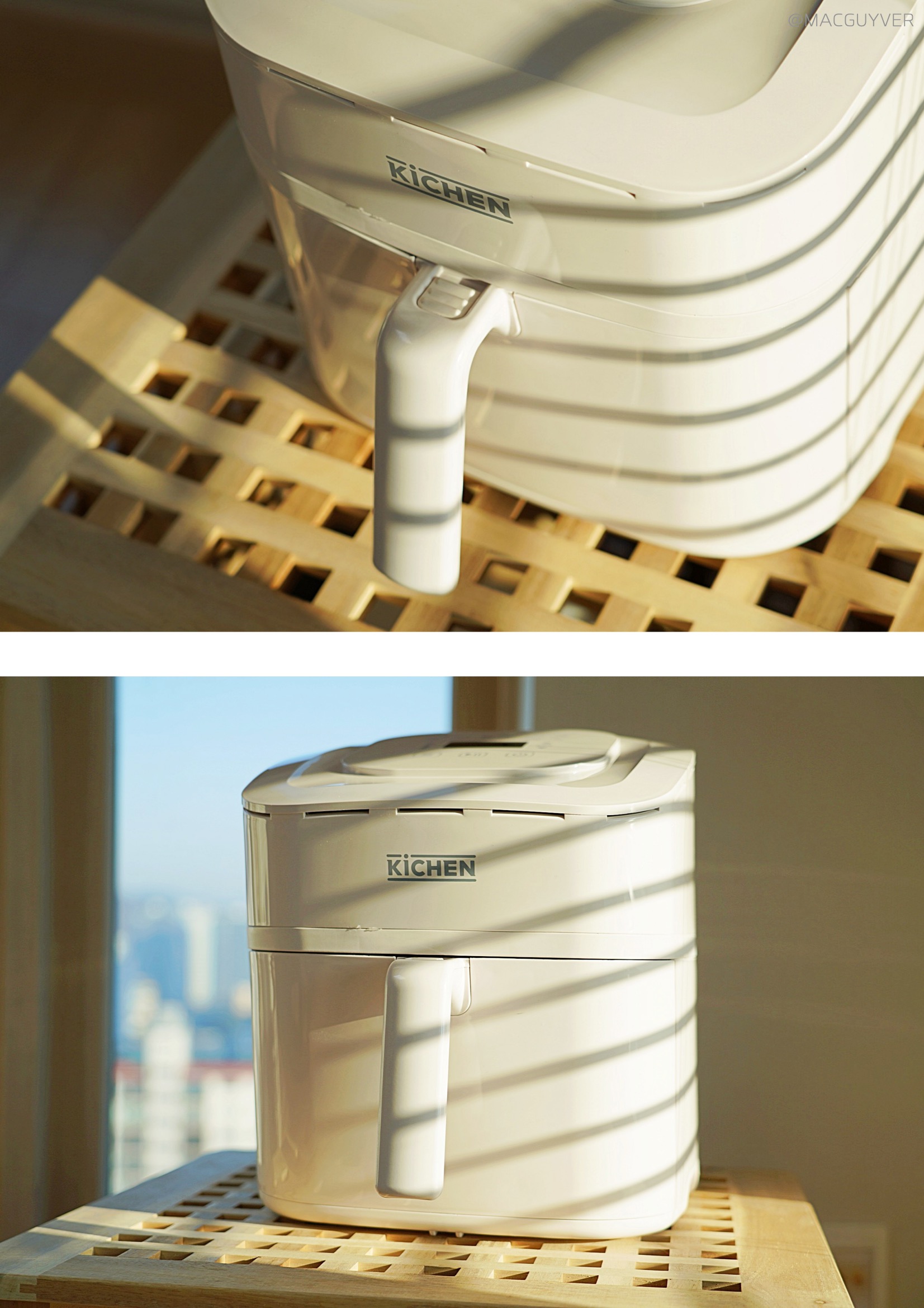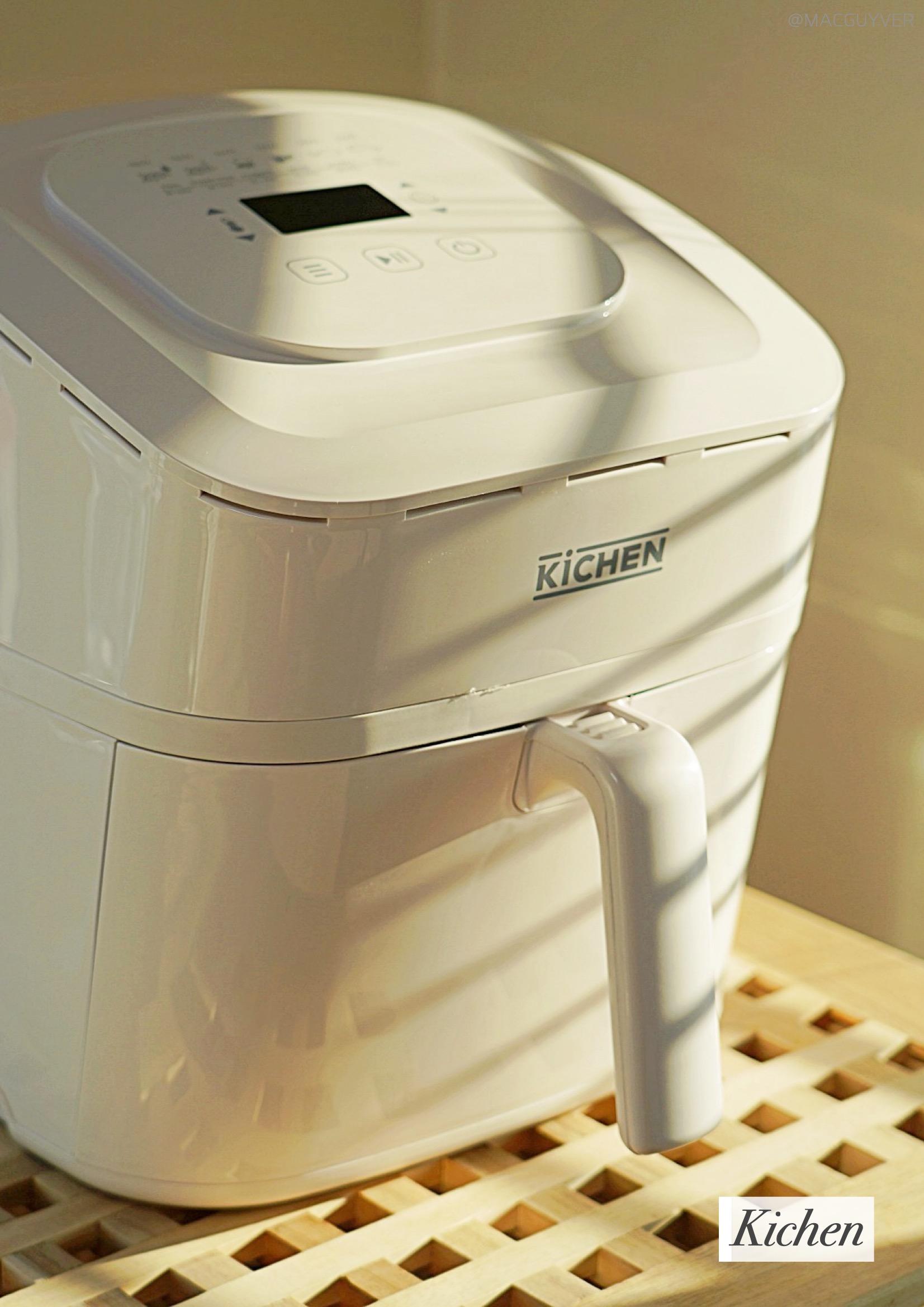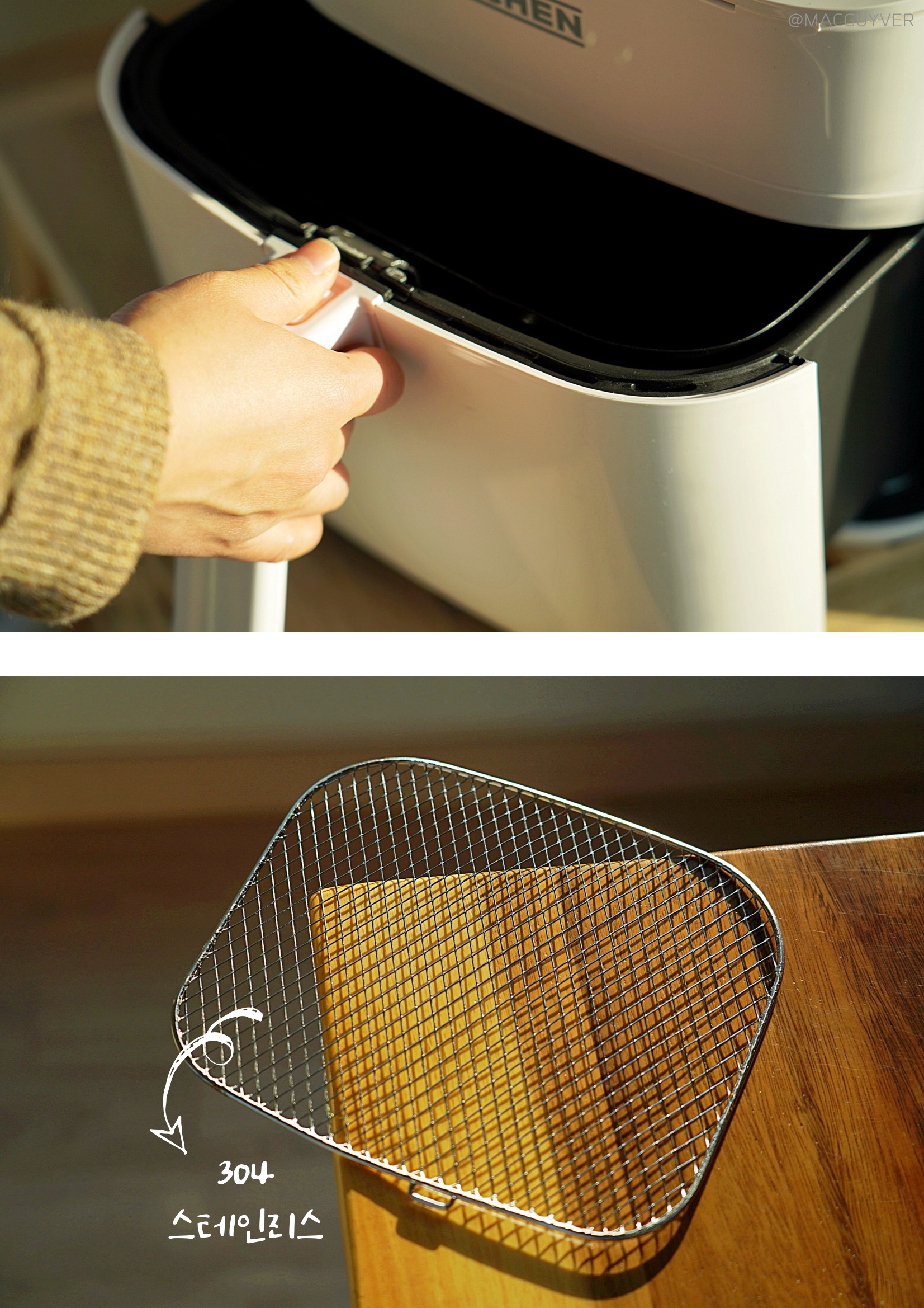# 에어프라이기추천 디자인 첫인상으로 앞으로 비스듬히 기울어진 디자인이 눈에 들어왔는데요. 처음엔 개성 있는 디자인이라고만 생각했는데, 사용하다 보니 높은 테이블이나 조리대에 올려두고 사용할 경우 상단의 스크린이 한눈에 들어와서 조작이 간편하더라고요. 키첸 에어프라이기 화이트와 블랙 두 가지 컬러 모두 군더더기 없이 부드럽게 이어지는 디자인이에요. 개성이 강한 디자인은 제품 자체는 만족스럽지만 주방 분위기에 어울리지 않아 산만해지는 경향이 있는데, 키첸 에어프라이어는 어디에도 잘 어울릴만한 이미지였어요. 다만 유광 재질이라 얼룩이나 지문에도 티가 잘 나지 않는 화이트 색상을 선택했는데, 따뜻한 크림화이트 색상이라 부담스럽지 않더라고요. 상단 터치 조작 방식은 가볍게 터치해도 명확하게 인식이 되고, 비프음으로도 알려주니까 새로운 가전에 익숙하지 않은 분들도 쉽게 사용할 수 있을 것 같네요. 바스켓은 서랍식으로 탈착이 부드러워요. 덕분에 에어후라이기에 많은 양을 조리해도 넣고 빼기가 쉬웠는데요. 스텐에어프라이어추천 특히 공간 활용에 효율적인 사각형 바스켓과 촘촘한 304 스테인리스 석쇠, 스텐에어프라이어라는 점도 만족스러운 부분 중 하나였어요. 하지만 에어프라이기 외부 바스켓과 내부 바스켓이 때때로 헐겁게 결합되는 느낌도 들어서 잘 장착되었는지 확인하게 된다는 점은 아쉽기도 합니다. 물론 사용 중에 바스켓이 분리되는 문제는 생기지 않았지만 좀 더 안정감 있게 만들어졌다면 좋을 것 같네요.