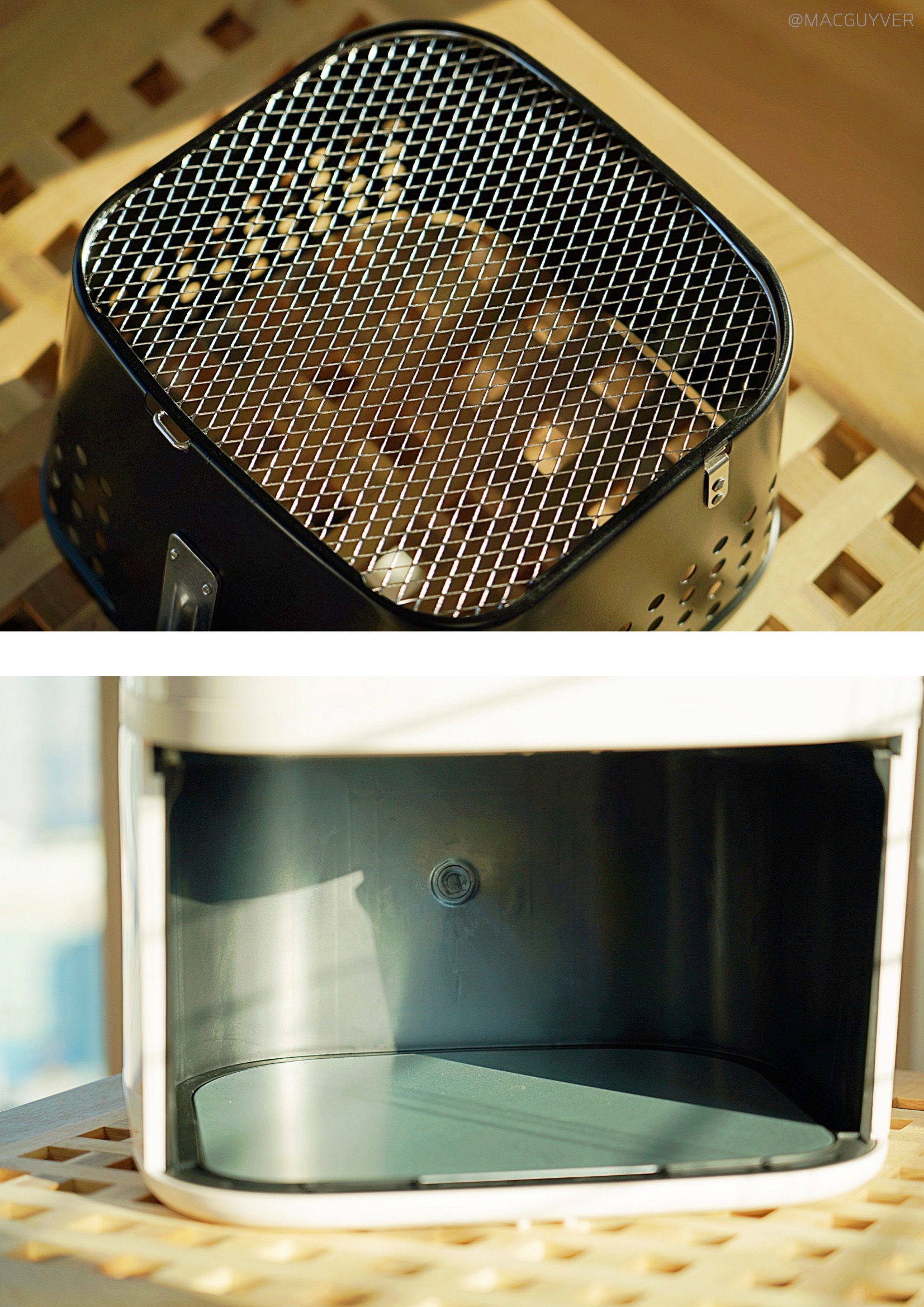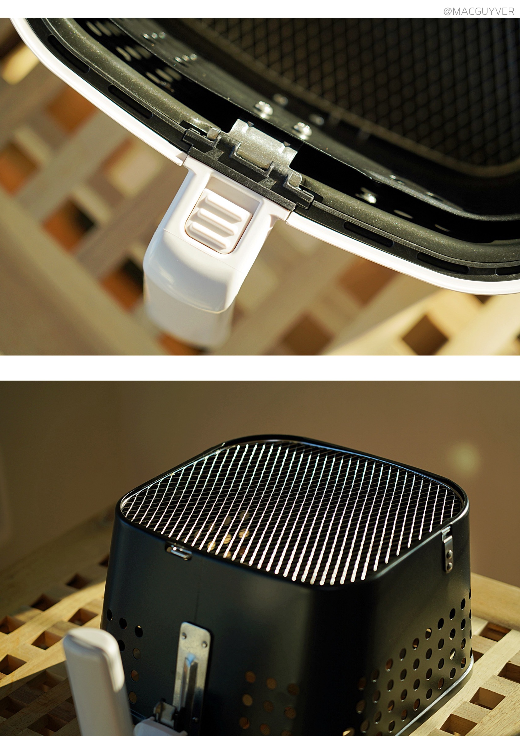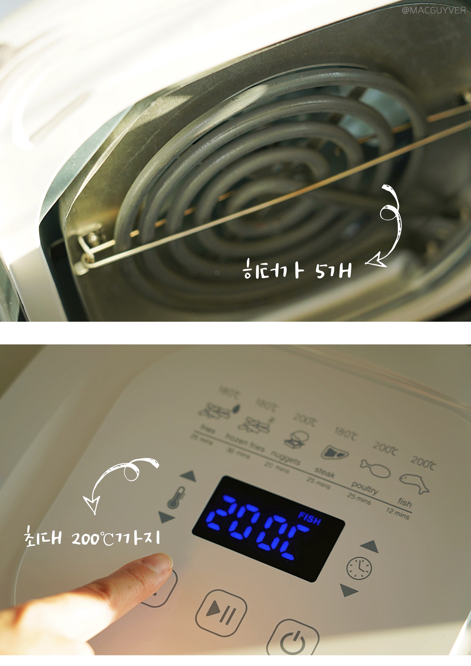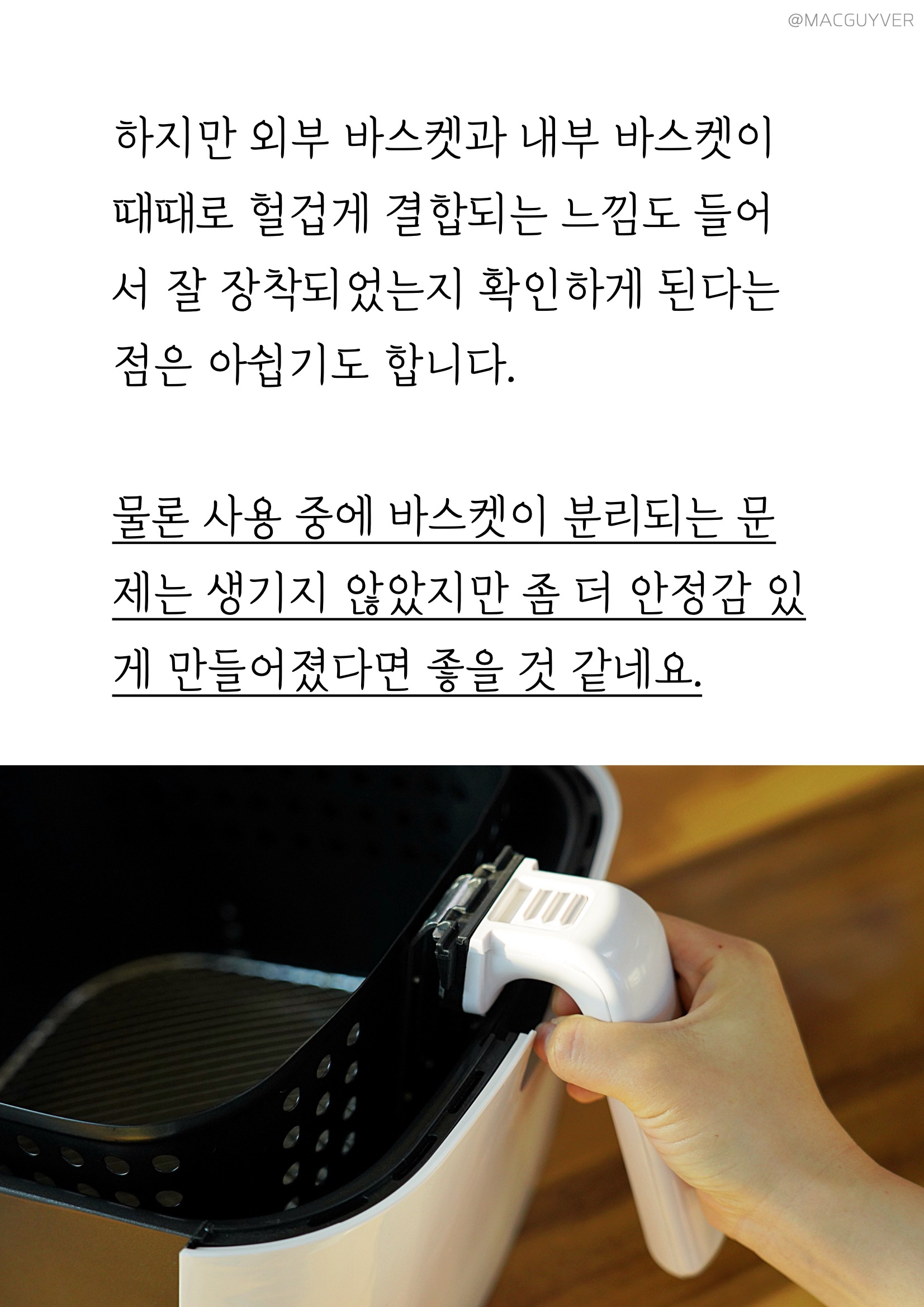 # 에어프라이기추천 디자인 첫인상으로 앞으로 비스듬히 기울어진 디자인이 눈에 들어왔는데요. 처음엔 개성 있는 디자인이라고만 생각했는데, 사용하다 보니 높은 테이블이나 조리대에 올려두고 사용할 경우 상단의 스크린이 한눈에 들어와서 조작이 간편하더라고요. 키첸 에어프라이기 화이트와 블랙 두 가지 컬러 모두 군더더기 없이 부드럽게 이어지는 디자인이에요. 개성이 강한 디자인은 제품 자체는 만족스럽지만 주방 분위기에 어울리지 않아 산만해지는 경향이 있는데, 키첸 에어프라이어는 어디에도 잘 어울릴만한 이미지였어요. 다만 유광 재질이라 얼룩이나 지문에도 티가 잘 나지 않는 화이트 색상을 선택했는데, 따뜻한 크림화이트 색상이라 부담스럽지 않더라고요. 상단 터치 조작 방식은 가볍게 터치해도 명확하게 인식이 되고, 비프음으로도 알려주니까 새로운 가전에 익숙하지 않은 분들도 쉽게 사용할 수 있을 것 같네요. 바스켓은 서랍식으로 탈착이 부드러워요. 덕분에 에어후라이기에 많은 양을 조리해도 넣고 빼기가 쉬웠는데요. 스텐에어프라이어추천 특히 공간 활용에 효율적인 사각형 바스켓과 촘촘한 304 스테인리스 석쇠, 스텐에어프라이어라는 점도 만족스러운 부분 중 하나였어요. 하지만 에어프라이기 외부 바스켓과 내부 바스켓이 때때로 헐겁게 결합되는 느낌도 들어서 잘 장착되었는지 확인하게 된다는 점은 아쉽기도 합니다. 물론 사용 중에 바스켓이 분리되는 문제는 생기지 않았지만 좀 더 안정감 있게 만들어졌다면 좋을 것 같네요.