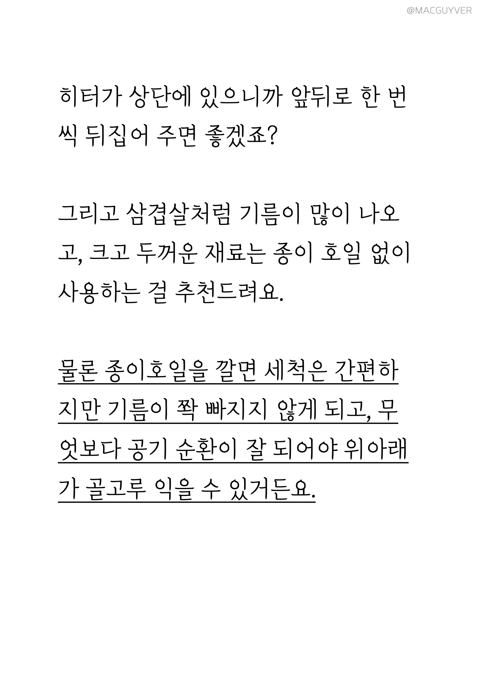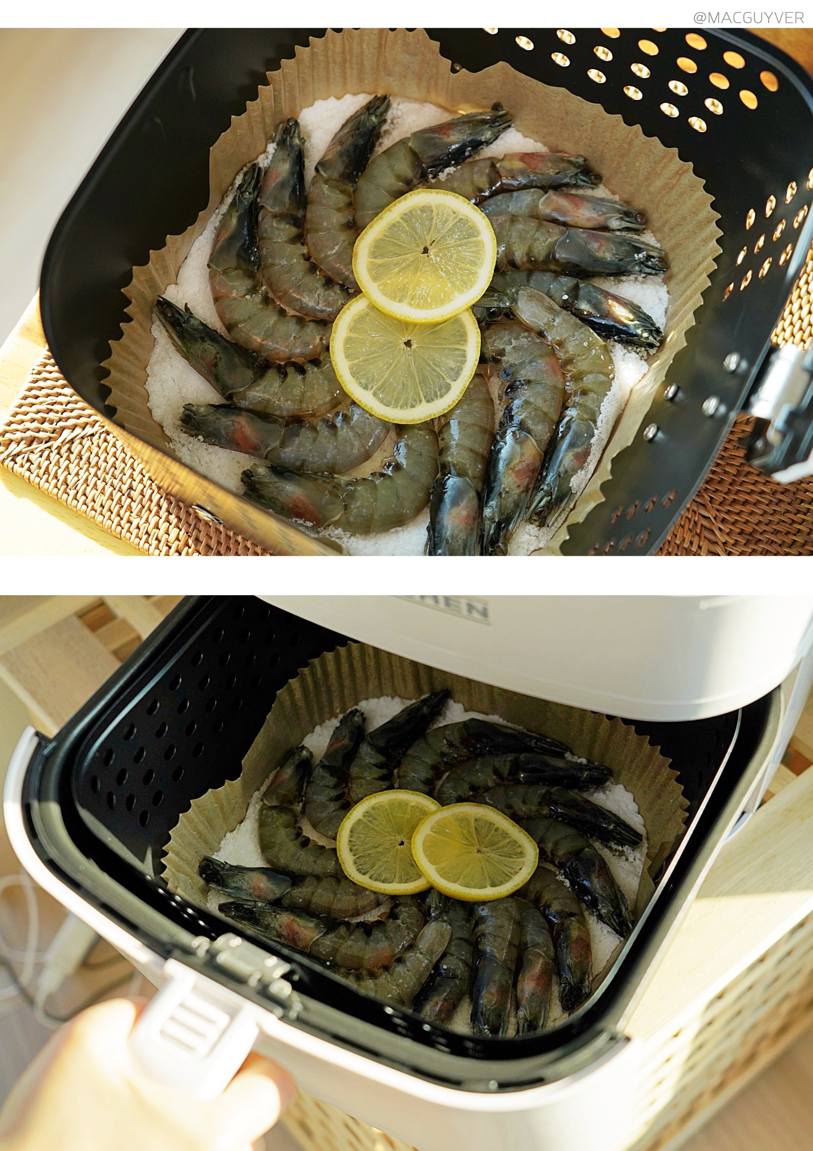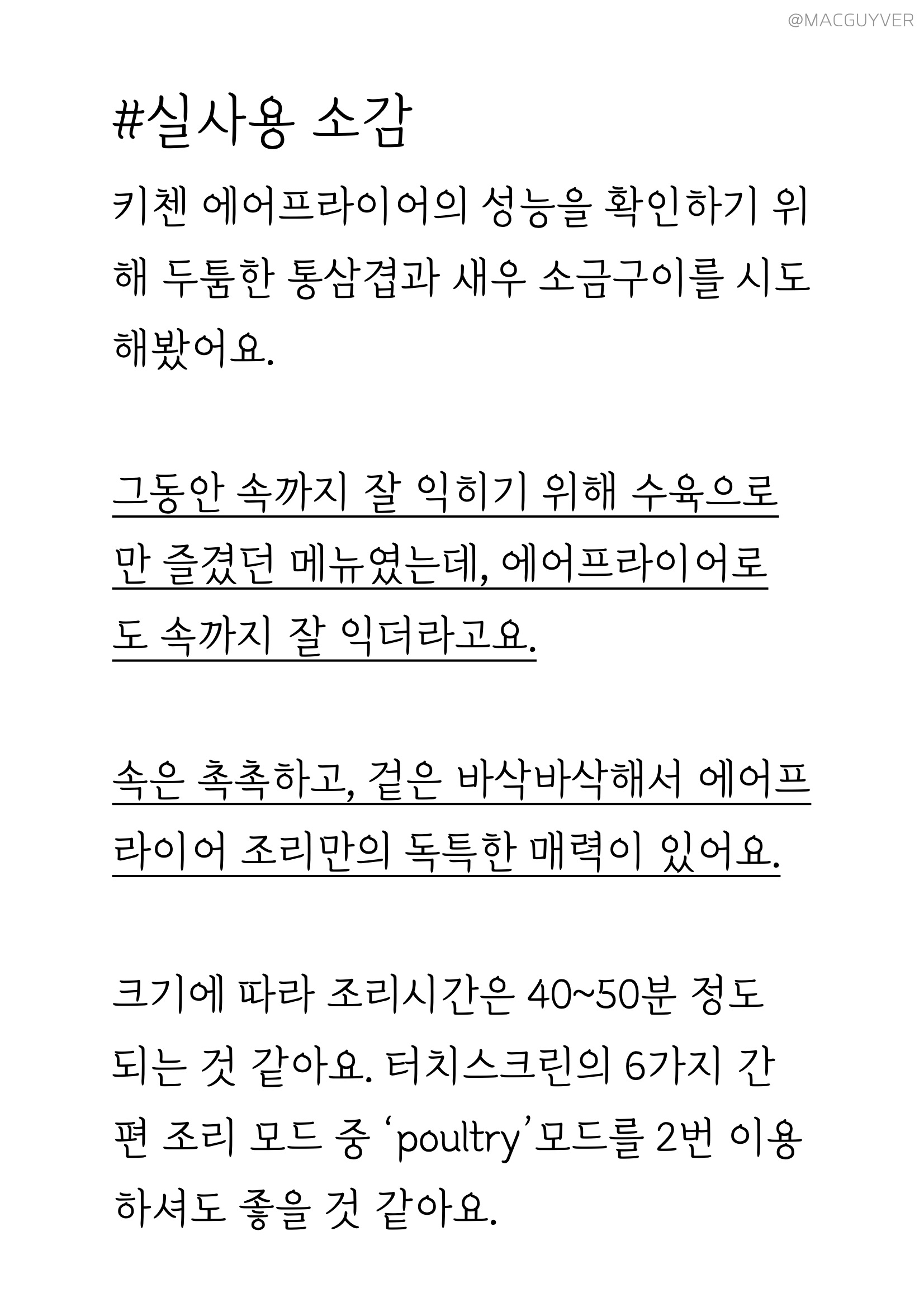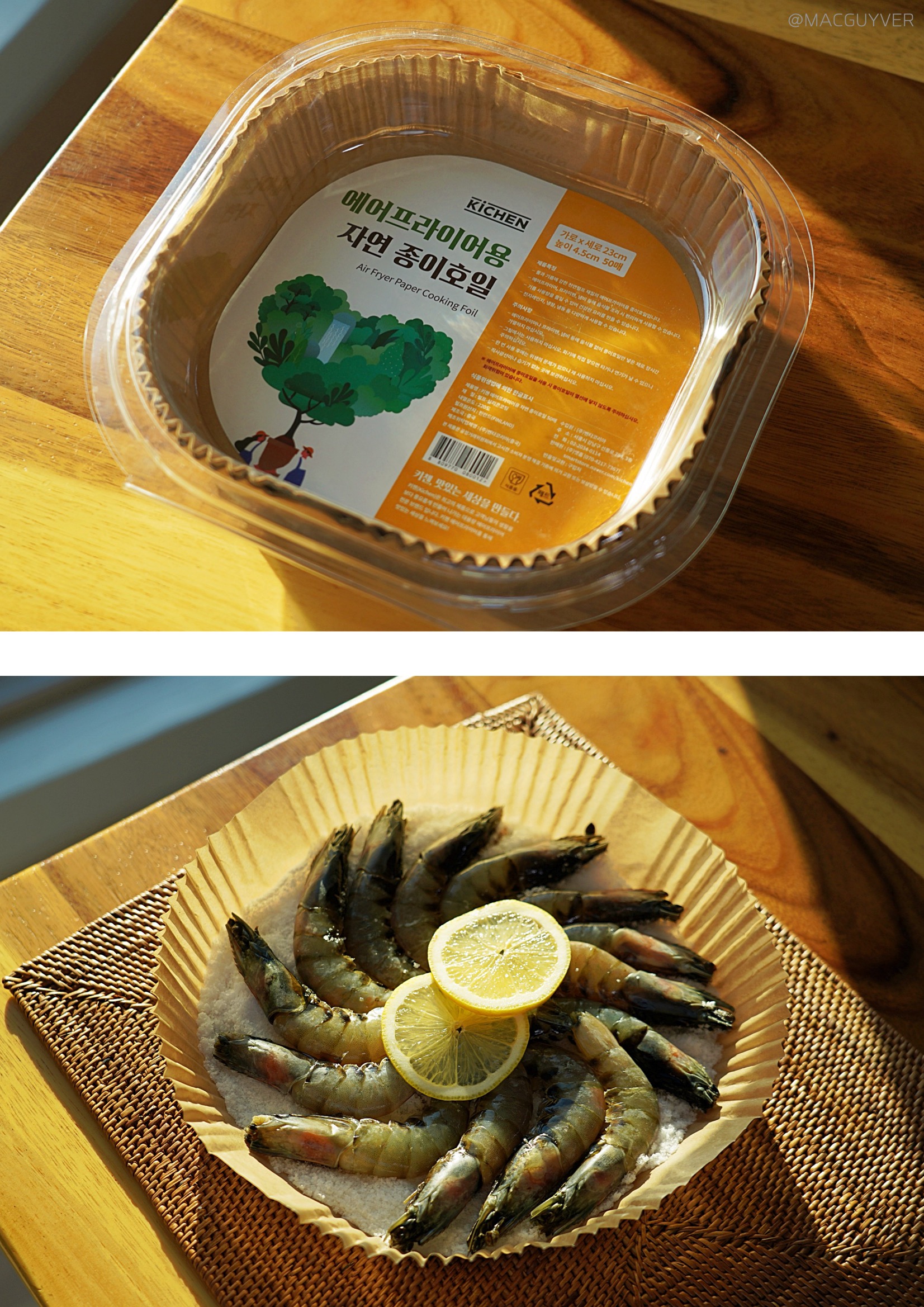 #에어프라이어요리 실사용 소감 키첸 에어프라이어의 성능을 확인하기 위해 두툼한 통삼겹과 새우 소금구이를 시도해봤어요. 그동안 속까지 잘 익히기 위해 수육으로만 즐겼던 메뉴였는데, 에어프라이어로도 속까지 잘 익더라고요. 속은 촉촉하고, 겉은 바삭바삭해서 에어프라이어 조리만의 독특한 매력이 있었어요. 크기에 따라 조리시간은 40~50분 정도 되는 것 같아요. 에어프라이기 터치스크린의 6가지 간편 조리 모드 중 ‘poultry’모드를 2번 이용하셔도 좋을 것 같아요. 에어후라이기 히터가 상단에 있으니까 앞뒤로 한 번씩 뒤집어 주면 좋겠죠? 그리고 삼겹살처럼 기름이 많이 나오고, 크고 두꺼운 재료는 종이 호일 없이 사용하는 걸 추천드려요. 물론 종이호일을 깔면 세척은 간편하지만 기름이 쫙 빠지지 않게 되고, 무엇보다 공기 순환이 잘 되어야 위아래가 골고루 익을 수 있거든요. 다음으로 새우 소금구이에 대해 알려드릴게요. 그동안 소심하게 낡은 프라이팬에만 구웠던 새우는 키첸 에어프라이기를 사용하면서 딱 맞는 자리를 찾은 것 같았는데요. 조리시간이 길진 않지만 굵은소금에 프라이팬의 코팅이 벗겨지기도 하고, 갑자기 튀기도 해서 늘 부담스러운 메뉴였거든요. 이렇게 키첸 에어프라이 종이 호일에 소금을 깔고 구우니까 조리 과정도 뒤처리도 한결 쉬워졌어요. 그동안 기름종이를 잘라서 바스켓 사이즈에 맞춰서 사용했는데, 키첸 에어프라이어 전용 종이 호일도 따로 판매하고 있어서 사이즈에 맞게 바로 사용할 수 있다는 장점도 있었습니다. 그밖에 간편 조리제품이나 간식, 에어프라이어요리, 브런치도 키첸 에어프라이기 활용해봤는데 전자렌지나 오븐과는 비교할 수 없는 에어프라이어의 장점을 확실히 느낄 수 있더라고요. 전자렌지에서는 말라서 딱딱해지거나 혹은 눅눅해져 버리기 쉬운 재료들을 바삭 촉촉하게 살려주면서도 오븐보다는 효율적이어서 요리 초보에게도 친숙한 제품이었어요.
