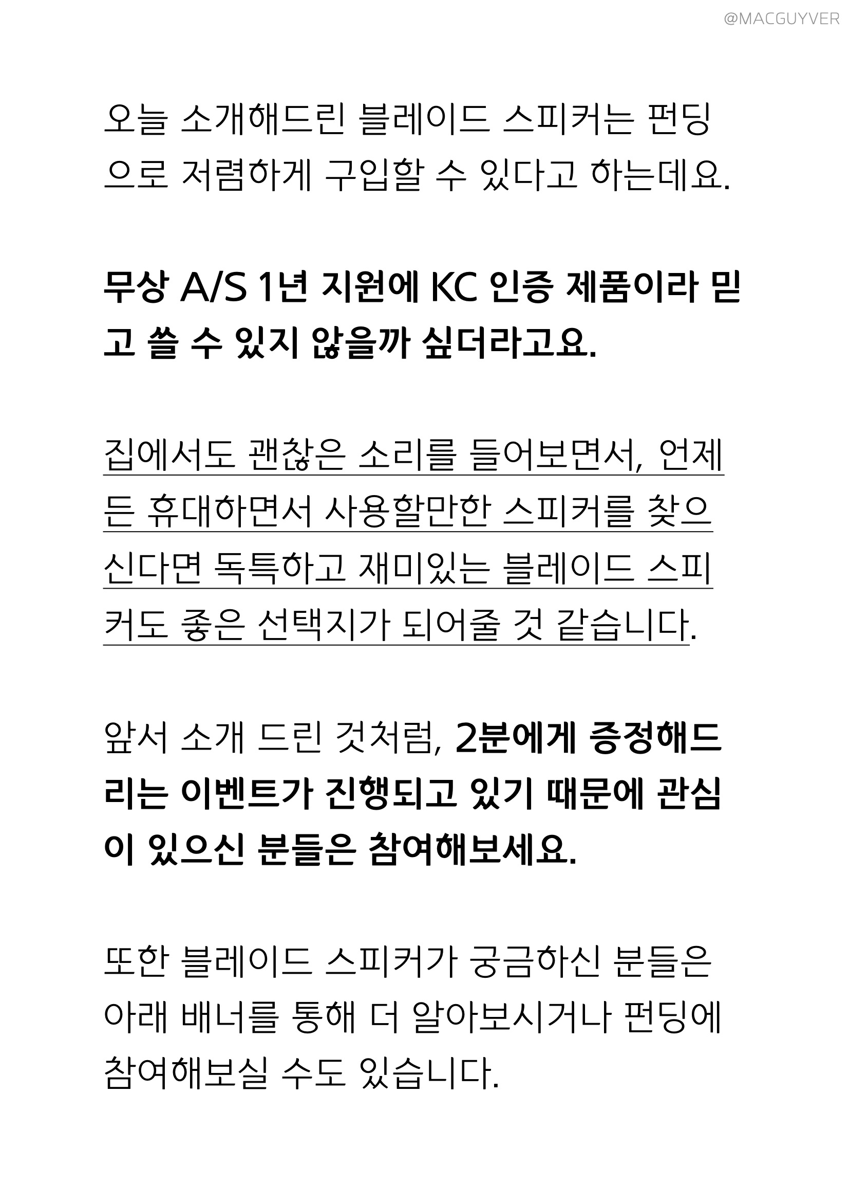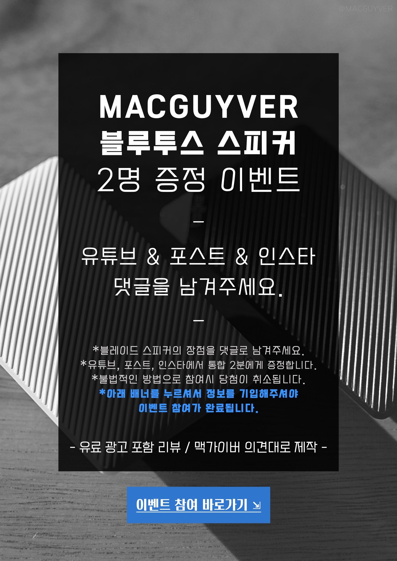 오늘 블루투스 스피커로 소개해드린 블레이드 스피커는 펀딩으로 저렴하게 구입해볼 수 있다고 하는데요. 미니스피커 무상 A/S 1년 지원에 KC 인증 제품이라 믿고 쓸 수 있지 않을까 싶더라고요. 집에서도 괜찮은 소리를 들어보면서, 휴대용스피커로 언제든 휴대하면서 사용할만한 스피커를 찾으신다면 독특하고 재미있는 블레이드 스피커도 좋은 선택지가 되어줄 것 같습니다. 앞서 소개 드린 것처럼, 2분에게 초소형 스피커를 증정해드리는 이벤트가 진행되고 있기 때문에 관심이 있으신 분들은 참여해보세요. 또한 블레이드 스피커가 궁금하신 분들은 아래 배너를 통해 더 알아보시거나 펀딩에 참여해보실 수도 있습니다.