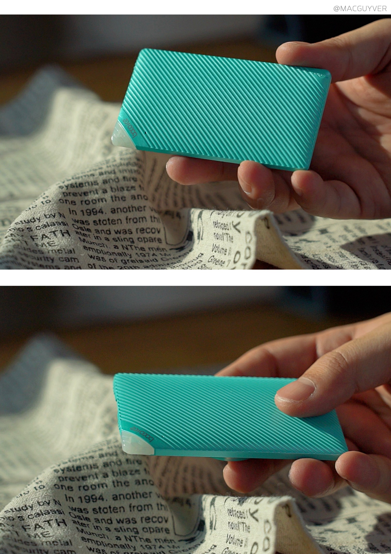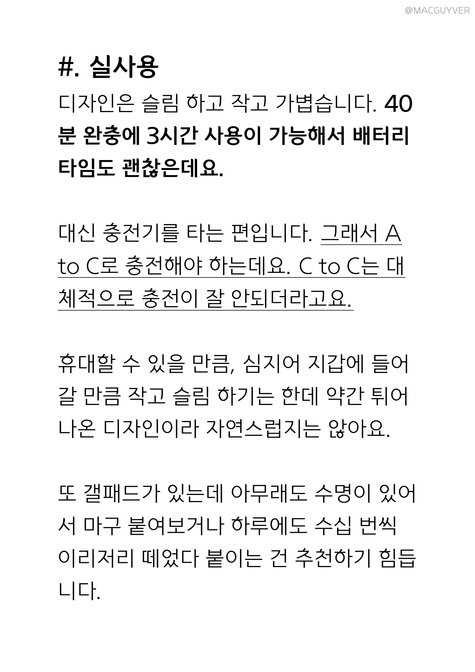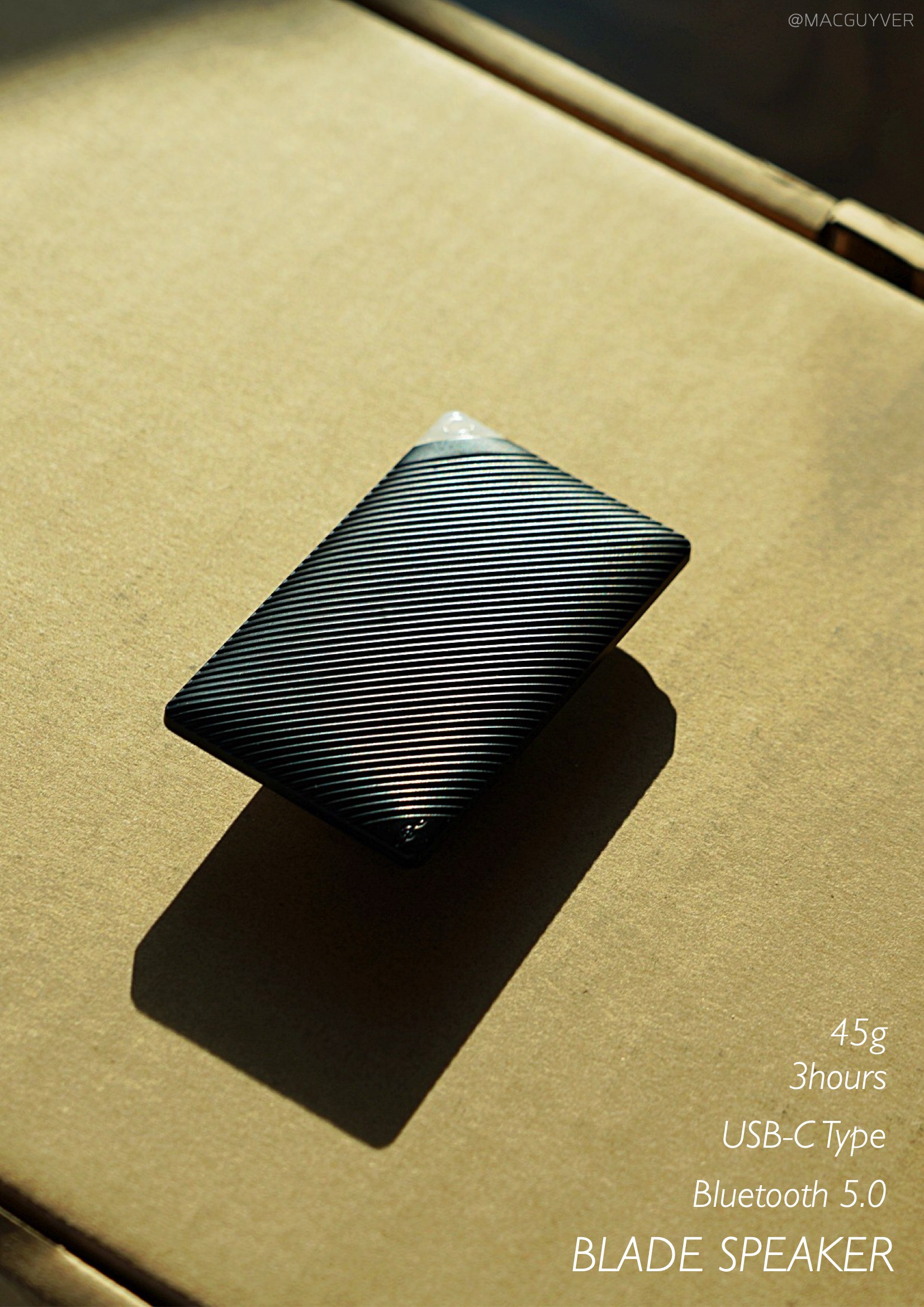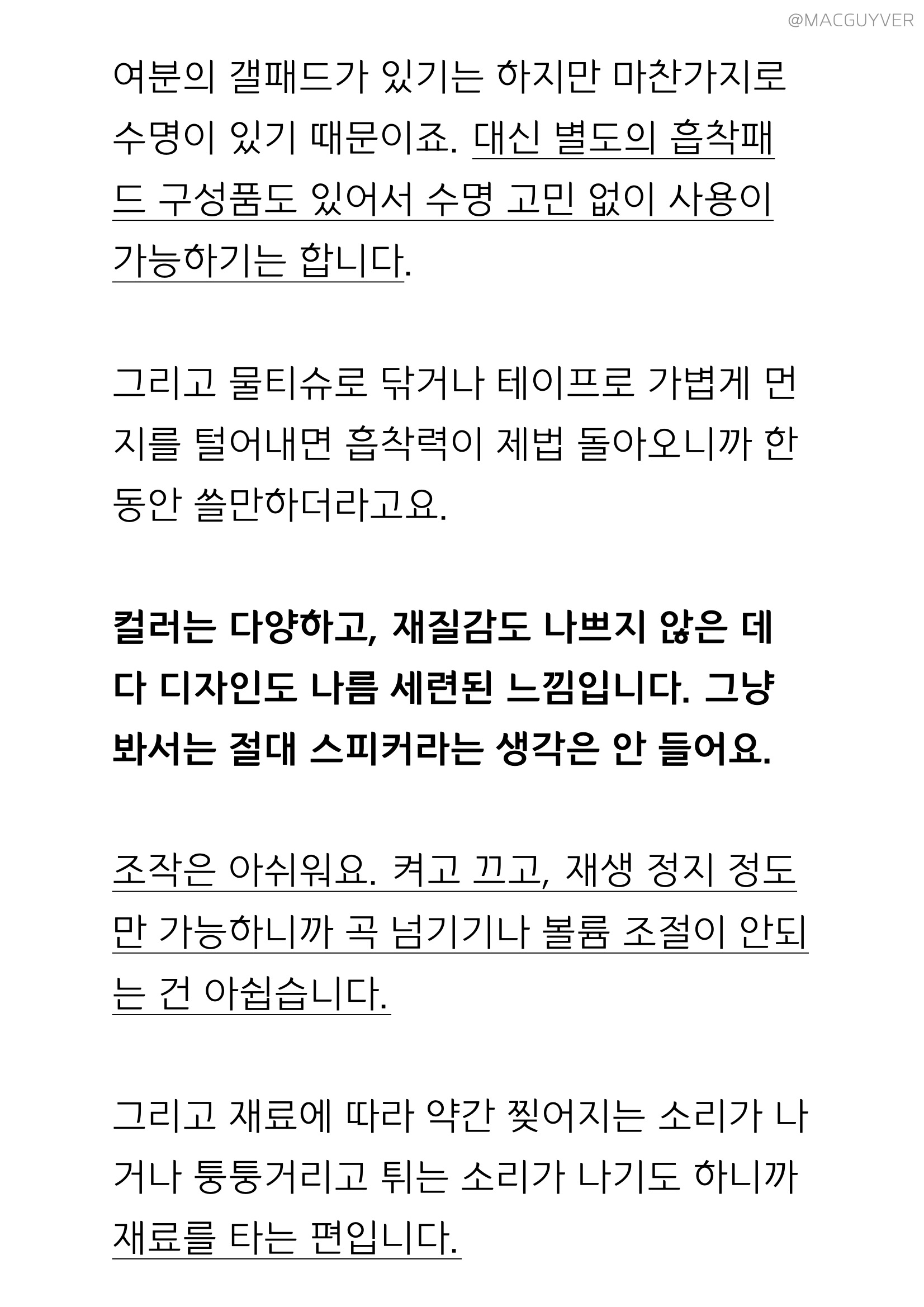 #. 블루투스 스피커 실사용 디자인은 슬림 하고 작고 가볍습니다. 40분 완충에 3시간 사용이 가능해서 배터리 타임도 괜찮은데요. 대신 충전기를 타는 편입니다. 그래서 A to C로 충전해야 하는데요. C to C는 대체적으로 충전이 잘 안되더라고요. 블레이드는 휴대할 수 있을 만큼, 심지어 지갑에 들어갈 만큼 작고 슬림 하기는 한데 약간 튀어나온 디자인이라 마냥 편하지는 않습니다. 또 갤패드가 있는데 아무래도 수명이 있어서 마구 붙여보거나 하루에도 수십 번씩 이리저리 떼었다 붙이는 건 추천하기 힘듭니다. 여분의 갤패드가 있기는 하지만 마찬가지로 수명이 있기 때문이죠. 대신 미니스피커에 별도의 흡착패드 구성품도 있어서 수명 고민 없이 사용이 가능하기는 합니다. 그리고 물티슈로 닦거나 테이프로 가볍게 먼지를 털어내면 제법 흡착력이 돌아오니까 걱정 없이 한동안 쓰는 것도 가능하더라고요. 블루투스 스피커 컬러는 다양하고, 재질감도 나쁘지 않은 데다 디자인도 나름 세련된 느낌입니다. 초소형 스피커라 그냥 봐서는 절대 스피커라는 생각은 안 드는데요. 조작은 아쉬워요. 켜고 끄고, 재생 정지 정도만 가능하니까 곡 넘기기나 볼륨 조절이 안되는 건 아쉽습니다. 그리고 재료에 따라 약간 찢어지는 소리가 나거나 퉁퉁거리고 튀는 소리가 나기도 하니까 재료를 타는 편입니다.