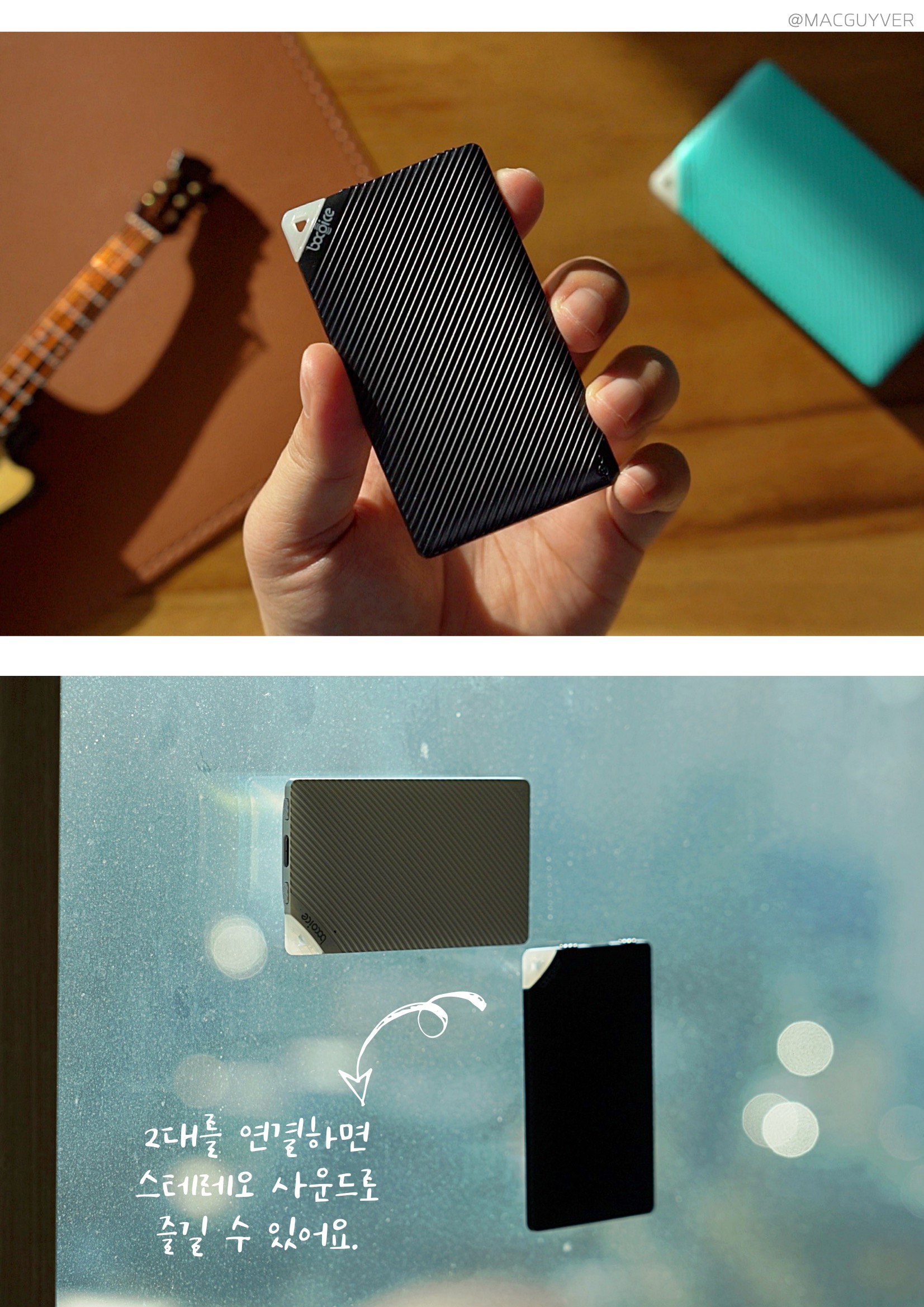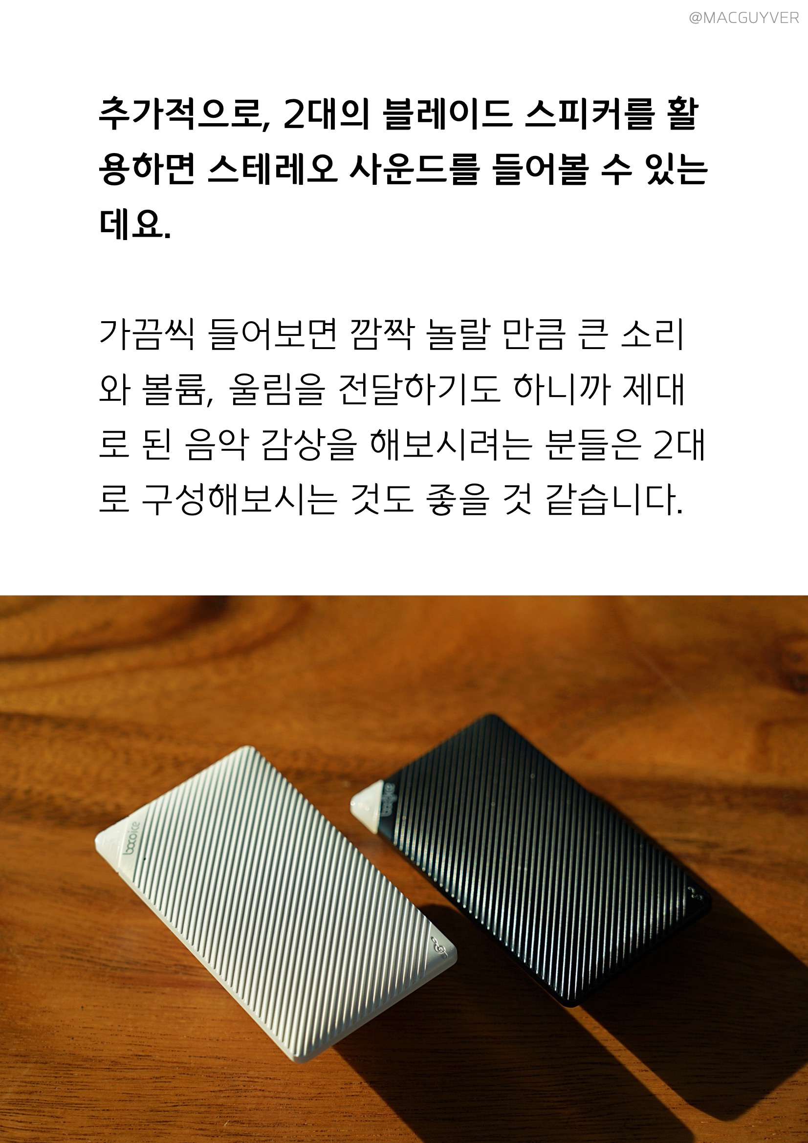 #. 골전도 스피커 사운드 블루투스 스피커의 가장 중요한 사운드는 어떤 재료에 부착하는지에 따라 소리의 성향이나 느낌이나 울림이 완전히 달라집니다. 장점이자 단점인데요. 미니스피커로 새로운 소리를 발견할 수도 있고 취향에 따라 EQ 설정을 하는 것처럼 자유자재로 바꿔서 부착해볼 수 있기 때문이죠. 하지만 그만큼 언제나 같은 소리를 듣기는 힘들 수 있고, 적절한 재료가 없다면 소리를 만족스럽게 듣기는 어렵기도 합니다. 제가 평가하기에 조건만 잘 맞춰진다면 이만한 소리를 들려주는 게 신기할 정도로 엄청난 소리를 내주더라고요. 그러니까, 작은 나무 상자에 골전도 스피커를 연결하니까 베이스가 엄청납니다. 골전도라 울림이 커지고 전체적으로 묵직하면서 단단한 소리를 내주는 거죠. 반대로 블레이드 스피커 제품 박스를 활용해서 부착해보면 음의 분리가 명확합니다. 그래서 블레이드가 고음 따로 중저음 따로, 베이스 따로 소리를 내주니까 선예도가 높아지더라고요. 이외에는 후드에 부착하는 것도 추천드리고, 방 안과 밖에서 모두 들을 수 있는 나무 문에 부착하는 것도 좋습니다. 아마 처음에는 휴대용스피커로 다양한 장소에 스테레오스피커를 부착해보면서 울림이나 소리를 들어보는 재미에 한동안 여기저기 붙여볼 것도 같네요. 추가적으로, 2대의 블레이드 골전도 스피커를 활용하면 스테레오 사운드를 들어볼 수 있는데요. 초소형 스피커지만 가끔씩 들어보면 깜짝 놀랄 만큼 큰 소리와 볼륨, 울림을 전달하기도 하니까 스테레오스피커로 제대로 된 음악 감상을 해보시려는 분들은 2대로 구성해보시는 것도 좋을 것 같습니다.