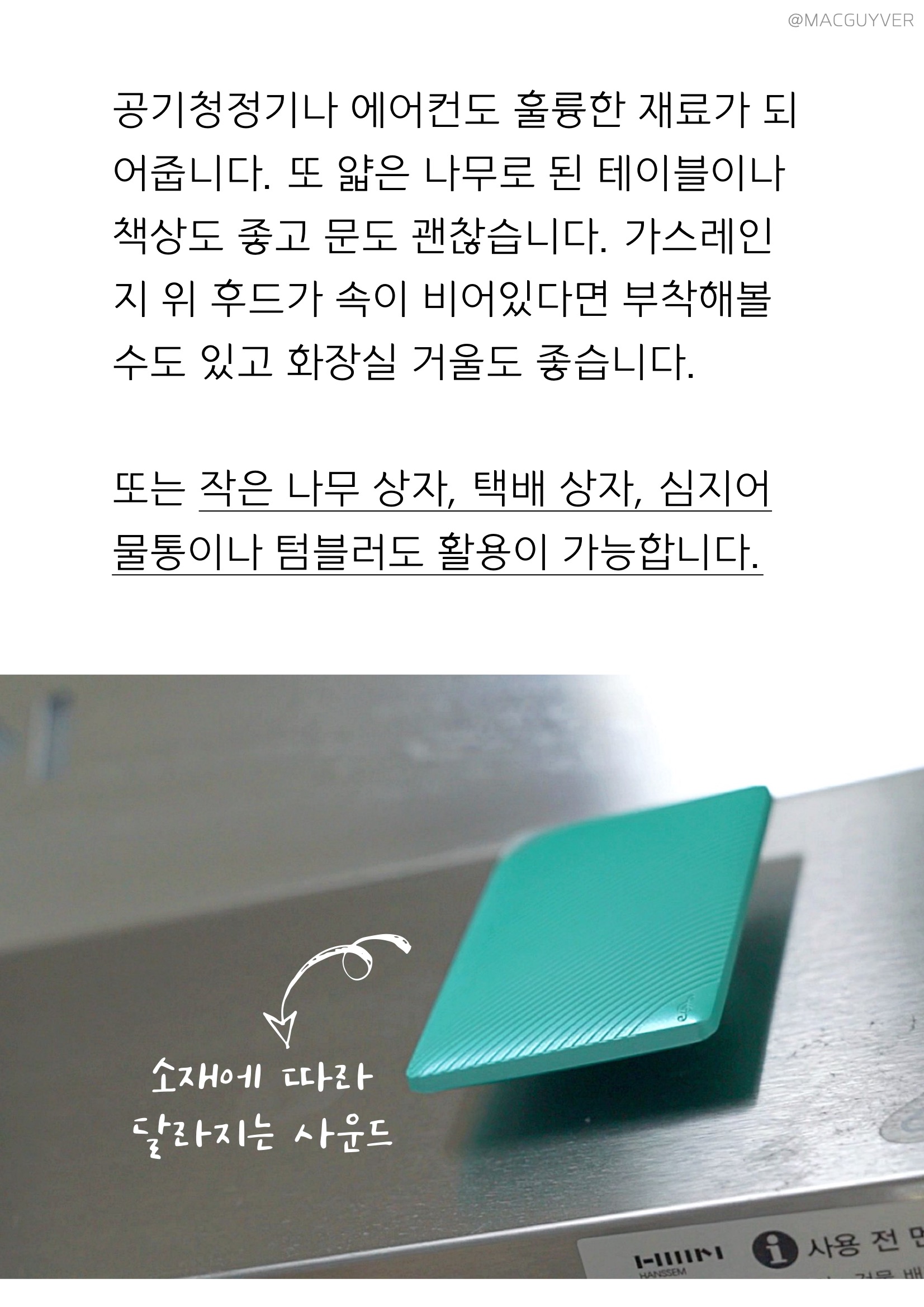 #. 블레이드 골전도 스피커 가장 먼저, 골전도 스피커란 무엇일까요? 간단히 말해서, 공기를 활용한 음파 전송이 아닌, 진동을 활용한 스피커 효과를 내는 스피커를 뜻합니다. 그래서 소리의 울림이 작은 크기에서는 불가능할 정도로 놀라운 퍼포먼스를 보여주기도 하는데요. 어디에 부착되는지에 따라서 골전도 울림이 달라집니다. 대체적으로 속이 비어있어서 울림을 충분히 낼 수 있는 도구나 재료들이 적합한데요. 공기청정기나 에어컨도 훌륭한 재료가 되어줍니다. 또 얇은 나무로 된 테이블이나 책상도 좋고 문도 괜찮습니다. 가스레인지 위 후드가 속이 비어있다면 부착해볼 수도 있고 화장실 거울도 좋습니다. 또는 작은 나무 상자, 택배 상자, 심지어 물통이나 텀블러도 골전도를 활용이 가능합니다.
