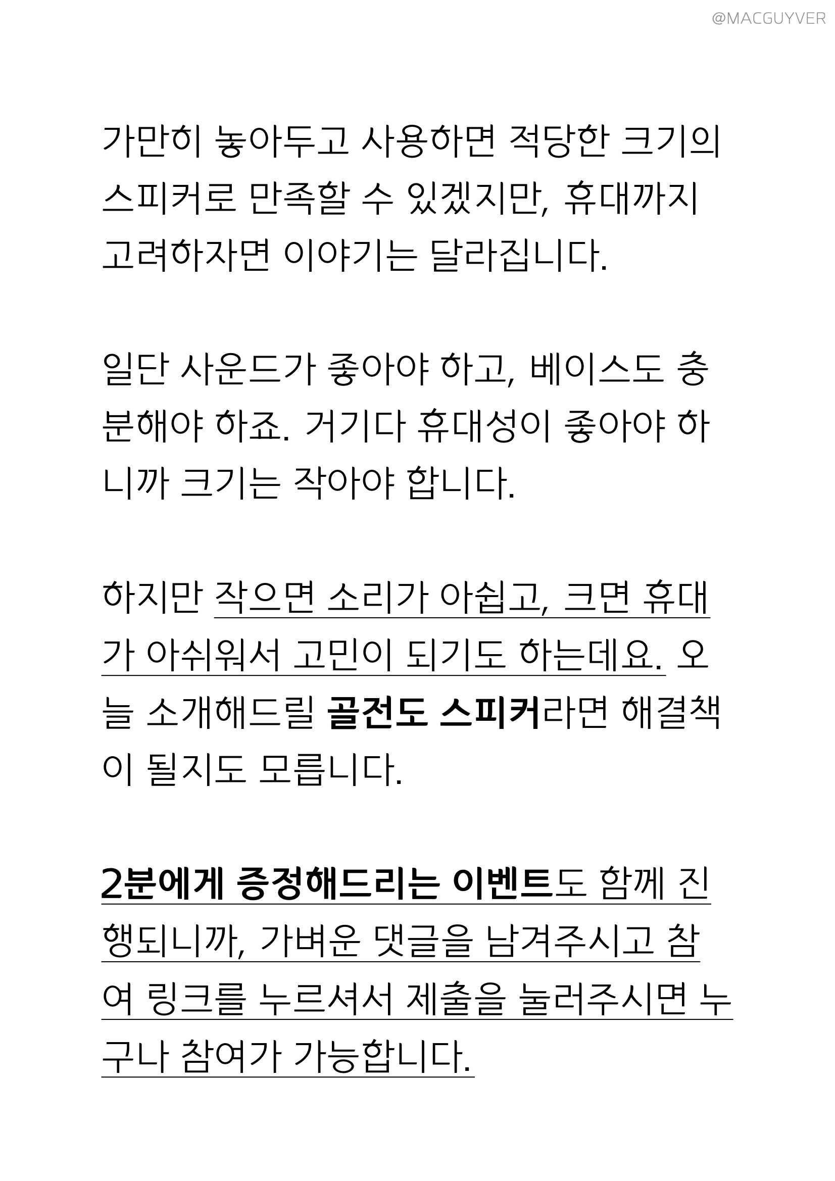 가만히 놓아두고 사용하면 적당한 크기의 스피커로 만족할 수 있겠지만, 휴대까지 고려하자면 이야기는 달라집니다. 일단 사운드가 좋아야 하고, 베이스도 충분해야 하죠. 거기다 휴대성이 좋아야 하니까 크기는 작아야 합니다. 하지만 작으면 소리가 아쉽고, 크면 휴대가 아쉬워서 고민이 되기도 하는데요. 오늘 소개해드릴 블루투스 스피커, 골전도 스피커라면 해결책이 될지도 모릅니다. 2분에게 블루투스 스피커를 증정해드리는 이벤트도 함께 진행되니까, 가벼운 댓글을 남겨주시고 참여 링크를 누르셔서 제출을 눌러주시면 누구나 참여가 가능합니다.