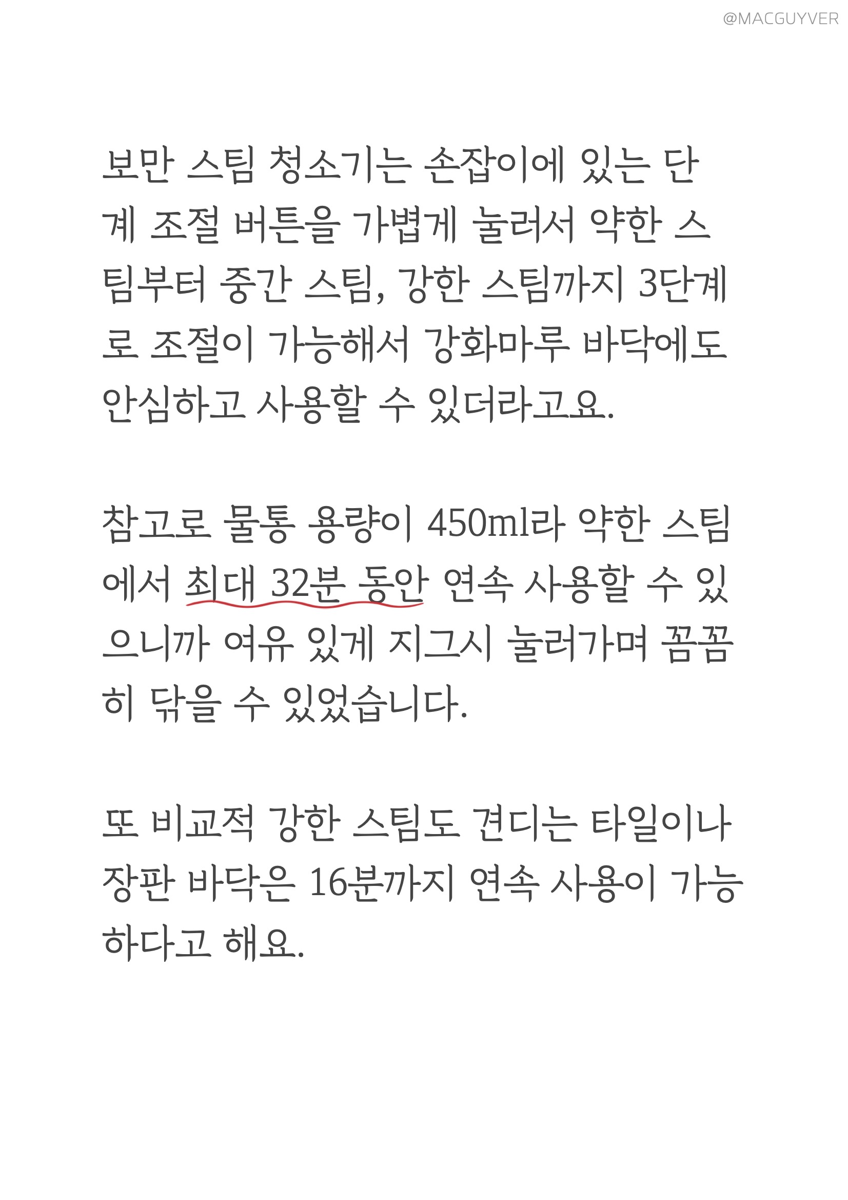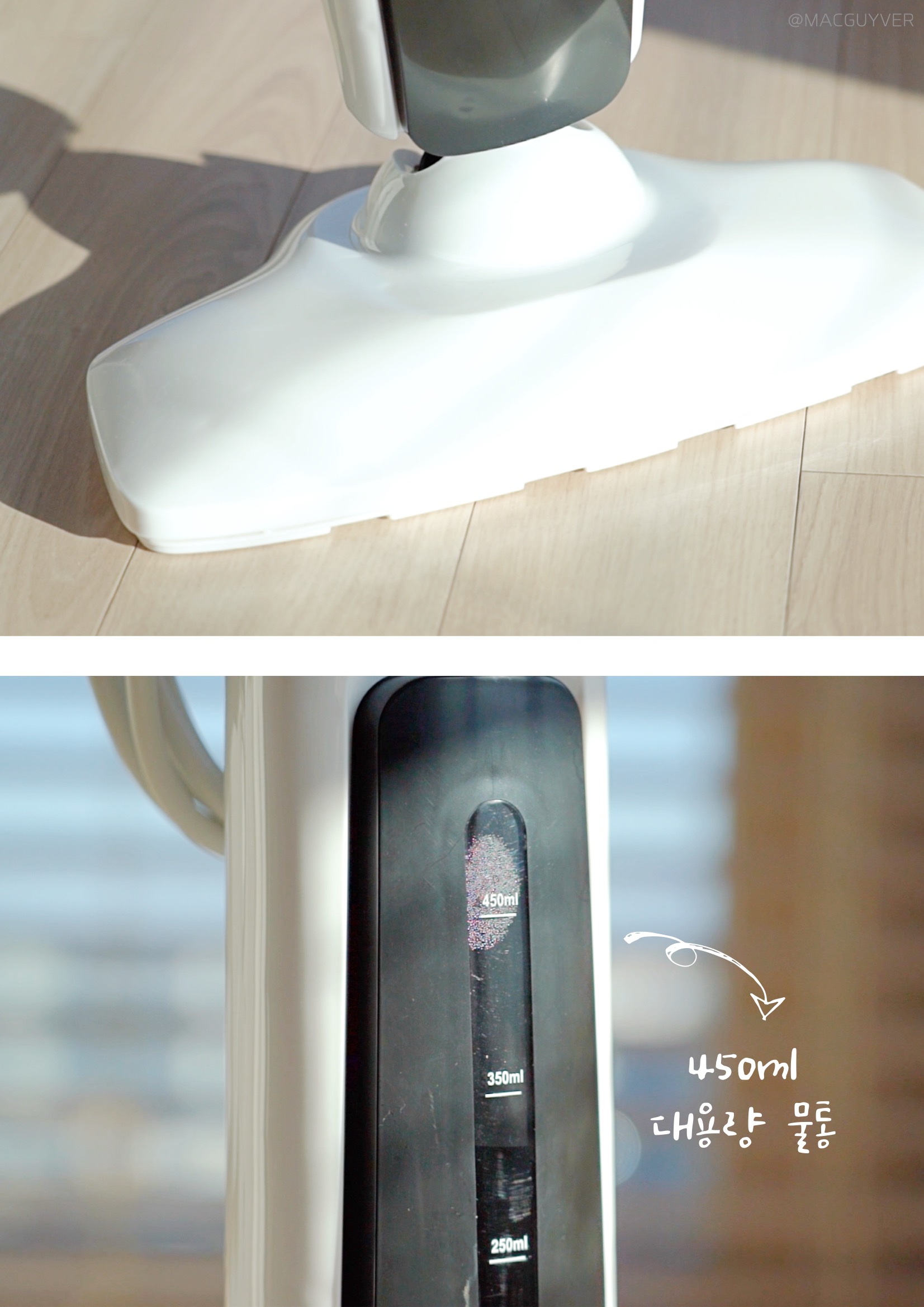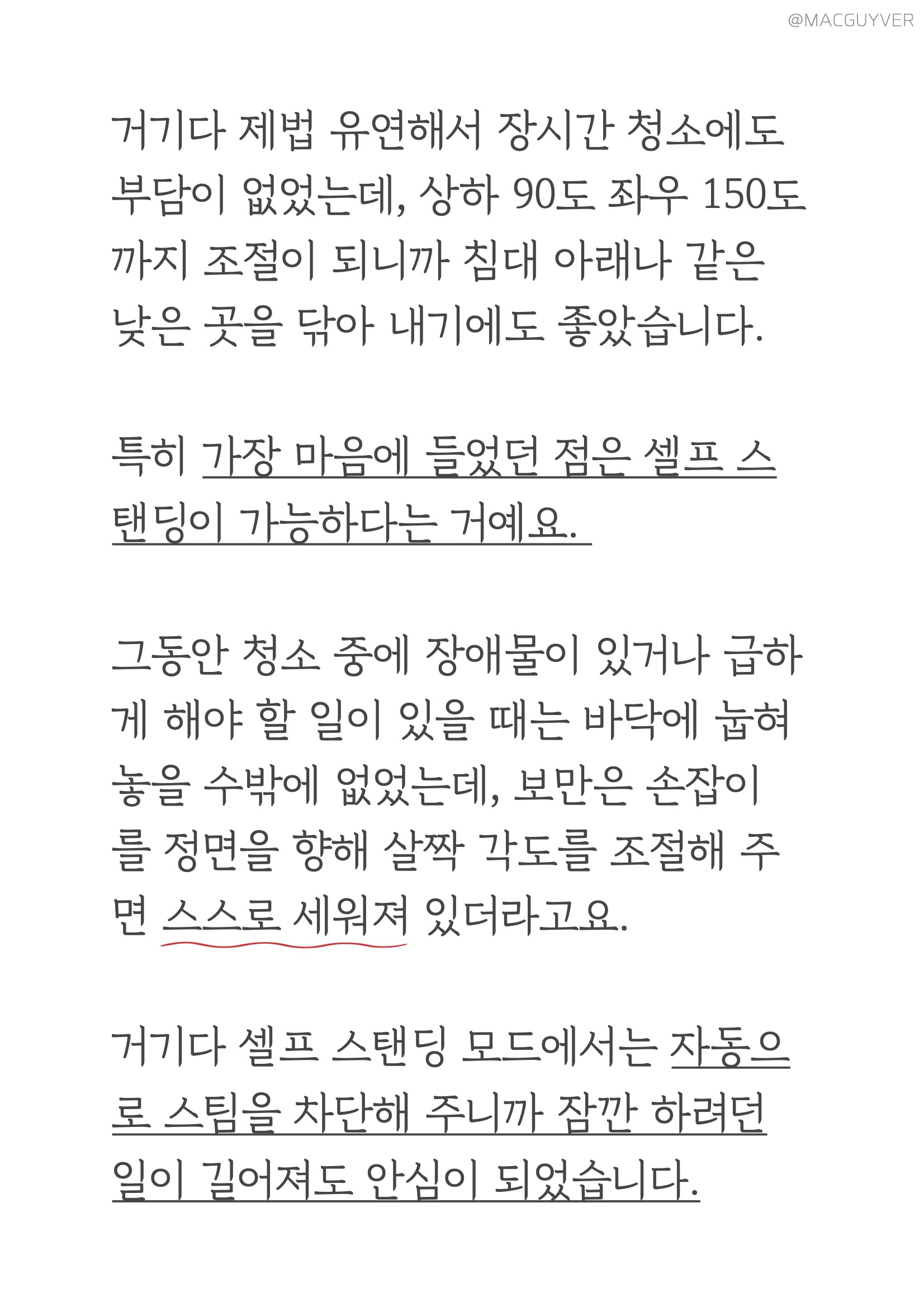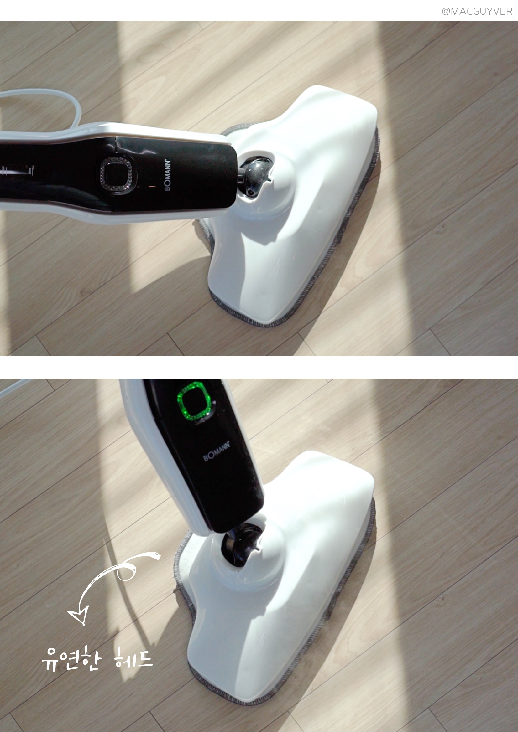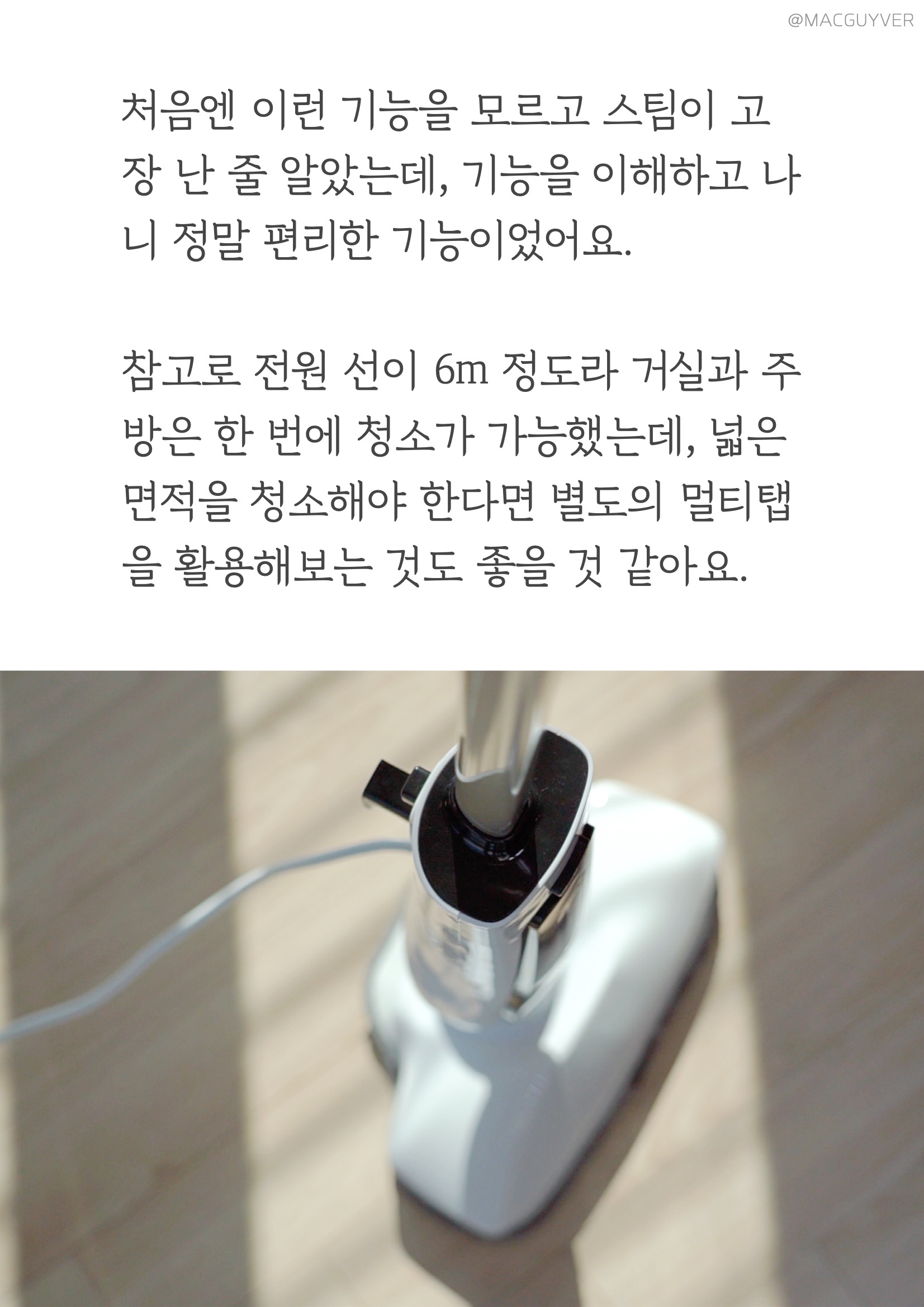 둘째, 스팀기 편의성이에요. 사실 기능이 아무리 좋아도 사용이 번거로우면 곧바로 창고행일 텐데, 보만 스팀청소기는 정말 편리하더라고요. 예열이 빨라서 전원을 켠 후 20초면 스팀 소리가 나니까 기다릴 필요 없이 거의 바로 사용할 수 있었어요. 혹시 스팀청소기라 무겁거나 청소속도가 느리지는 않을지 궁금하실 텐데요. 가볍고 부드러워서 원하는 속도로 청소를 할 수 있더라고요. 일반 물걸레 청소포처럼 지나가다가 찌든 때나 얼룩이 있다면 좀 더 지그시 눌러 가며 여유 있게 청소하는 거죠. 거기다 제법 유연해서 장시간 청소에도 부담이 없었는데, 상하 90도 좌우 150도까지 조절이 되니까 침대 아래나 같은 낮은 곳을 닦아 내기에도 좋았습니다. 특히 가장 마음에 들었던 점은 셀프 스탠딩이 가능하다는 거예요. 그동안 청소 중에 장애물이 있거나 급하게 해야 할 일이 있을 때는 바닥에 눕혀 놓을 수밖에 없었는데, 보만 스팀 청소기는 손잡이를 정면을 향해 살짝 각도를 조절해 주면 스스로 세워져 있더라고요. 거기다 스팀기 셀프 스탠딩 모드에서는 자동으로 스팀을 차단해 주니까 잠깐 하려던 일이 길어져도 안심이 되었습니다. 처음엔 이런 기능을 모르고 스팀이 고장 난 줄 알았는데, 기능을 이해하고 나니 정말 편리한 기능이었어요. 참고로 유선청소기 전원 선이 6m 정도라 거실과 주방은 한 번에 청소가 가능했는데, 넓은 면적을 청소해야 한다면 별도의 멀티탭을 활용해보는 것도 좋을 것 같아요.