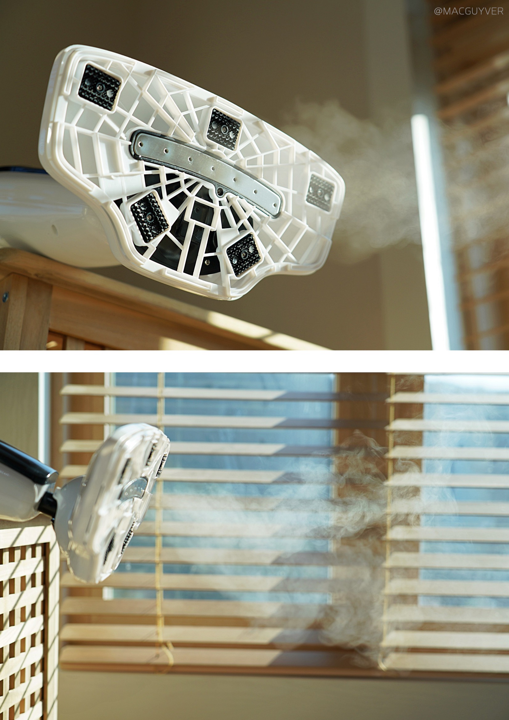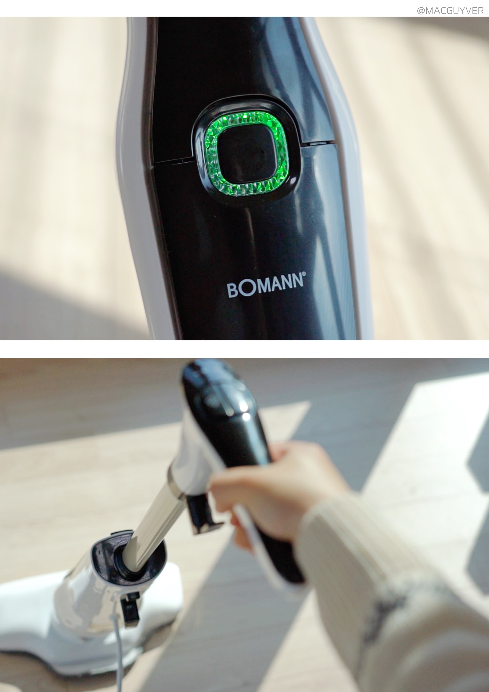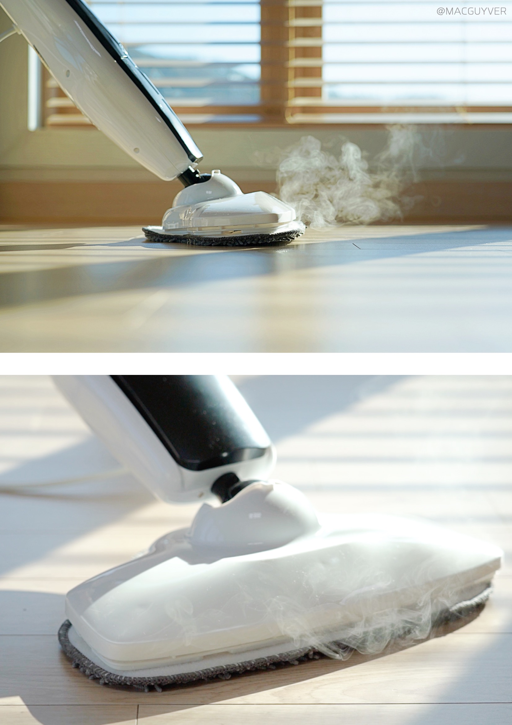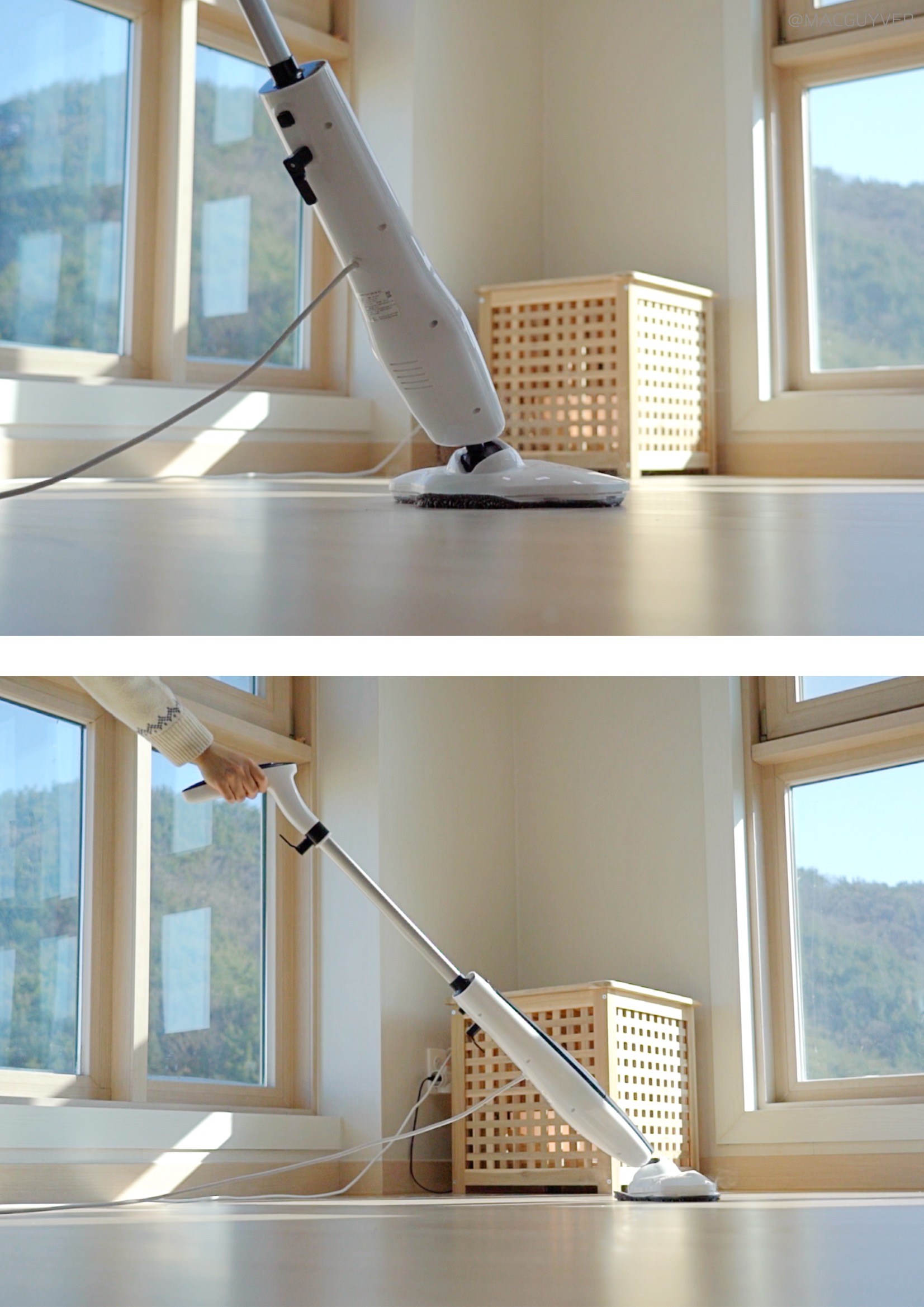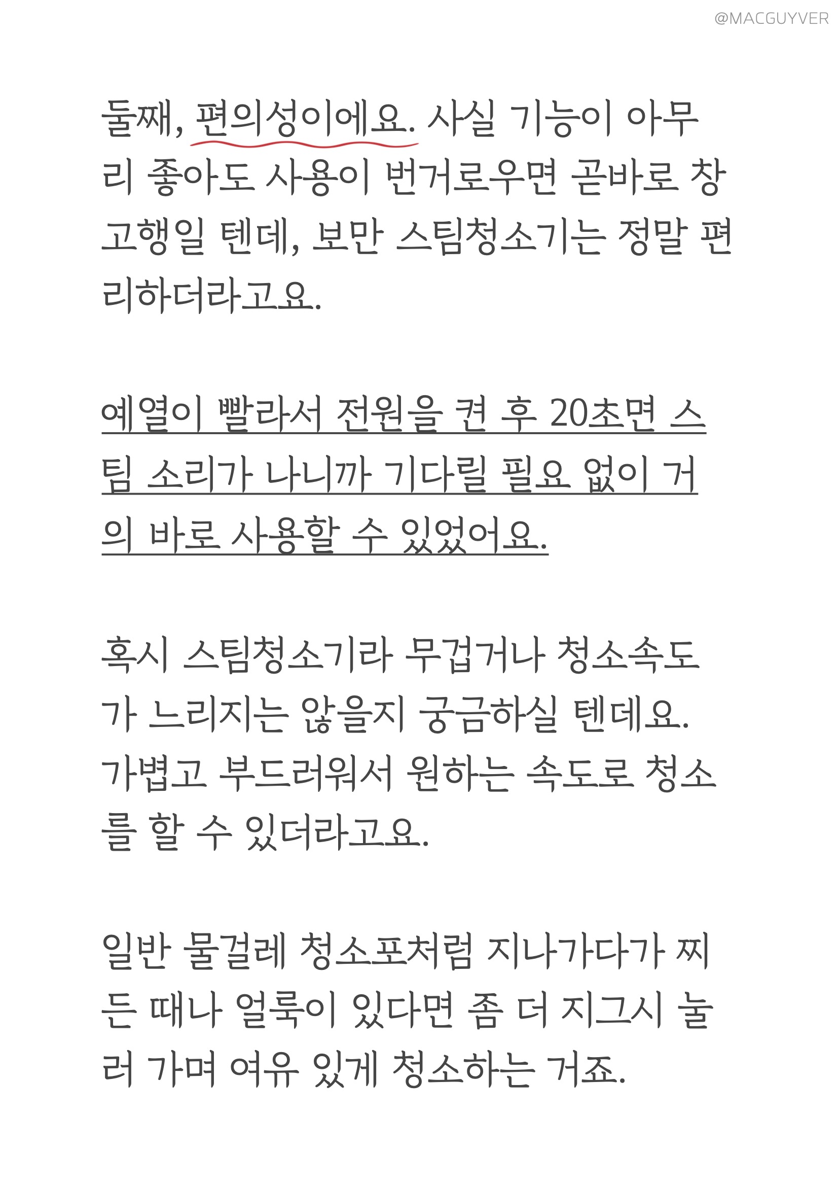 둘째, 스팀기 편의성이에요. 사실 기능이 아무리 좋아도 사용이 번거로우면 곧바로 창고행일 텐데, 보만 스팀청소기는 정말 편리하더라고요. 예열이 빨라서 전원을 켠 후 20초면 스팀 소리가 나니까 기다릴 필요 없이 거의 바로 사용할 수 있었어요. 혹시 스팀청소기라 무겁거나 청소속도가 느리지는 않을지 궁금하실 텐데요. 가볍고 부드러워서 원하는 속도로 청소를 할 수 있더라고요. 일반 물걸레 청소포처럼 지나가다가 찌든 때나 얼룩이 있다면 좀 더 지그시 눌러 가며 여유 있게 청소하는 거죠. 거기다 제법 유연해서 장시간 청소에도 부담이 없었는데, 상하 90도 좌우 150도까지 조절이 되니까 침대 아래나 같은 낮은 곳을 닦아 내기에도 좋았습니다. 특히 가장 마음에 들었던 점은 셀프 스탠딩이 가능하다는 거예요. 그동안 청소 중에 장애물이 있거나 급하게 해야 할 일이 있을 때는 바닥에 눕혀 놓을 수밖에 없었는데, 보만 스팀 청소기는 손잡이를 정면을 향해 살짝 각도를 조절해 주면 스스로 세워져 있더라고요. 거기다 스팀기 셀프 스탠딩 모드에서는 자동으로 스팀을 차단해 주니까 잠깐 하려던 일이 길어져도 안심이 되었습니다. 처음엔 이런 기능을 모르고 스팀이 고장 난 줄 알았는데, 기능을 이해하고 나니 정말 편리한 기능이었어요. 참고로 유선청소기 전원 선이 6m 정도라 거실과 주방은 한 번에 청소가 가능했는데, 넓은 면적을 청소해야 한다면 별도의 멀티탭을 활용해보는 것도 좋을 것 같아요.