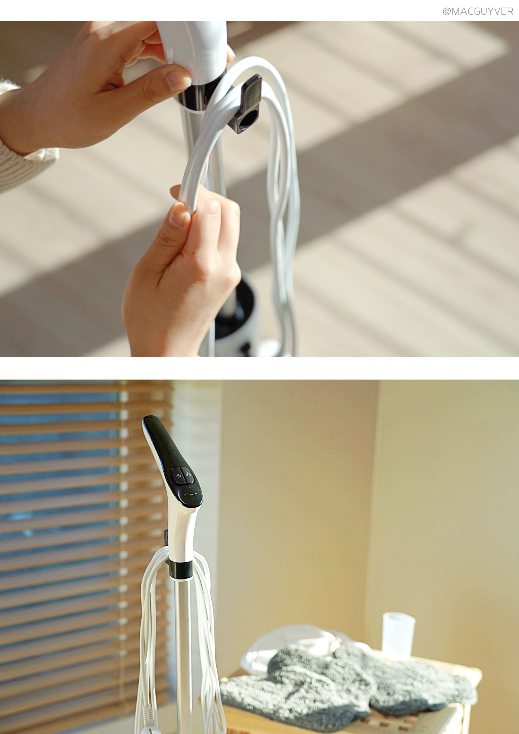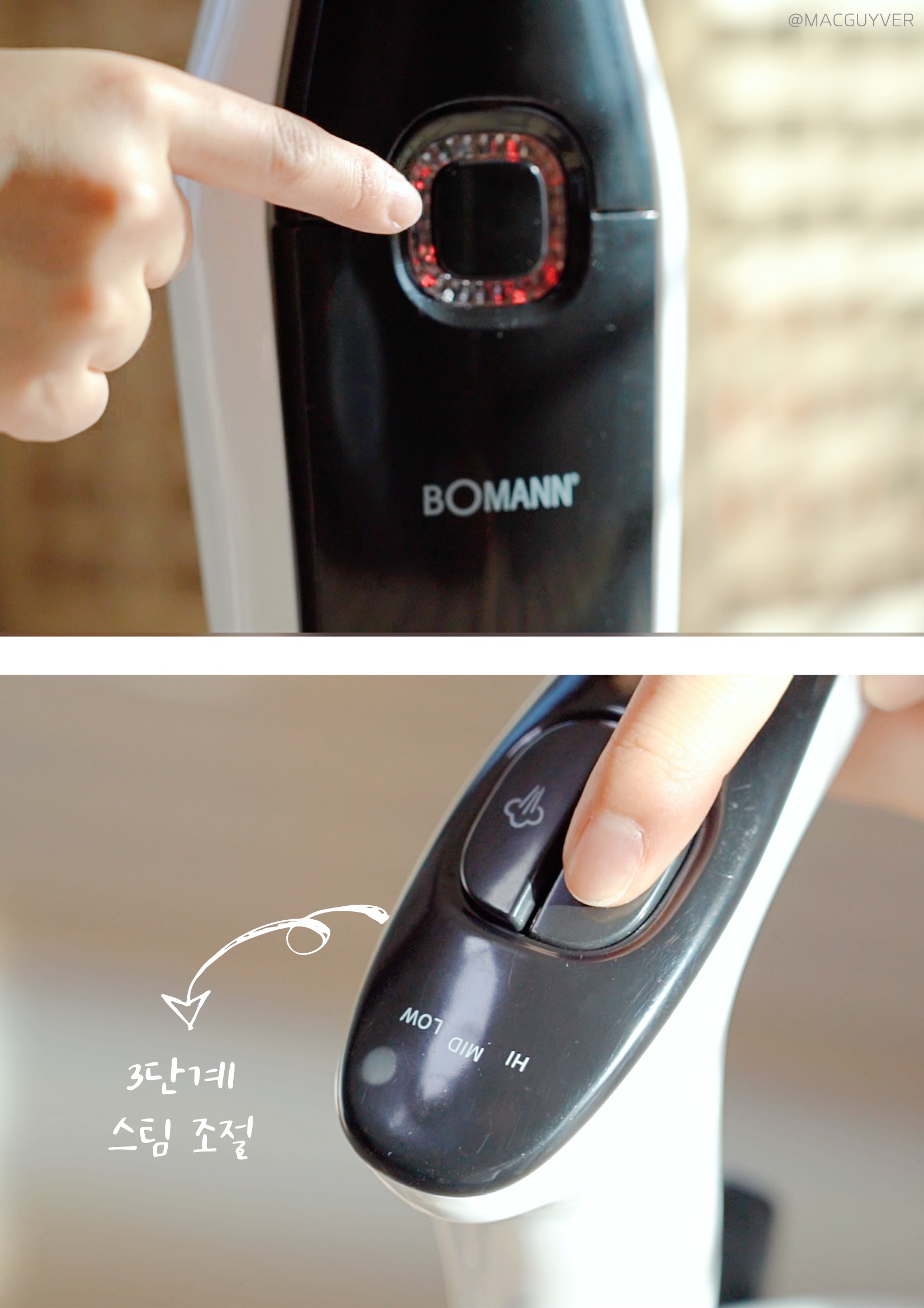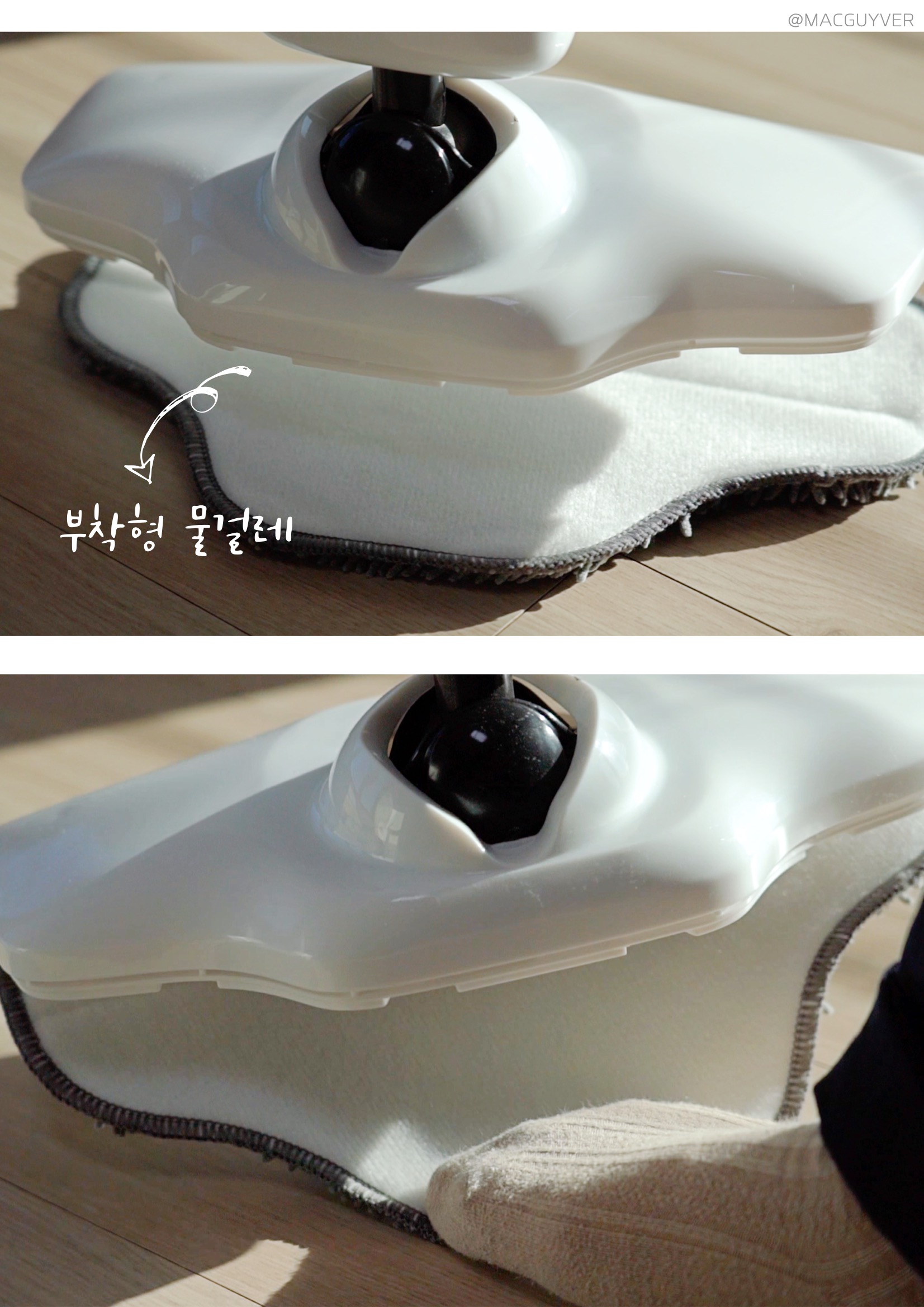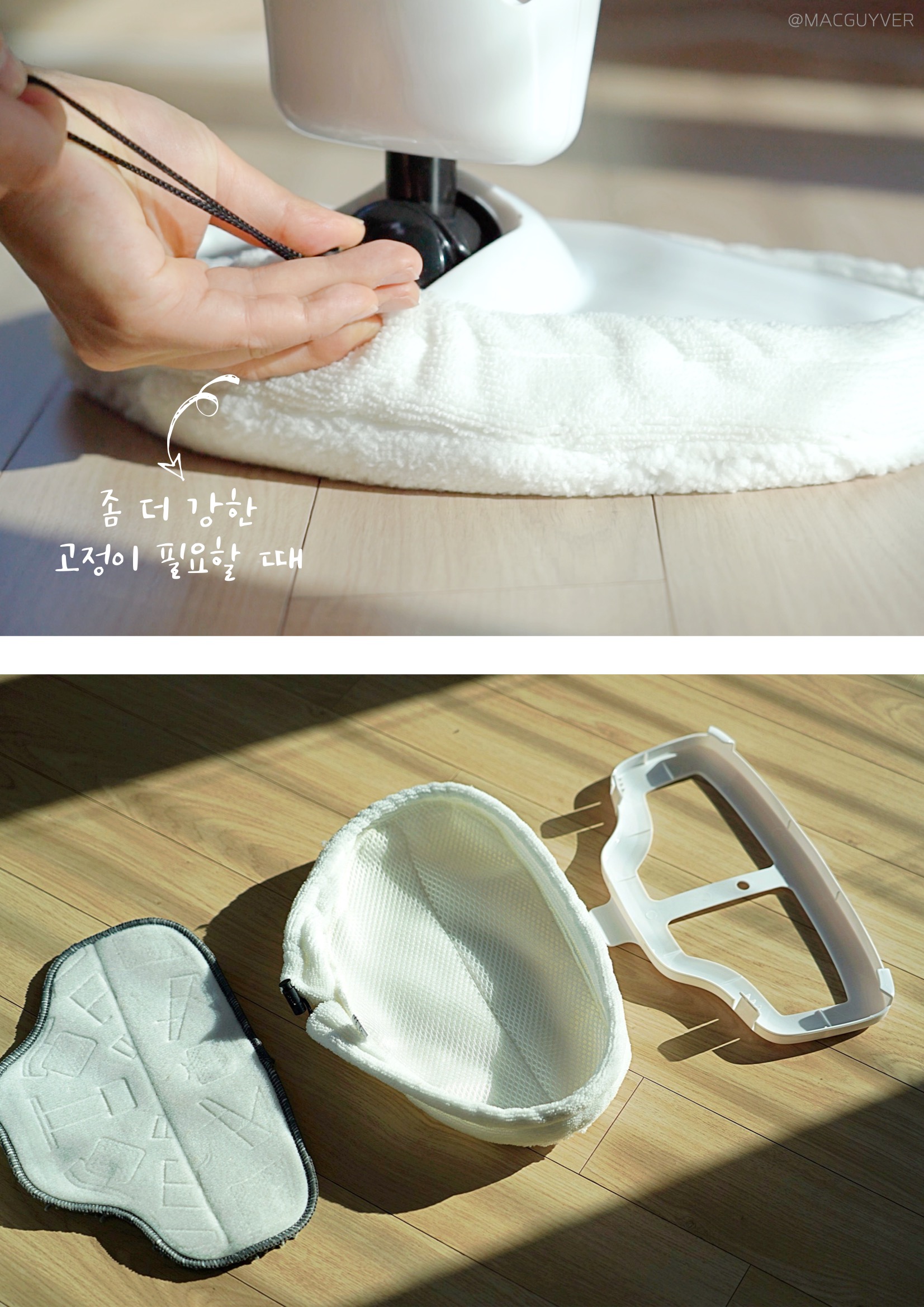 셋째, 스팀기 디자인이 심플하다는 점이에요. 화이트와 블랙 두 가지 컬러가 심플하면서도 유행을 타지 않을 것 같은 디자인이라 누가 사용하든 만족할 것 같은데요. 조작 버튼도 시인성이 좋고, 사용하기 적당한 위치더라고요. 끄고 켤 때만 사용하는 메인 전원은 본체에, 스팀량을 조절하는 세기 버튼은 손잡이에 있으니까 바로바로 사용할 수 있거든요. 무엇보다 물걸레는 헤드보다 살짝 여유 있게 만들어져서 탈부착이 간편했고, 때가 타기 쉬운 바닥면은 어두운 그레이 톤으로 되어있으니까 부담 없이 사용할 수 있었습니다. 참고로 4장의 부착형 걸레 패드 외에 카펫 보호 캡과 묶음형 걸레 패드가 구성품으로 제공되는데, 벨크로 타입의 걸레 패드가 발로 떼어낼 만큼 간편해서 자주 사용하게 되더라고요. 또 스팀기 후면에는 전원 선을 지저분하게 늘어뜨리지 않도록 유선청소기 위아래로 홀더도 있으니까, 정리해서 세워두면 보관도 간편합니다. 참고로 손잡이부의 버튼은 AAA 사이즈 건전지 2개가 필요하니까 미리 준비해두는 걸 추천드려요.