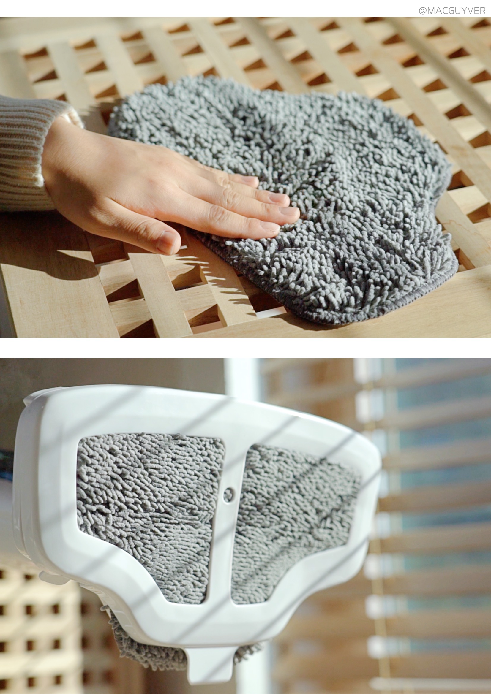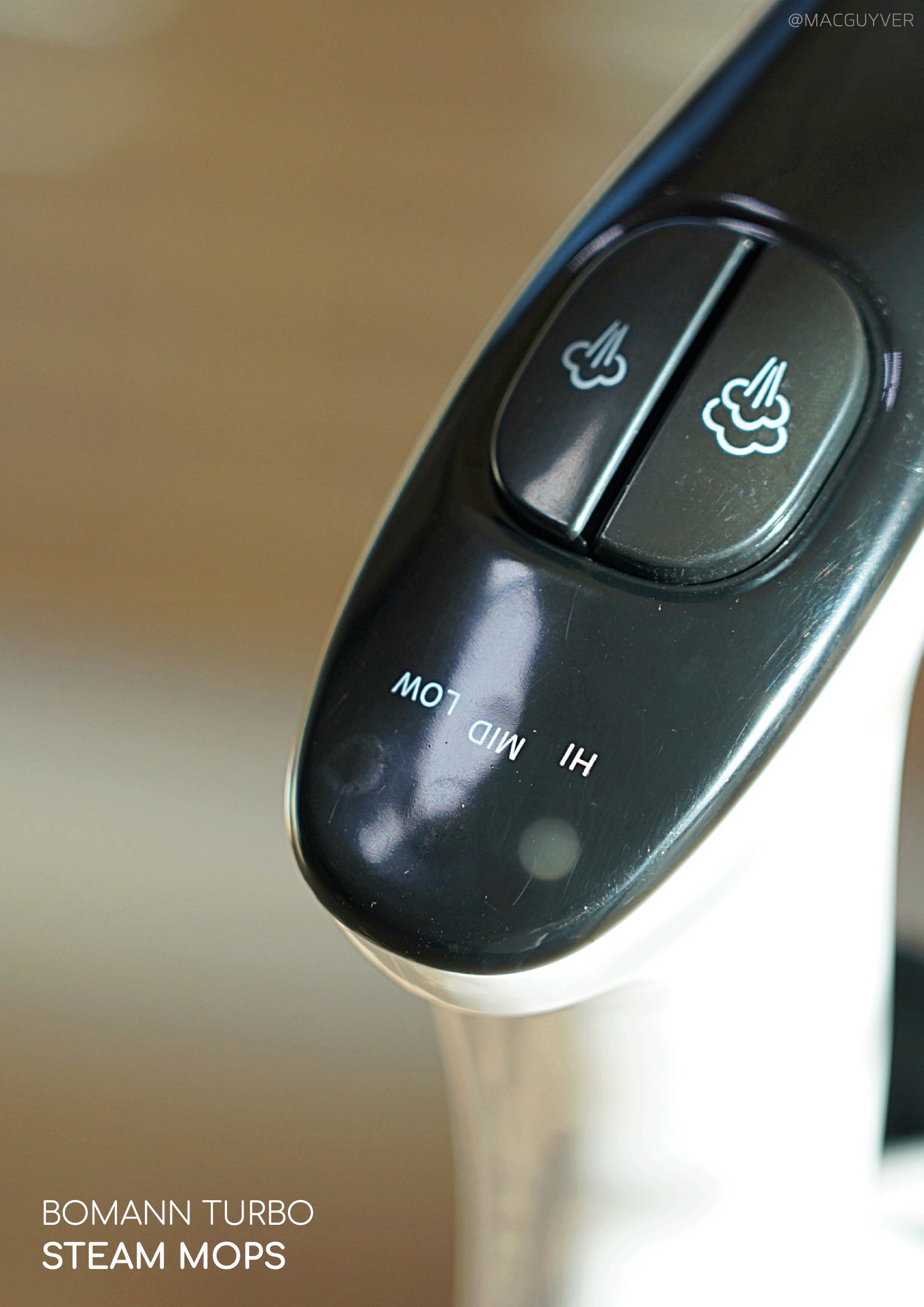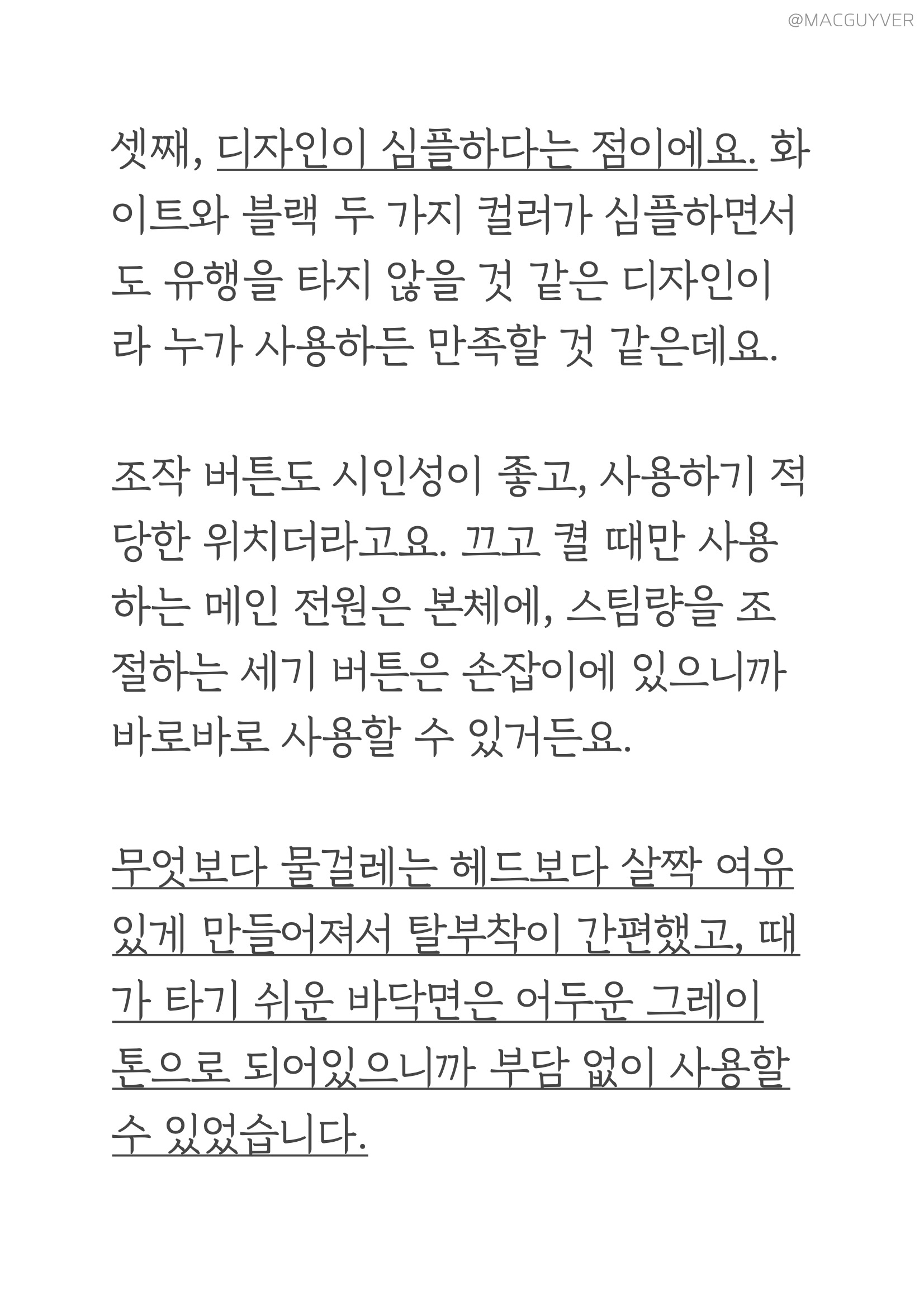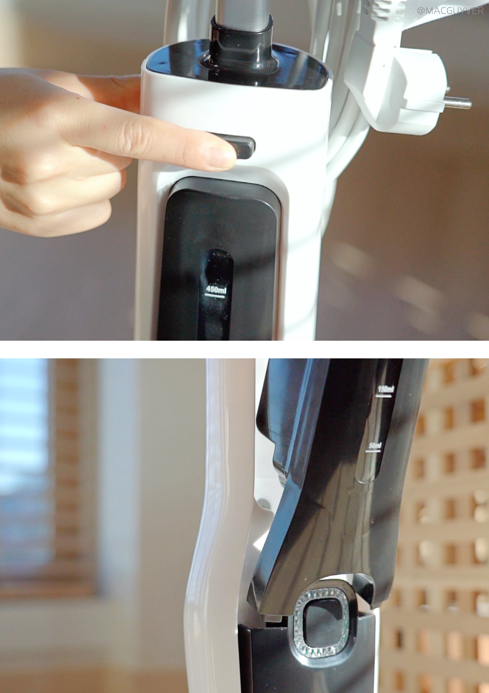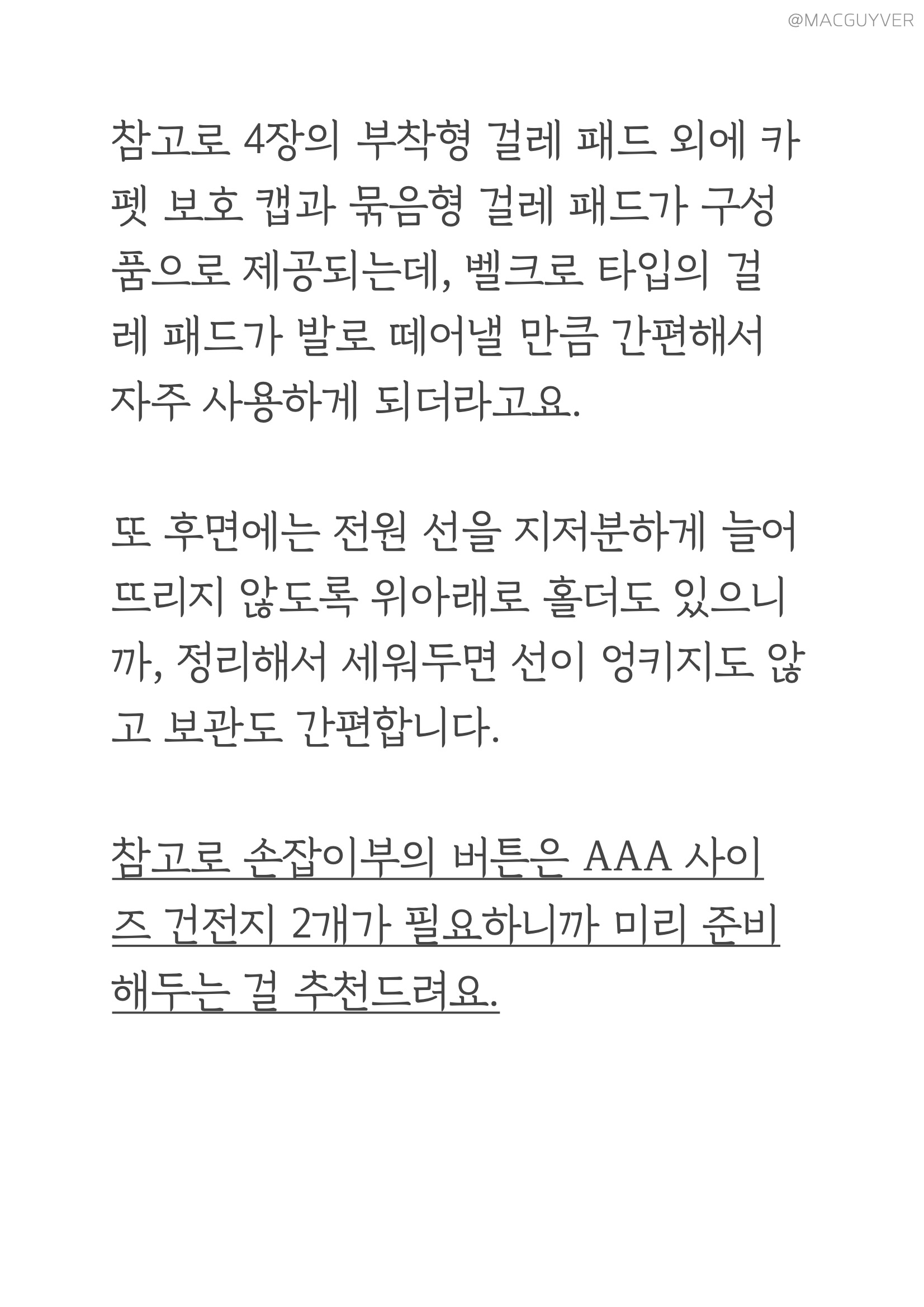 셋째, 스팀기 디자인이 심플하다는 점이에요. 화이트와 블랙 두 가지 컬러가 심플하면서도 유행을 타지 않을 것 같은 디자인이라 누가 사용하든 만족할 것 같은데요. 조작 버튼도 시인성이 좋고, 사용하기 적당한 위치더라고요. 끄고 켤 때만 사용하는 메인 전원은 본체에, 스팀량을 조절하는 세기 버튼은 손잡이에 있으니까 바로바로 사용할 수 있거든요. 무엇보다 물걸레는 헤드보다 살짝 여유 있게 만들어져서 탈부착이 간편했고, 때가 타기 쉬운 바닥면은 어두운 그레이 톤으로 되어있으니까 부담 없이 사용할 수 있었습니다. 참고로 4장의 부착형 걸레 패드 외에 카펫 보호 캡과 묶음형 걸레 패드가 구성품으로 제공되는데, 벨크로 타입의 걸레 패드가 발로 떼어낼 만큼 간편해서 자주 사용하게 되더라고요. 또 스팀기 후면에는 전원 선을 지저분하게 늘어뜨리지 않도록 유선청소기 위아래로 홀더도 있으니까, 정리해서 세워두면 보관도 간편합니다. 참고로 손잡이부의 버튼은 AAA 사이즈 건전지 2개가 필요하니까 미리 준비해두는 걸 추천드려요.