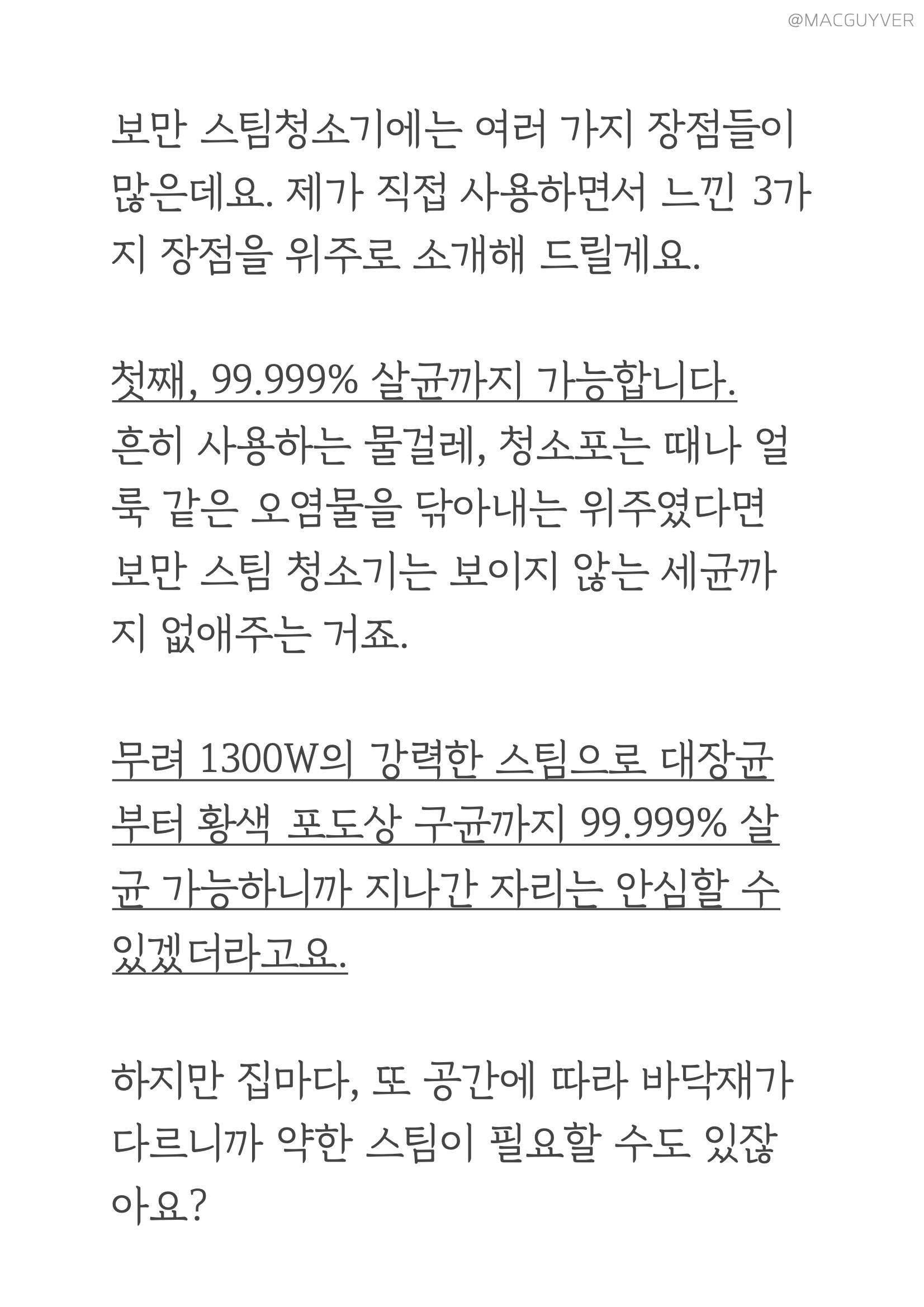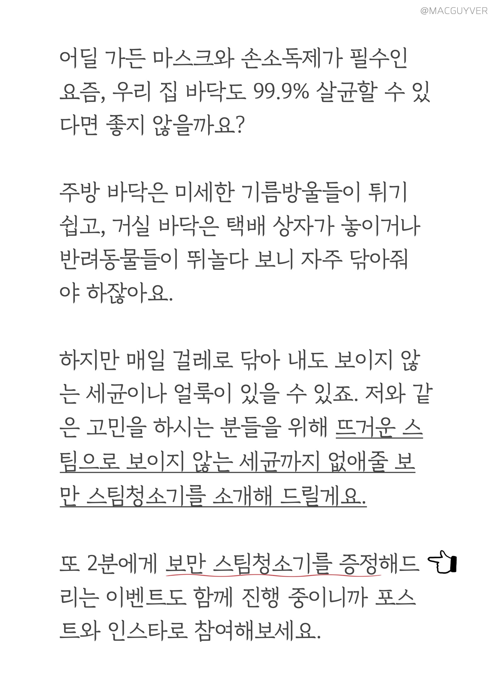 어딜 가든 마스크와 손소독제가 필수인 요즘, 우리 집 바닥도 99.9% 살균할 수 있다면 좋지 않을까요? 주방 바닥은 미세한 기름방울들이 튀기 쉽고, 거실 바닥은 택배 상자가 놓이거나 반려동물들이 뛰놀다 보니 자주 닦아줘야 하잖아요. 하지만 매일 걸레로 닦아 내도 보이지 않는 세균이나 얼룩이 있을 수 있죠. 그래서 저와 같은 고민을 하시는 분들을 위해 뜨거운 스팀으로 보이지 않는 세균까지 없애줄 보만 스팀청소기, 물걸레 청소기를 소개해 드릴게요. 또 2분에게 증정해드리는 이벤트도 함께 진행 중이니까 포스트와 인스타로 참여해보세요.