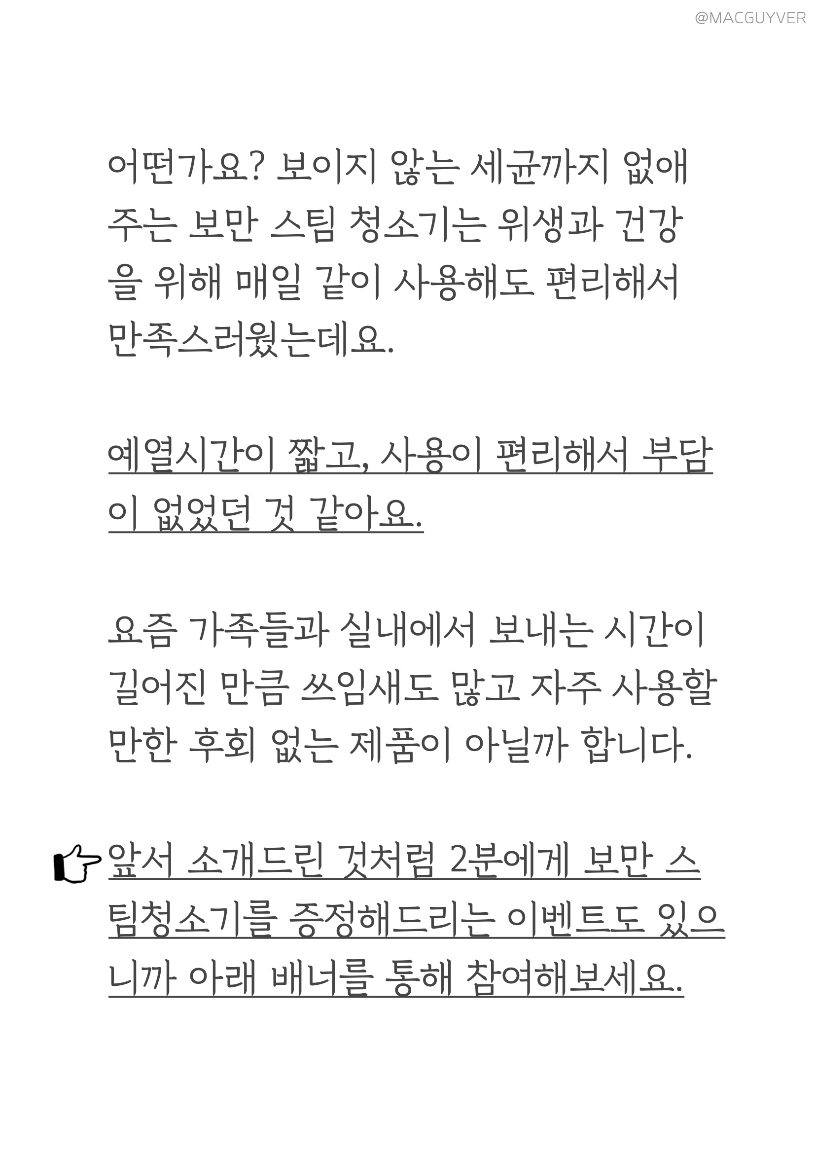 어떤가요? 보이지 않는 세균까지 없애주는 보만 스팀 청소기 SM1343B는 위생과 건강을 위해 매일 같이 사용해도 편리해서 만족스러웠는데요. 예열시간이 짧고, 사용이 편리해서 부담이 없었던 것 같아요. 요즘 가족들과 실내에서 보내는 시간이 길어진 만큼 쓰임새도 많고 자주 사용할만한 후회 없는 제품이 아닐까 합니다. 앞서 소개드린 것처럼 2분에게 보만 스팀청소기 SM1343B를 증정해드리는 이벤트도 있으니까 아래 배너를 통해 참여해보세요.