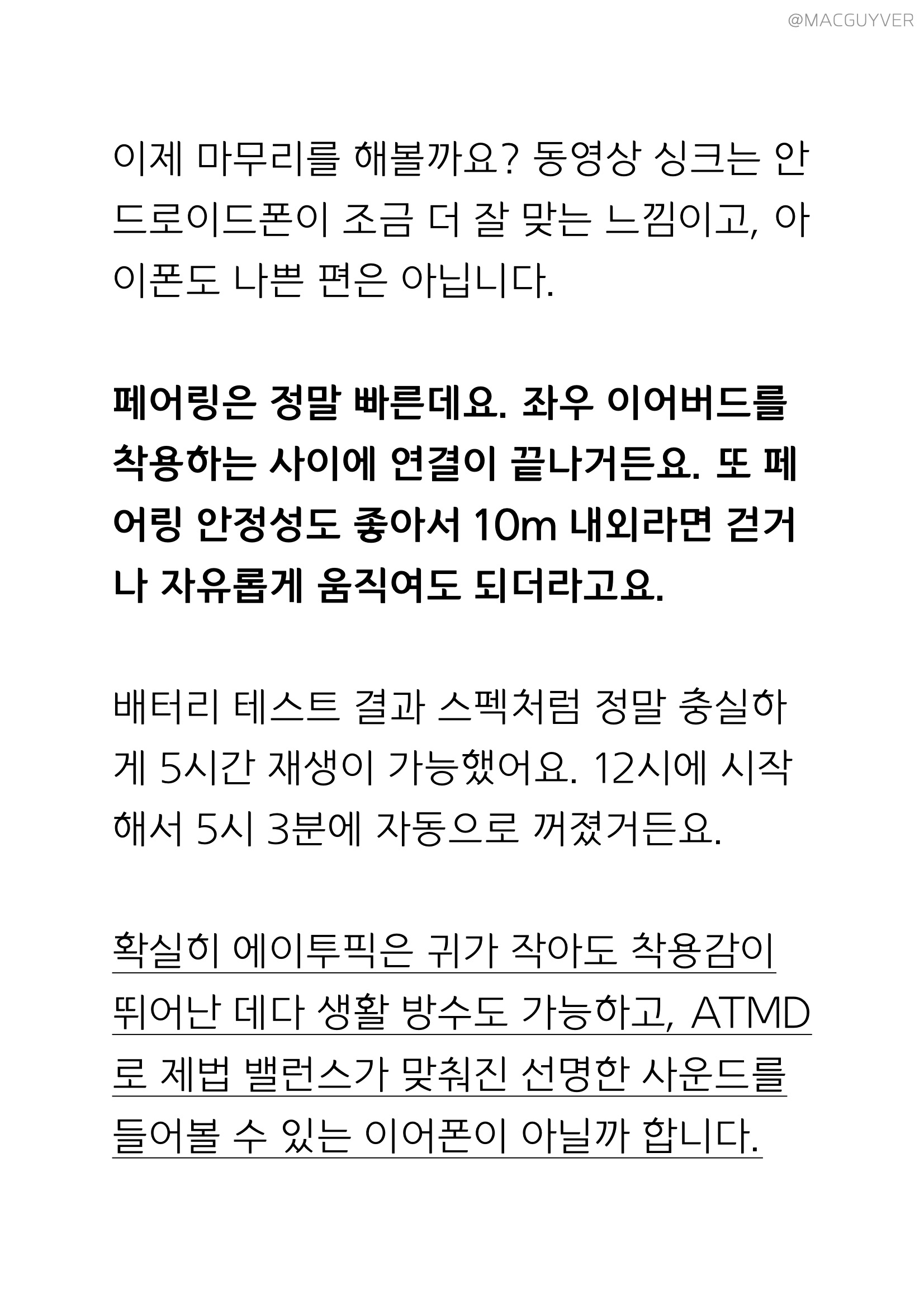 이제 에이투픽 블루투스 이어폰 소개 마무리를 해볼까요? 동영상 싱크는 안드로이드폰이 조금 더 잘 맞는 느낌이고, 아이폰도 나쁜 편은 아닙니다. 페어링은 정말 빠른데요. 좌우 이어버드를 착용하는 사이에 연결이 끝나거든요. 또 페어링 안정성도 좋아서 10m 내외라면 걷거나 자유롭게 움직여도 되더라고요. 가성비이어폰 배터리 테스트도 해보니까 스펙처럼 정말 충실하게 5시간 재생이 가능했어요. 12시에 시작해서 5시 3분에 자동으로 꺼졌거든요. 확실히 에이투픽은 귀가 작아도 착용감이 뛰어난데다 생활 방수도 가능하고, ATMD로 제법 밸런스가 맞춰진 선명한 사운드를 들어볼 수 있는 이어폰이 아닐까 합니다. 에이투픽 디자인도 심플하고 가벼운 무게감이라 선물용으로도, 커플템으로도 좋은 제품이 될 것 같아요. 앞서 소개드린 것처럼, 2분에게 에이투픽 무선 이어폰을 증정해드리는 에이투이어폰 댓글 이벤트가 진행됩니다. 또한 맥가이버 단독 30명 증정 댓글 이벤트도 참여가 가능하기 때문에 원하시는 분들은 아래 배너를 통해 신청 및 댓글 이벤트에 참여해보세요.