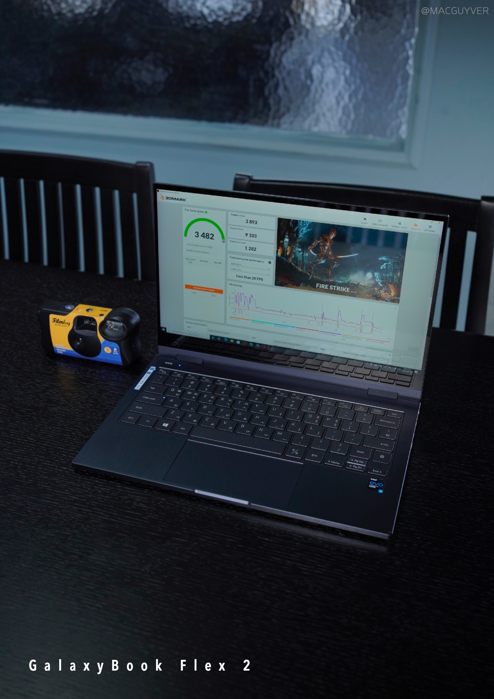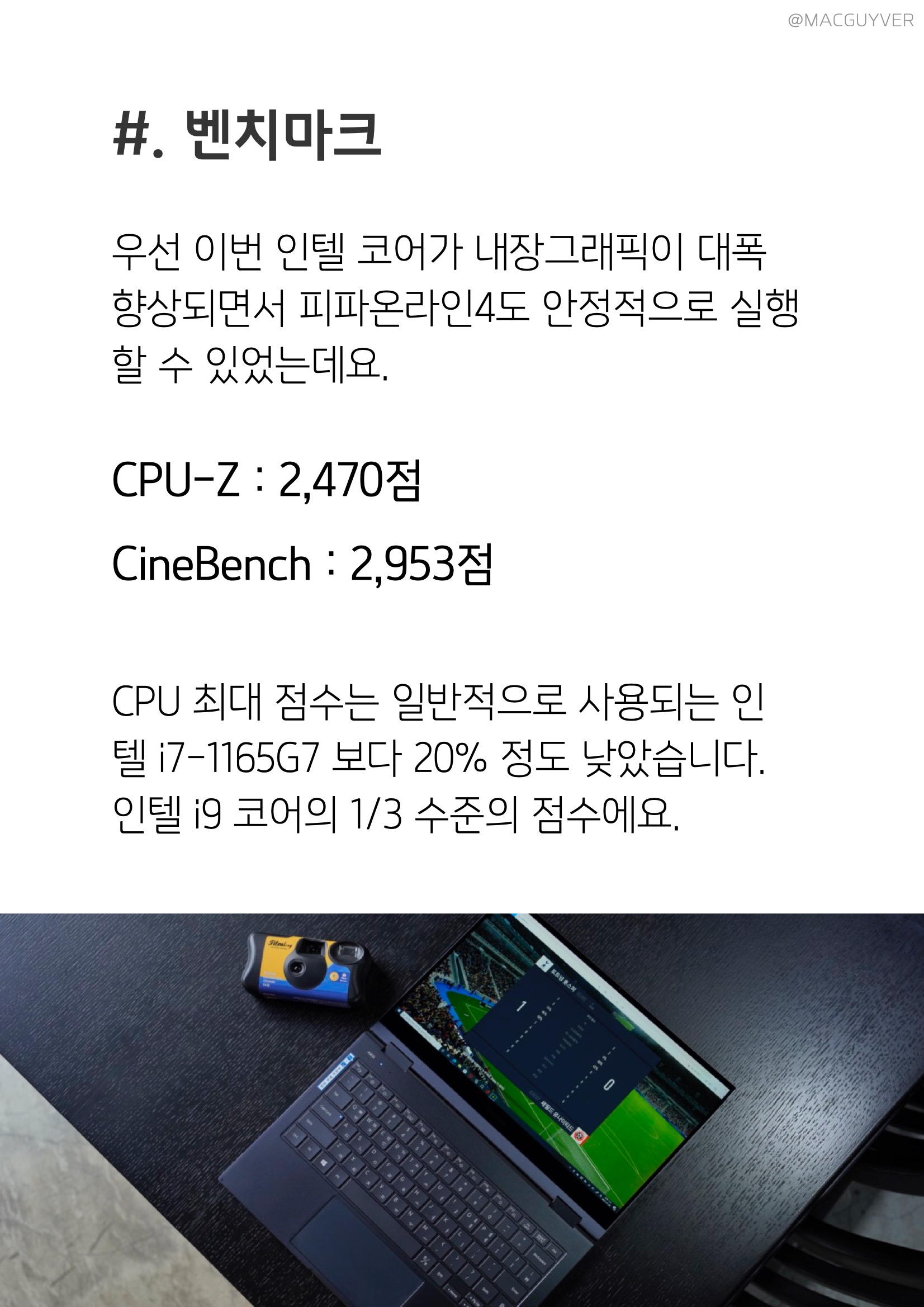 #. 벤치마크우선 이번 인텔 코어가 내장그래픽이 대폭 향상되면서 갤럭시북으로 피파온라인4도 안정적으로 실행할 수 있었는데요.CPU-Z : 2,470점CineBench : 2,953점CPU 최대 점수는 일반적으로 사용되는 인텔 i7-1165G7 보다 20% 정도 낮았습니다. 인텔 i9 코어의 1/3 수준의 점수에요.NT930QDA-K71AZ 3DMARK - FireStrike총점 : 3482점그래픽 : 3893점물리 : 9103점비교)씽크패드 T14s (Ryzen 7 4750U Pro)총점 : 2811점그래픽 : 3094점물리 : 16927점그래도 내장 그래픽 점수는 i7-1165G7이 탑재된 다른 노트북과 같거나 조금 더 높은 편이었어요. 얇은 두께로 잘도 이정도 성능을 내줬네요.PCMARK10 : 4585점비교) 씽크패드 X1 카본 8세대 - 4100점그리고 업무 퍼포먼스는 돈값을 할 정도였습니다. 비즈니스 노트북보다 점수가 높았는데, 아마 삼성노트북 전용 4세대 NVMe가 큰 몫을 한 것 같습니다.EVO 인증을 받기도 했지만, 워낙 체감 성능이 빨라서, 갤럭시북 플렉스에 기대하는 작업을 할 때는 만족도가 높아요. 최대 성능도 생각했던 것만큼 나쁘지 않았습니다.하지만 100만원대 노트북에도 이보다 높은 CPU가 탑재된다는 걸 생각하면, 심리적인 마이너스가 크죠.