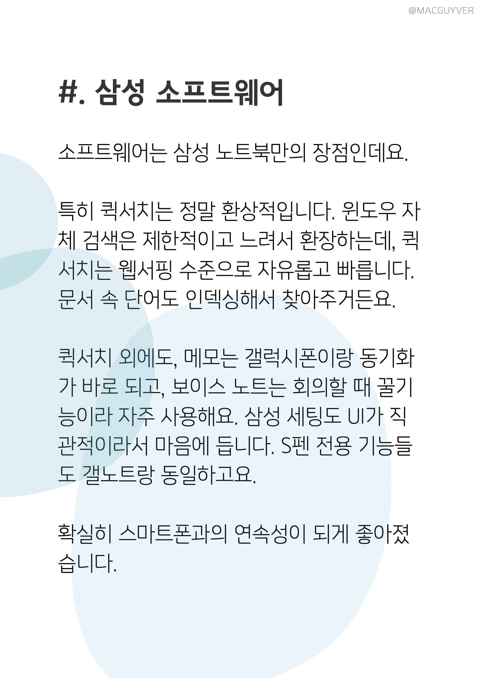 #. 삼성 소프트웨어소프트웨어는 삼성 노트북만의 장점인데요.특히 퀵서치는 정말 환상적입니다. 윈도우 자체 검색은 제한적이고 느려서 환장하는데, 퀵서치는 웹서핑 수준으로 자유롭고 빠릅니다. 문서 속 단어도 인덱싱해서 찾아주거든요.퀵서치 외에도, 메모는 갤럭시폰이랑 동기화가 바로 되고, 보이스 노트는 회의할 때 꿀기능이라 자주 사용해요. 삼성 세팅도 UI가 직관적이라서 마음에 듭니다. 스마트 S펜 전용 기능들도 갤노트랑 동일하고요.확실히 스마트폰과의 연속성이 되게 좋아졌습니다.