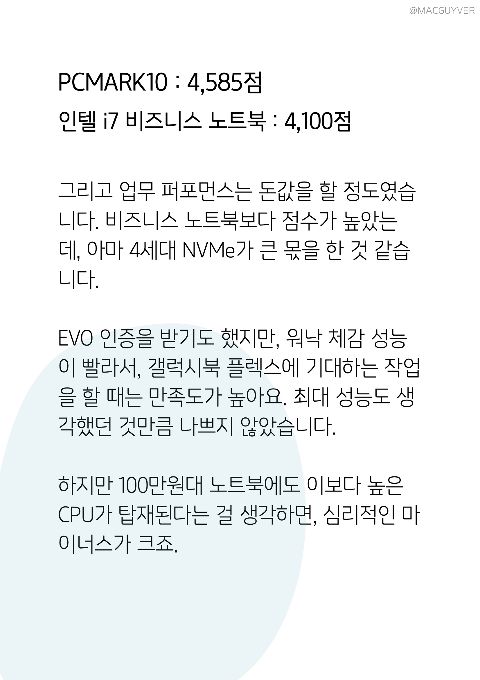 #. 벤치마크우선 이번 인텔 코어가 내장그래픽이 대폭 향상되면서 갤럭시북으로 피파온라인4도 안정적으로 실행할 수 있었는데요.CPU-Z : 2,470점CineBench : 2,953점CPU 최대 점수는 일반적으로 사용되는 인텔 i7-1165G7 보다 20% 정도 낮았습니다. 인텔 i9 코어의 1/3 수준의 점수에요.NT930QDA-K71AZ 3DMARK - FireStrike총점 : 3482점그래픽 : 3893점물리 : 9103점비교)씽크패드 T14s (Ryzen 7 4750U Pro)총점 : 2811점그래픽 : 3094점물리 : 16927점그래도 내장 그래픽 점수는 i7-1165G7이 탑재된 다른 노트북과 같거나 조금 더 높은 편이었어요. 얇은 두께로 잘도 이정도 성능을 내줬네요.PCMARK10 : 4585점비교) 씽크패드 X1 카본 8세대 - 4100점그리고 업무 퍼포먼스는 돈값을 할 정도였습니다. 비즈니스 노트북보다 점수가 높았는데, 아마 삼성노트북 전용 4세대 NVMe가 큰 몫을 한 것 같습니다.EVO 인증을 받기도 했지만, 워낙 체감 성능이 빨라서, 갤럭시북 플렉스에 기대하는 작업을 할 때는 만족도가 높아요. 최대 성능도 생각했던 것만큼 나쁘지 않았습니다.하지만 100만원대 노트북에도 이보다 높은 CPU가 탑재된다는 걸 생각하면, 심리적인 마이너스가 크죠.