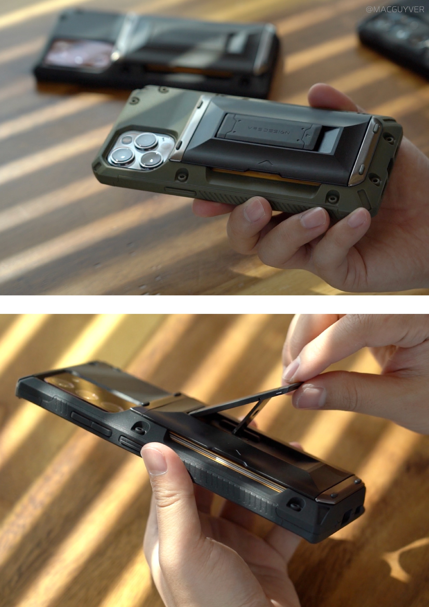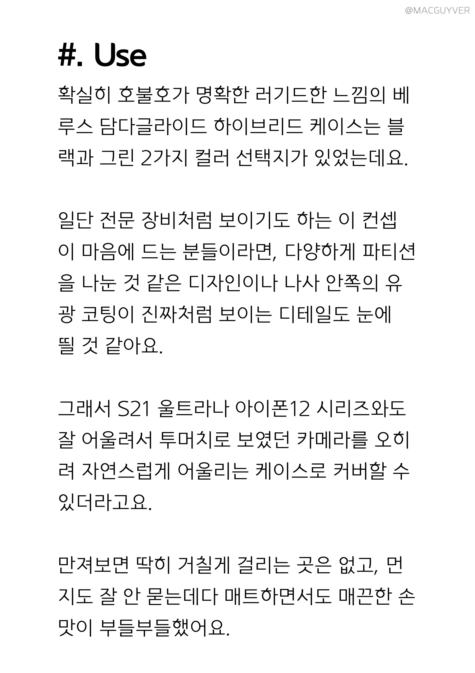 #. 아이폰12 케이스 Use 확실히 호불호가 명확한 러기드한 느낌의 베루스 담다글라이드 하이브리드 케이스는 블랙과 그린 2가지 컬러 선택지가 있었는데요. 일단 전문 장비처럼 보이기도 하는 이 컨셉이 마음에 드는 분들이라면, 다양하게 파티션을 나눈 것 같은 디자인이나 나사 안쪽의 유광 코팅이 진짜처럼 보이는 디테일도 눈에 띌 것 같아요. 그래서 S21 울트라나 아이폰12 시리즈와도 잘 어울려서 투머치로 보였던 카메라를 오히려 자연스럽게 어울리는 케이스로 커버할 수 있더라고요. 만져보면 딱히 거칠게 걸리는 곳은 없고, 먼지도 잘 안 묻는데다 매트하면서도 매끈한 손맛이 부들부들했어요.