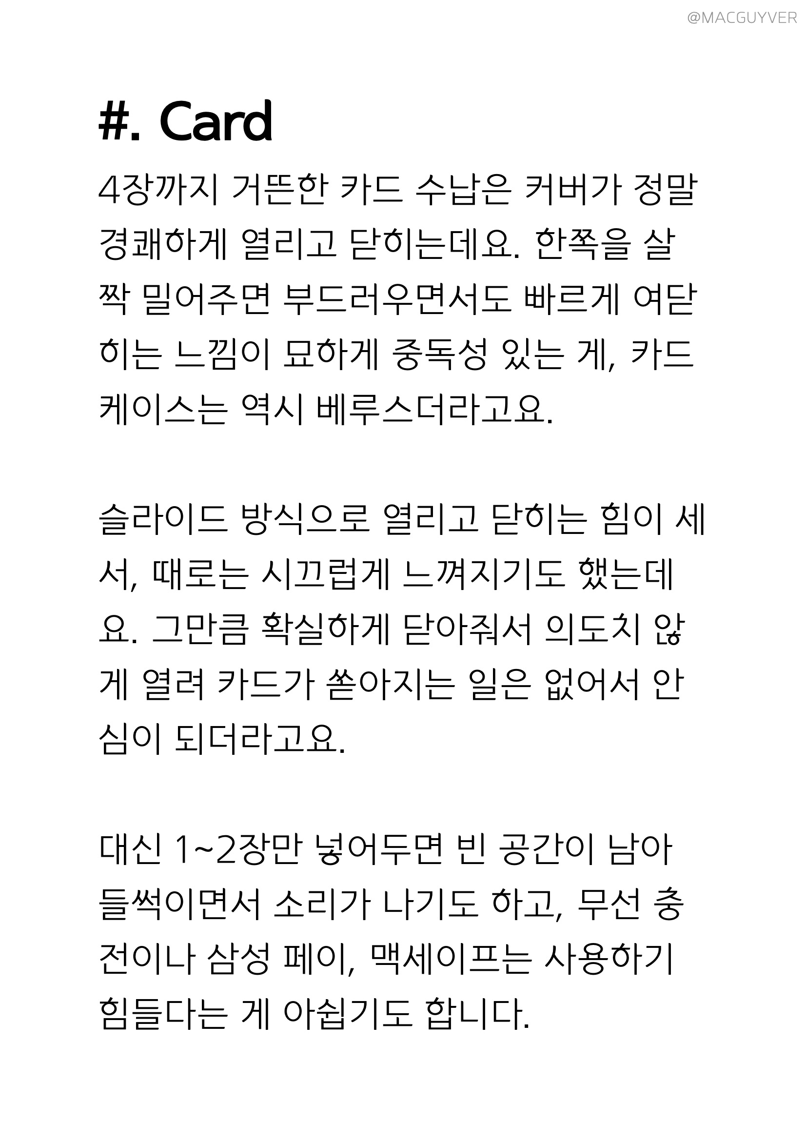 #. 아이폰 12 카드 케이스 Card 4장까지 거뜬한 카드 수납은 커버가 정말 경쾌하게 열리고 닫히는데요. 한쪽을 살짝 밀어주면 부드러우면서도 빠르게 여닫히는 느낌이 묘하게 중독성 있는 게, 카드케이스는 역시 베루스더라고요. 슬라이드 방식으로 열리고 닫히는 힘이 세서, 때로는 시끄럽게 느껴지기도 했는데요. 그만큼 확실하게 닫아줘서 의도치 않게 열려 카드가 쏟아지는 일은 없어서 안심이 되더라고요. 대신 1~2장만 넣어두면 빈 공간이 남아 들썩이면서 소리가 나기도 하고, 무선 충전이나 삼성 페이, 아이폰12 케이스로 맥세이프는 사용하기 힘들다는 게 아쉽기도 합니다. 이전 모델과 다르게 상하단 모두 메탈 마감이라 내구성도 좋아지고 손맛도 괜찮았는데요. 제가 느끼기에는 하단부에 튀어나온 이 부분이 그립감에서 마이너스가 되기도 하더라고요. 결제 카드나 신분증, 멤버십 카드와 사원증과 같이 현금 없이 카드 수납이 필요하신 분들에게 유용한 구성인 것 같습니다.