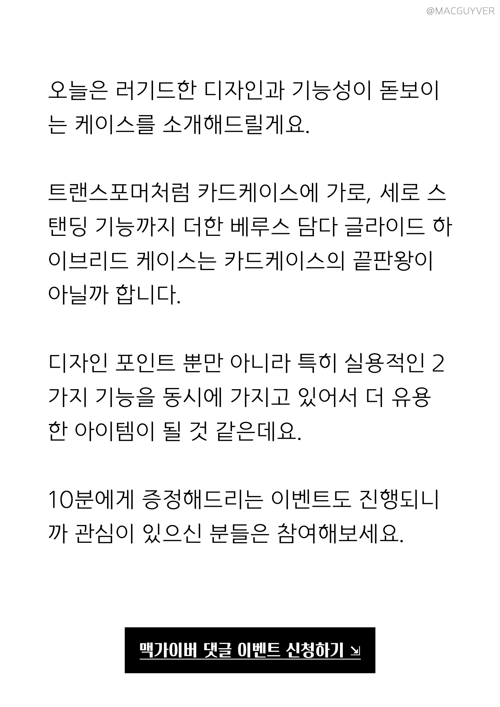 오늘은 러기드한 디자인과 기능성이 돋보이는 케이스를 소개해드릴게요. 트랜스포머처럼 카드케이스에 가로, 세로 스탠딩 기능까지 더한 베루스 담다 글라이드 하이브리드 케이스는 카드케이스의 끝판왕이 아닐까 합니다. 10분에게 증정해드리는 이벤트도 진행되니까 관심이 있으신 분들은 참여해보세요. 아이폰12 케이스, 아이폰12프로 케이스외에 갤럭시 모델들도 선택하실 수 있습니다.