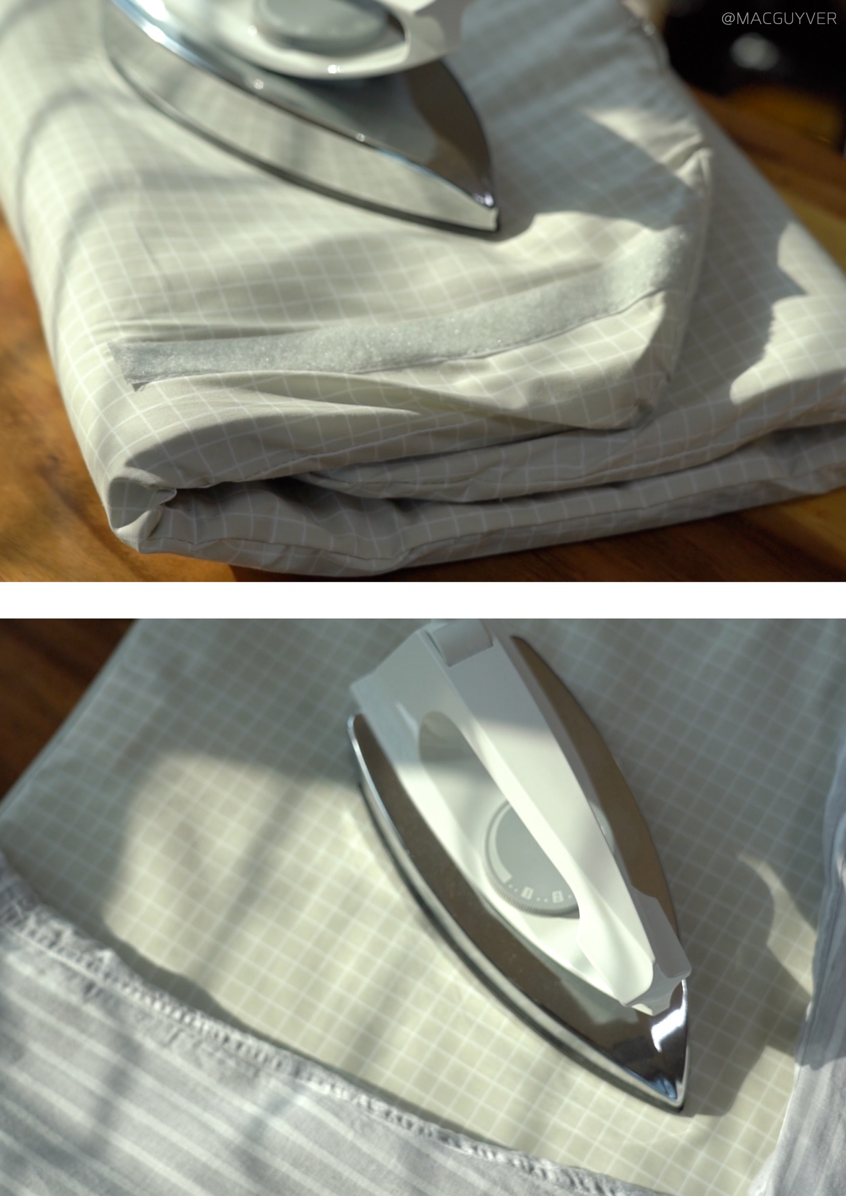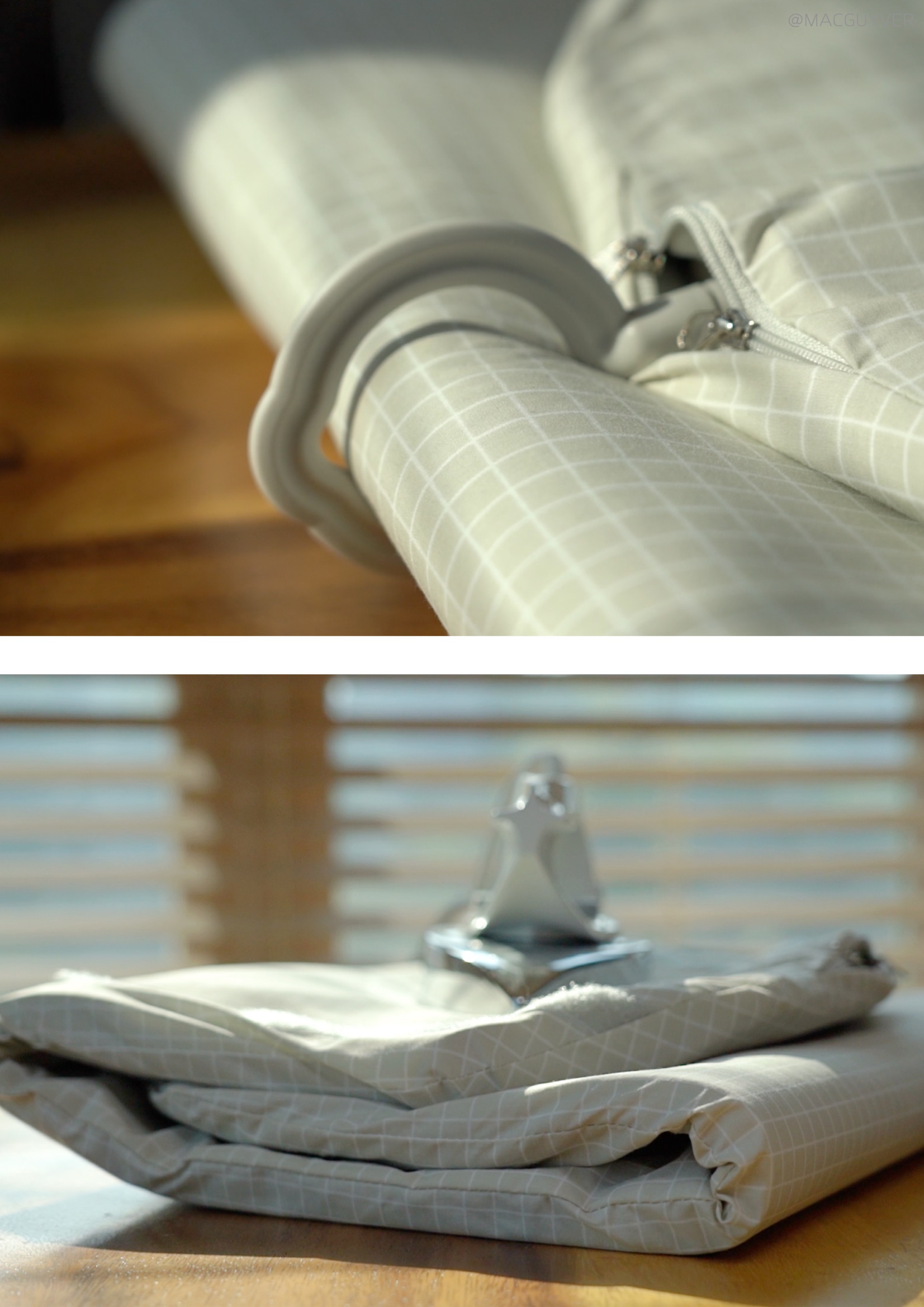 보만 다림질판의 세 번째 장점은 컴팩트한 디자인이에요. 스탠드형 다리미 다리미판을 옷장에 걸어서 보관하면 별도의 공간이 없어도 되고, 넣고 빼기도 좋더라고요. 물론 걸어둘 공간이 없다면 접어서 보관하는 것도 가능합니다. 이렇게 3단으로 접어서 옷걸이에 접힌 부분을 쏙 넣어주면 쉽게 풀리지도 않죠. 또 보만 스팀다리미 매트 은은한 컬러와 패턴의 겉면은 이쁘기만 한 게 아니라 물에 쉽게 젖지도 않고, 건식 다리미에도 쉽게 그을리지 않는 재질이라 안심이 되었어요.