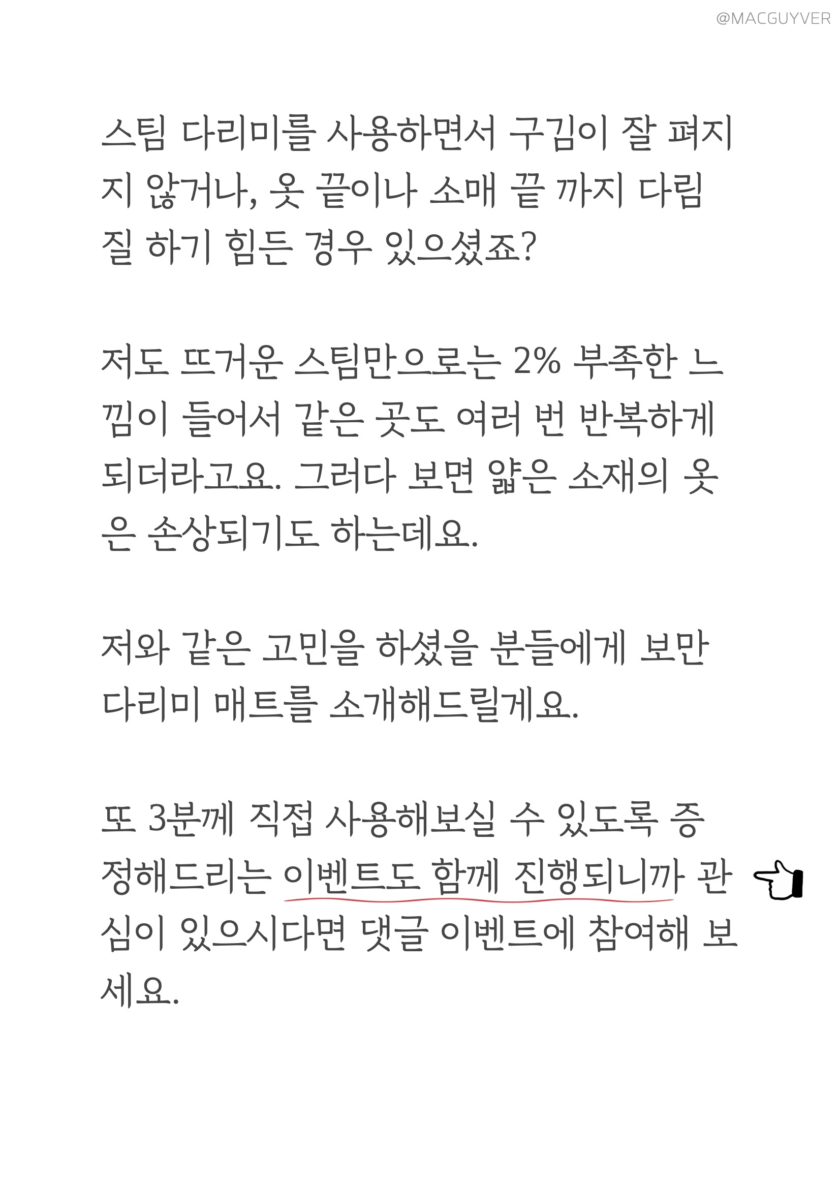 와이셔츠 다림질을 할 때 스팀 다리미를 사용하면서 구김이 잘 펴지지 않거나, 옷 끝이나 소매 끝 까지 다림질 하기 힘든 경우 있으셨죠? 저도 뜨거운 스팀만으로는 2% 부족한 느낌이 들어서 같은 곳도 여러 번 반복하게 되더라고요. 그러다 보면 얇은 소재의 옷은 손상되기도 하는데요. 저와 같은 고민을 하셨을 분들에게, 보만 다리미 매트를 소개해드릴게요. 또 3분께 직접 사용해보실 수 있도록 보만 다리미판 IM3290을 증정해드리는 이벤트도 함께 진행되니까 관심이 있으시다면 댓글 이벤트에 참여해 보세요.