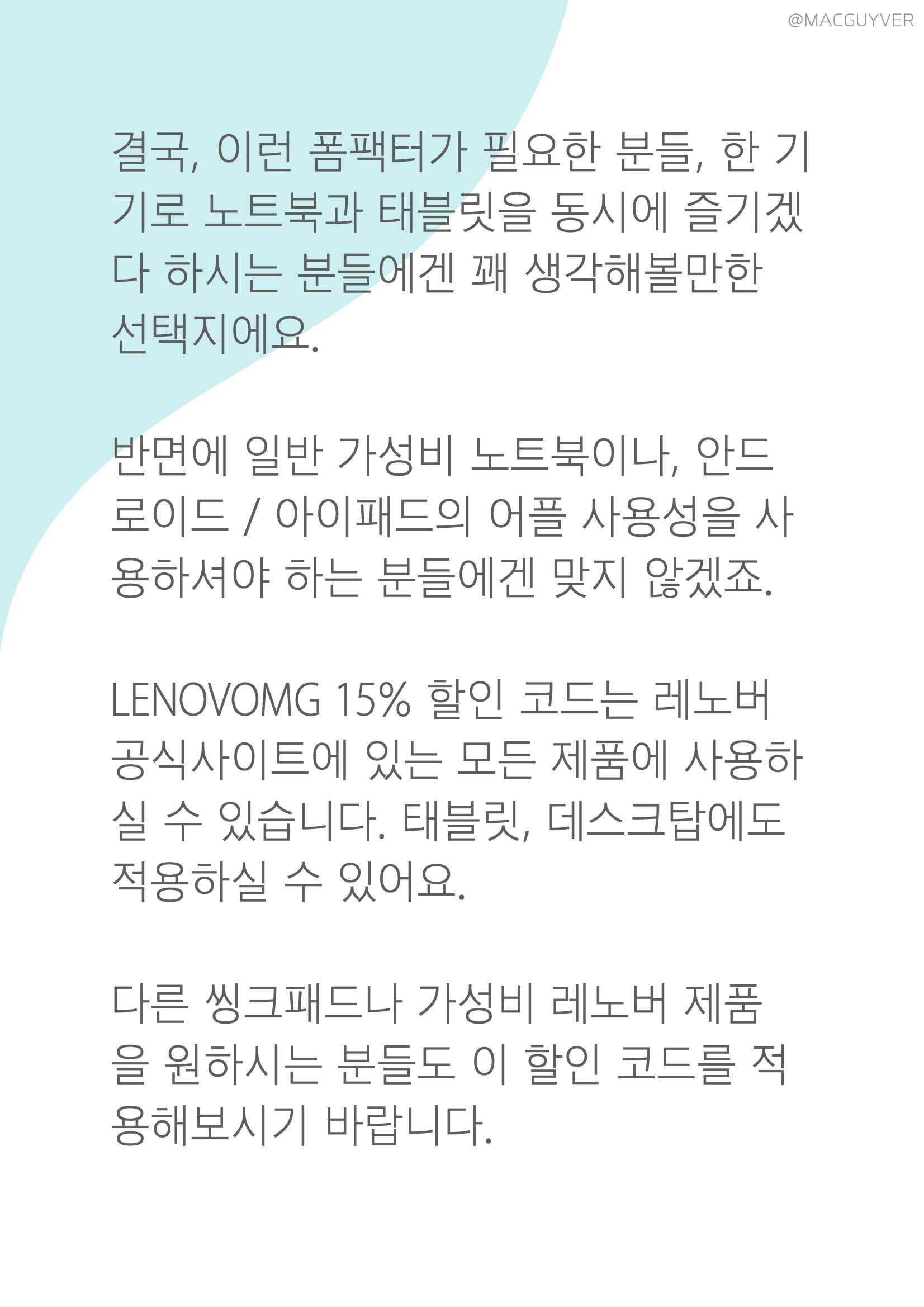 #. 평가 제대로된 2in1 PC 플랫폼에 씽크패드의 내구성과 키보드가 추가된 건 차별화된 장점이 맞는 것 같습니다. 씽크패드 X12 Detachable도 12개의 군용 등급을 충족하고 200개 이상의 품질 검사를 통과했다고 하거든요. 게다가 카본이라, 찍힘이나 스크래치도 잘 안나네요. 하지만 이 2in1 노트북 폼팩터가 공짜는 아니라는 게 문제죠. 결국, 이런 형태의 2in1 태블릿이 필요한 분들, 한 기기로 노트북과 태블릿을 동시에 즐기겠다 하시는 분들에겐 꽤 생각해볼만한 선택지에요. 반면에 일반 가성비 노트북이나 안드로이드 태블릿, 아이패드가 필요하신 대부분의 분들에겐 맞지 않겠죠. 앞서 말씀드린 할인 코드는 레노버 공식사이트에 있는 모든 제품에 사용하실 수 있으니까, 다른 레노버 가성비 노트북을 구입하실 때도 사용해보실 수 있습니다.