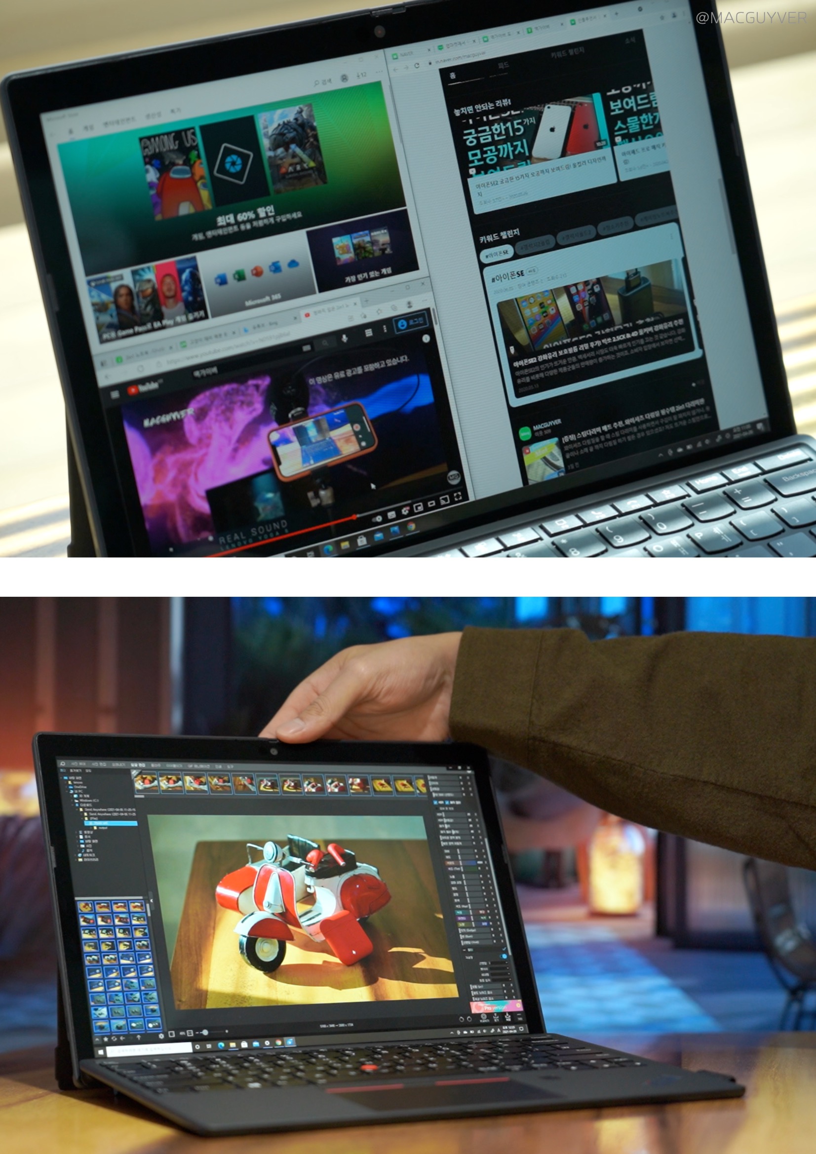 #. 2in1 사용성 기본이 윈도우 태블릿이니까, 태블릿으로써의 사용성은 당연히 완벽해요. 지문 방지 코팅이 되어 있어서 터치감도 좋고, 씽크패드라 반응속도도 준수합니다. 특별히 좋은 점은, 이 자체 거치대인데요. 키보드가 없을 때 특히 빛을 발합니다. 영상이나 웹서핑하기엔 당연히 좋고, 튼튼해서 펜 사용하기도 좋고, 가끔 가상 키보드를 쓰기에도 좋거든요. 대신 운영체제가 윈도우라서, 다른 일반 태블릿들과 사용성에서 차이가 있죠. 업무용 노트북으로써는 화면이 12인치로 작다보니까, 멀티태스킹할 때 조금 답답한 감이 있어요. 세로 비율이 길어서 좀 낫긴 한데, 베젤이 두껍다보니 그런 거 같습니다. 그런데, 키보드가 진짜 깡패네요. 씽크패드 노트북처럼 깊진 않지만, 키감은 거의 흡사해요. 덕분에 키보드를 붙이면, 거의 12인치 윈도우 노트북 그 자체입니다. 태블릿은 태블릿 그 자체로, 노트북은 노트북 그 자체로 사용할 수 있다는 게 확실한 차별점이에요. 이게 진짜 2in1 PC라는 생각이 듭니다. 터치로 화면을 깨울 수 없는 게 가장 큰 흠이네요. 그리고 사용성은 씽크패드 노트북과 거의 동일하지만, 부피가 작아서 쿨링이나 최대 성능 면에서 한계가 있어요.