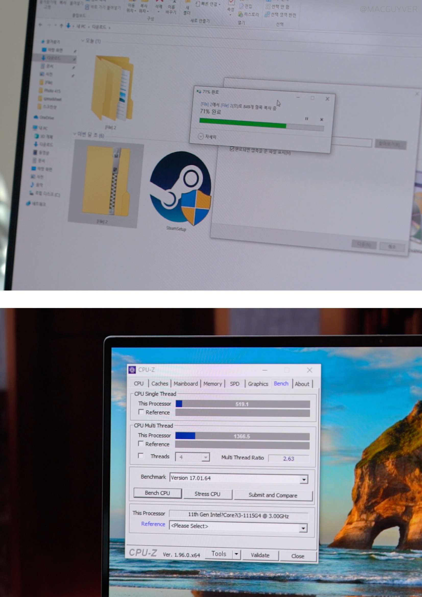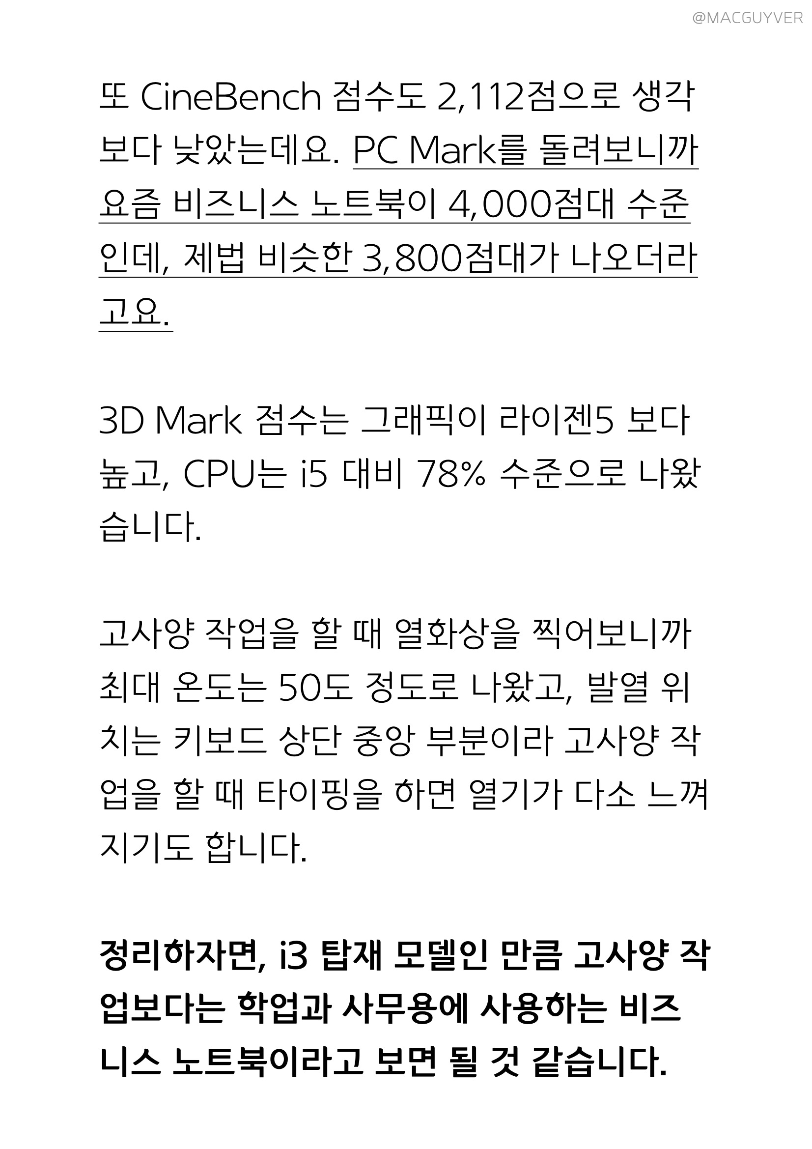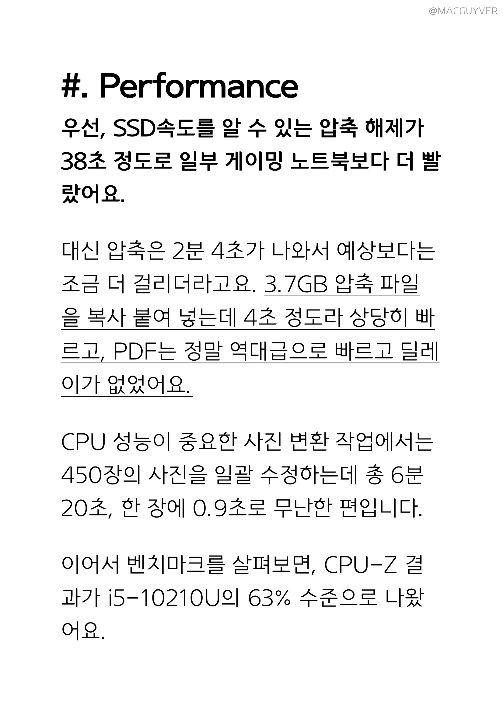 #. 강의용노트북 Performance 성능에 대한 이야기도 중요한데요. 우선, SSD 속도를 알 수 있는 압축 해제가 38초 정도로 일부 게이밍 노트북보다 더 빨랐어요. 대신 압축은 2분 4초가 나와서 예상보다는 조금 더 걸리더라고요. 3.7GB 압축 파일을 복사 붙여 넣는데 4초 정도라 상당히 빠르고, PDF는 정말 역대급으로 빠르고 딜레이가 없었어요. CPU 성능이 중요한 사진 변환 작업에서는 450장의 사진을 일괄 수정하는데 총 6분 20초, 한 장에 0.9초로 무난한 편입니다. 이어서 벤치마크를 살펴보면, CPU-Z 결과가 i5-10210U의 63% 수준으로 나왔어요. 또 CineBench 점수도 2,112점으로 생각보다 낮았는데요. PC Mark를 돌려보니까 요즘 비즈니스 노트북이 4,000점대 수준인데, 삼성노트북도 제법 비슷한 3,800점 대가 나오더라고요. 3D Mark 점수는 그래픽이 라이젠5 보다 높고, CPU는 i5 대비 78% 수준으로 나왔습니다. 고사양 작업을 할 때 열화상을 찍어보니까 최대 온도는 50도 정도로 나왔고, 발열 위치는 키보드 상단 중앙 부분이라 고사양 작업을 할 때 타이핑을 하면 열기가 다소 느껴지기도 합니다. 정리하자면, i3 탑재 모델인 만큼 고사양 작업보다는 학업과 사무용에 사용하는 비즈니스 노트북이라고 보면 될 것 같습니다.