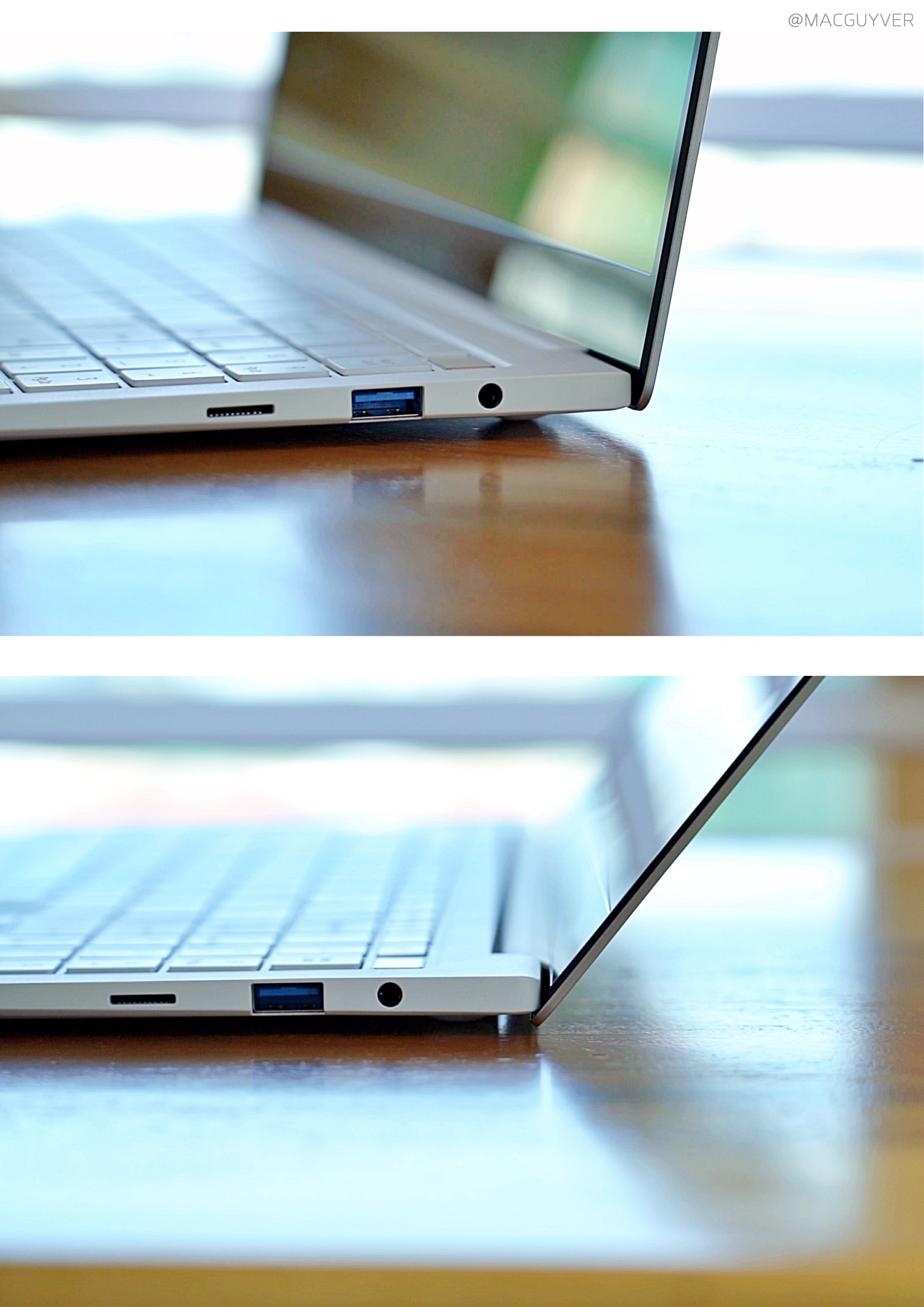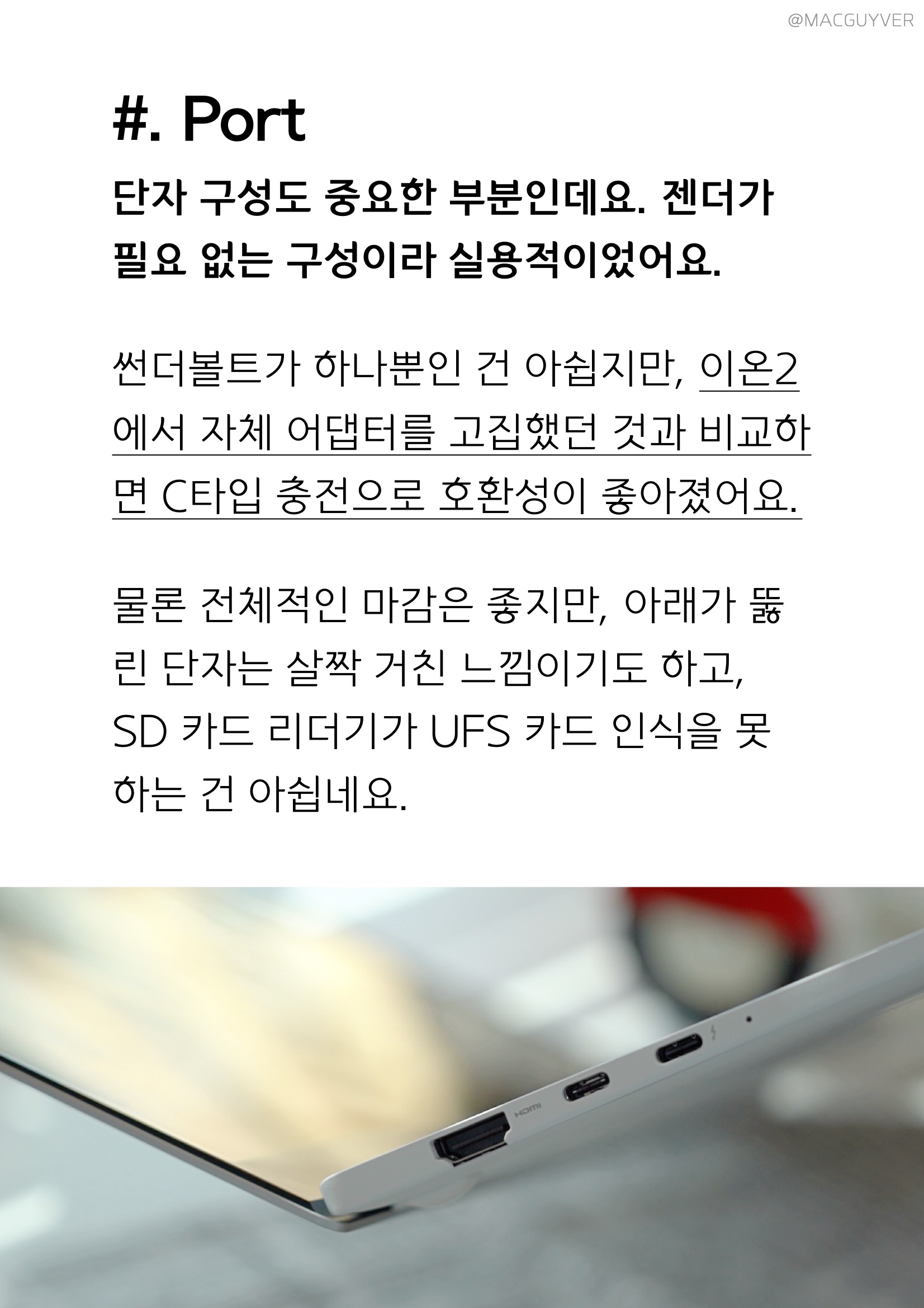 #. 비즈니스노트북 Port 단자 구성도 중요한 부분인데요. 젠더가 필요 없는 구성이라 실용적이었어요. 썬더볼트가 하나뿐인 건 아쉽지만, 이온2에서 자체 어댑터를 고집했던 것과 비교하면 C타입 충전으로 호환성이 더 좋아졌어요. 물론 전체적인 마감은 좋지만, 아래가 뚫린 단자는 살짝 거친 느낌이기도 하고, SD 카드 리더기가 UFS 카드 인식을 못 하는 건 아쉽네요.