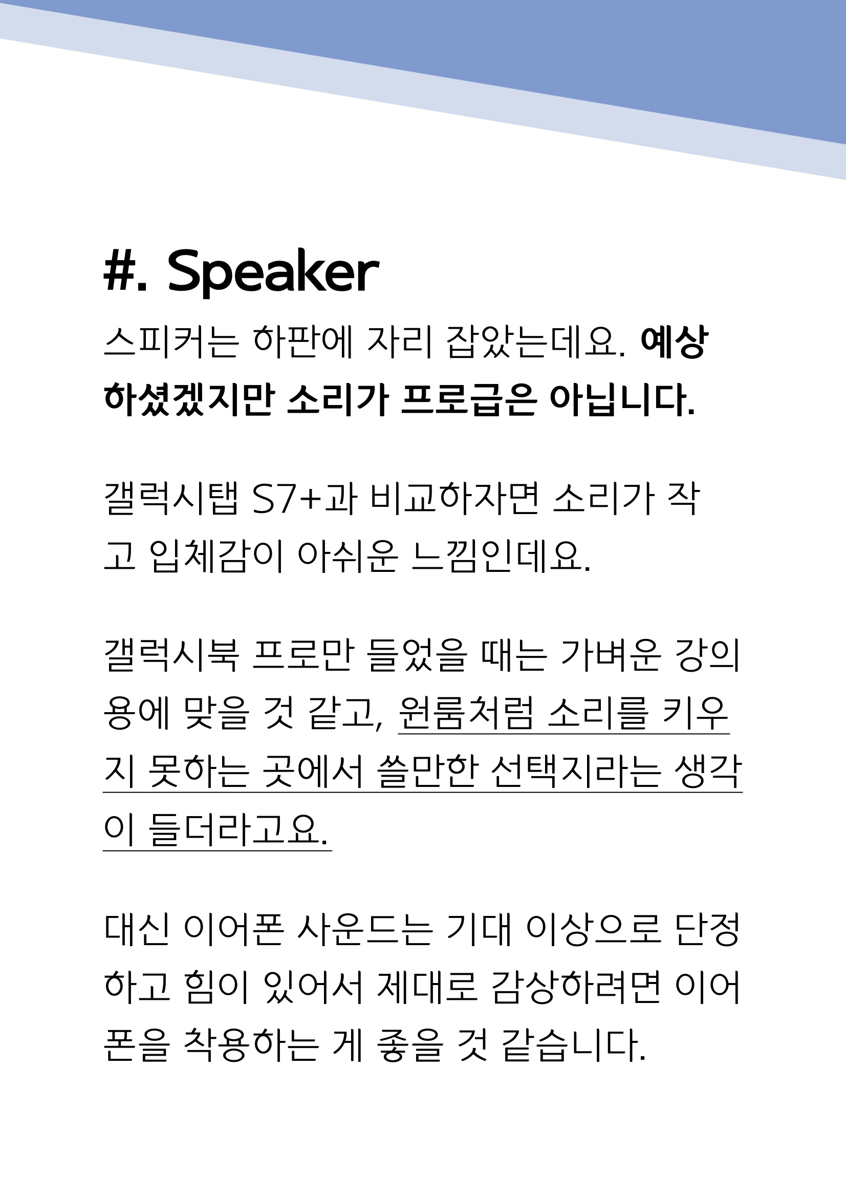 #. 직장인노트북 Speaker 스피커는 하판에 자리 잡았는데요. 예상하셨겠지만 소리가 프로급은 아닙니다. 갤럭시탭S7+과 비교하자면 소리가 작고 입체감이 아쉬운 느낌인데요. 노트북추천 갤럭시북 프로만 들었을 때는 가벼운 강의용에 맞을 것 같고, 원룸처럼 소리를 키우지 못하는 곳에서 대학생노트북, 직장인노트북, 사무용노트북, 강의용노트북으로 쓸만한 선택지라는 생각이 들더라고요. 대신 이어폰 사운드는 기대 이상으로 단정하고 힘이 있어서 제대로 감상하려면 이어폰을 착용하는 게 좋을 것 같습니다.