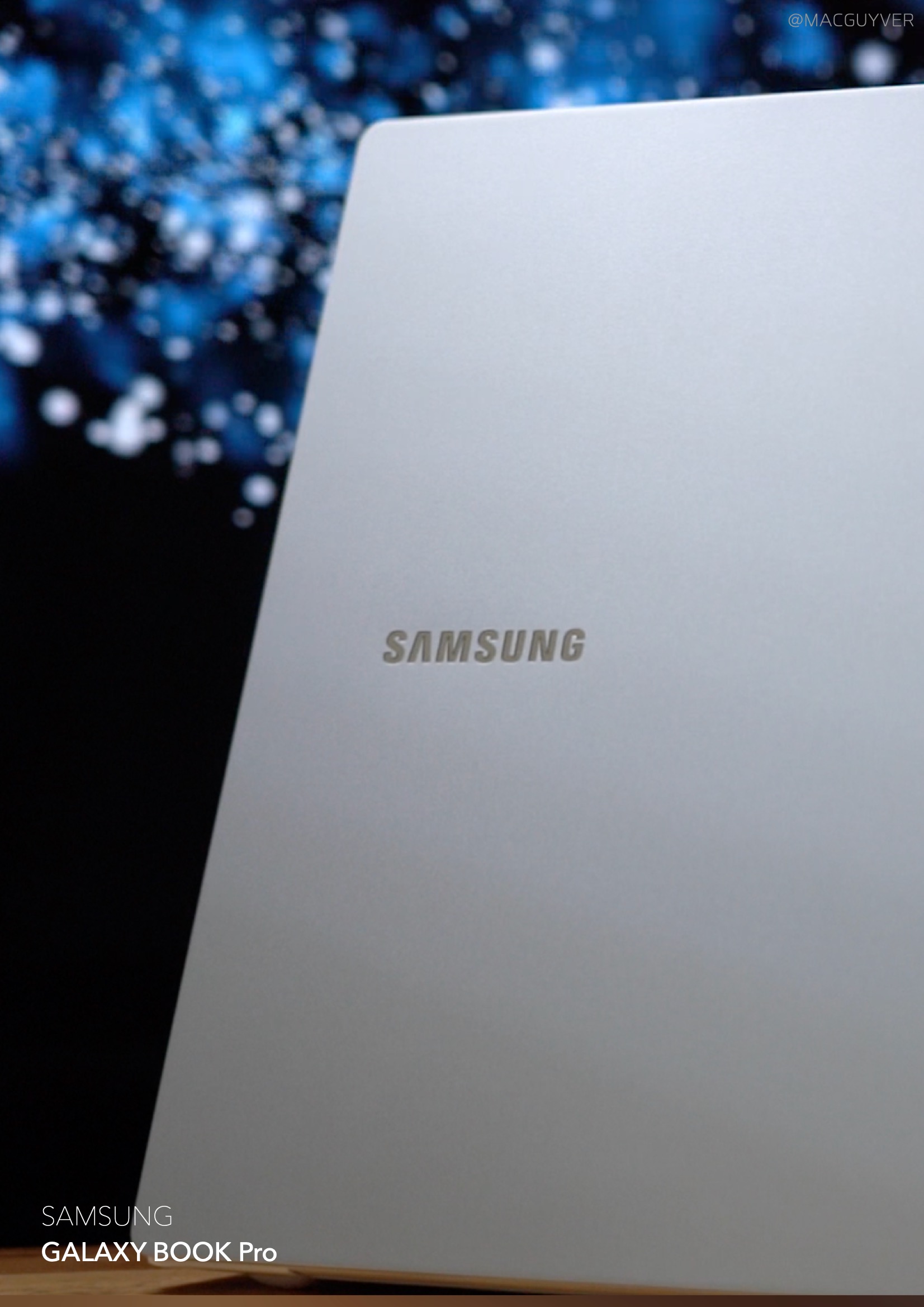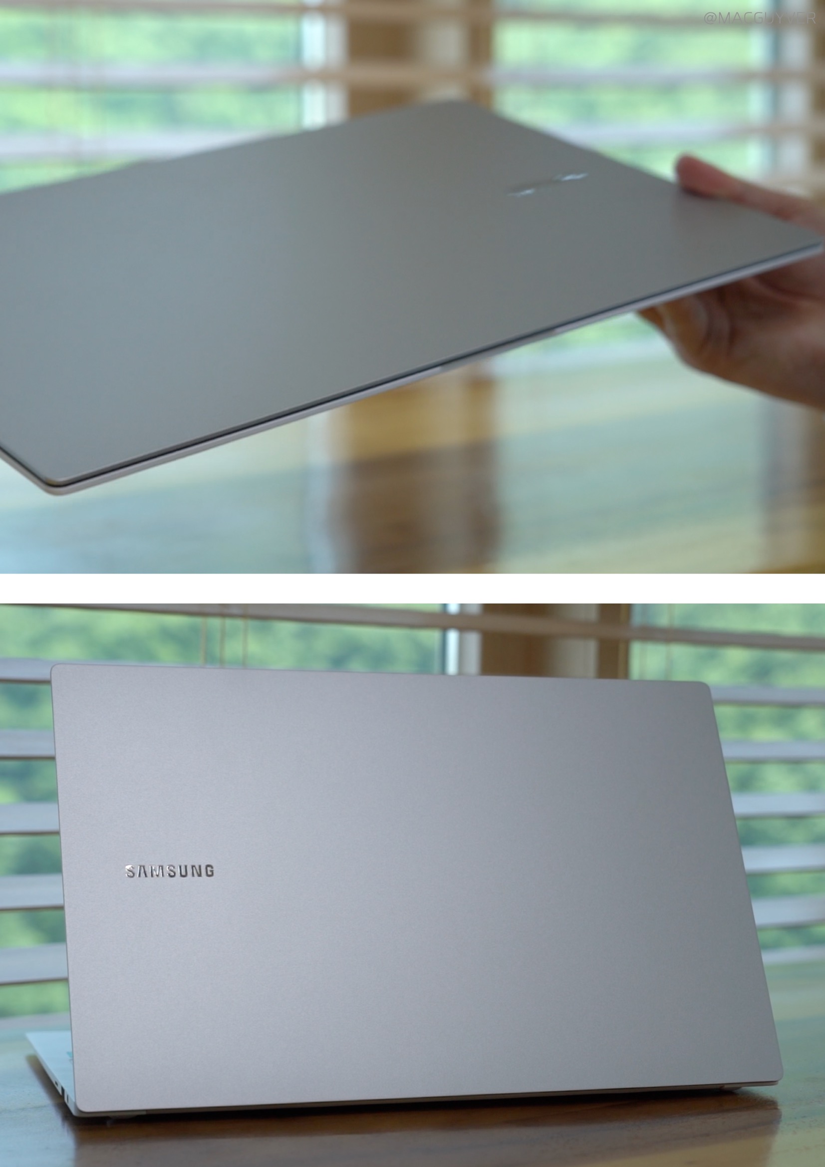#. 갤럭시북프로 Design 투톤 디자인은 가벼워 보이기도 하고 너무 무난해서 호불호는 있을 것 같은데, 보기에는 확실히 얇아 보이더라고요. 들어봐도 정말 가벼운 데다, 어댑터까지 작아져서 휴대성은 훨씬 좋아졌어요. 재질감은 상판이 더 부드럽고 팜레스트는 약하긴 하지만 손맛은 매트한 편인데요. 전작에 비해 로고가 작아져서 더 슬림 하고 날렵해 보이는 것 같습니다. 갤럭시북프로 힌지는 이온2처럼 상판이 내려가지 않고 깔끔하게 열려서 흠집 우려가 없었어요. 특별하진 않고 실용적인 느낌인데다 한 손으로 부드럽고 가볍게 열려서 편하더라고요.